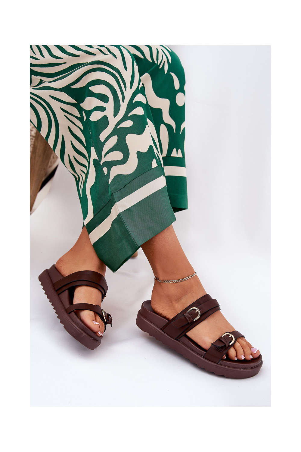 Dámské pantofle s platformou Ze zlaté barvymi s přezkamimi hnědá Wernone