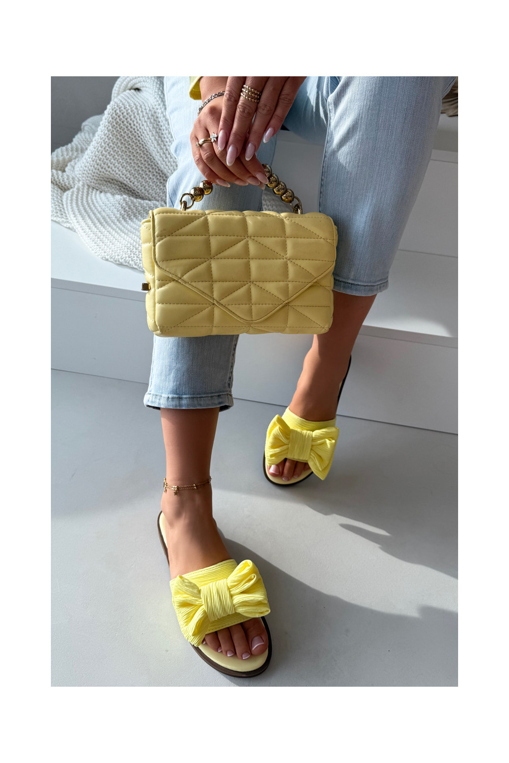 Dámské pantofle s širokými podpatky se stuhami Žluté Amivelle