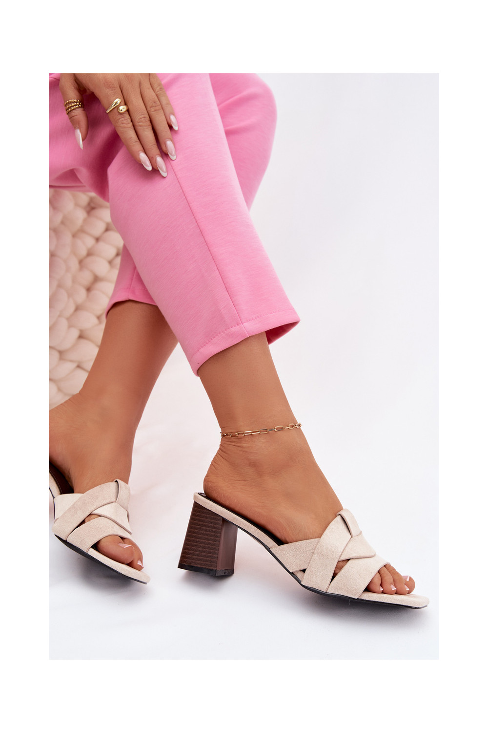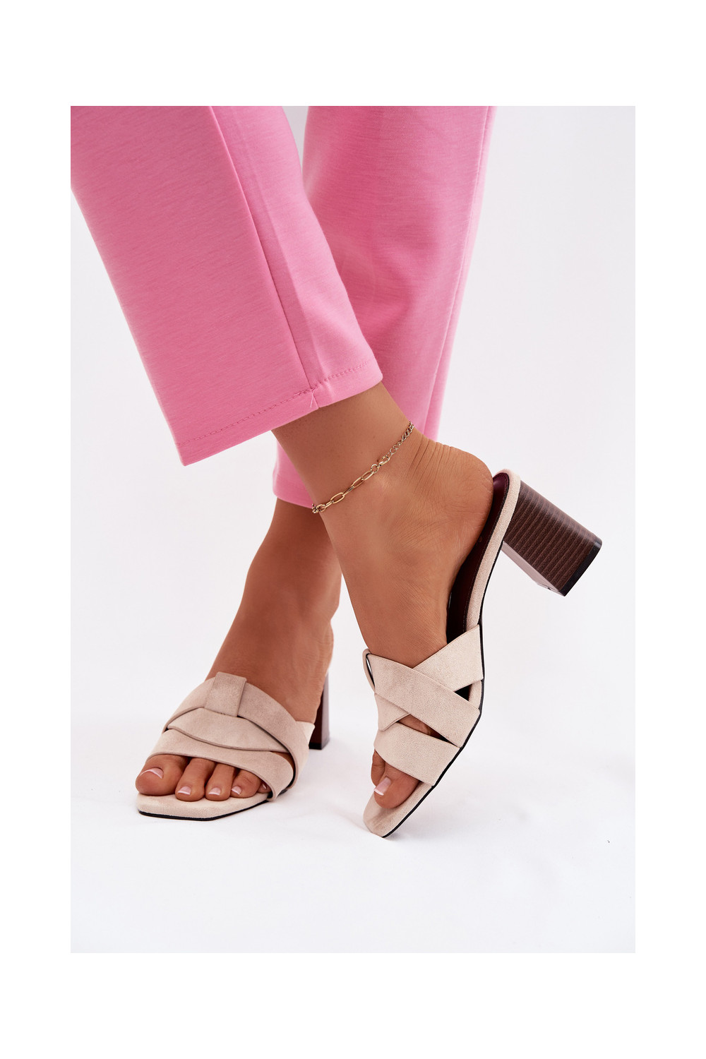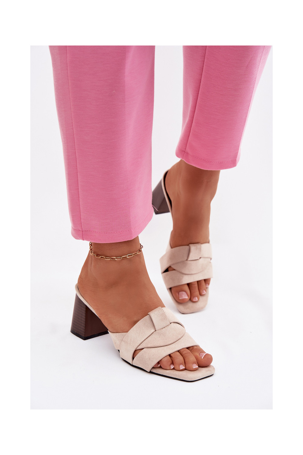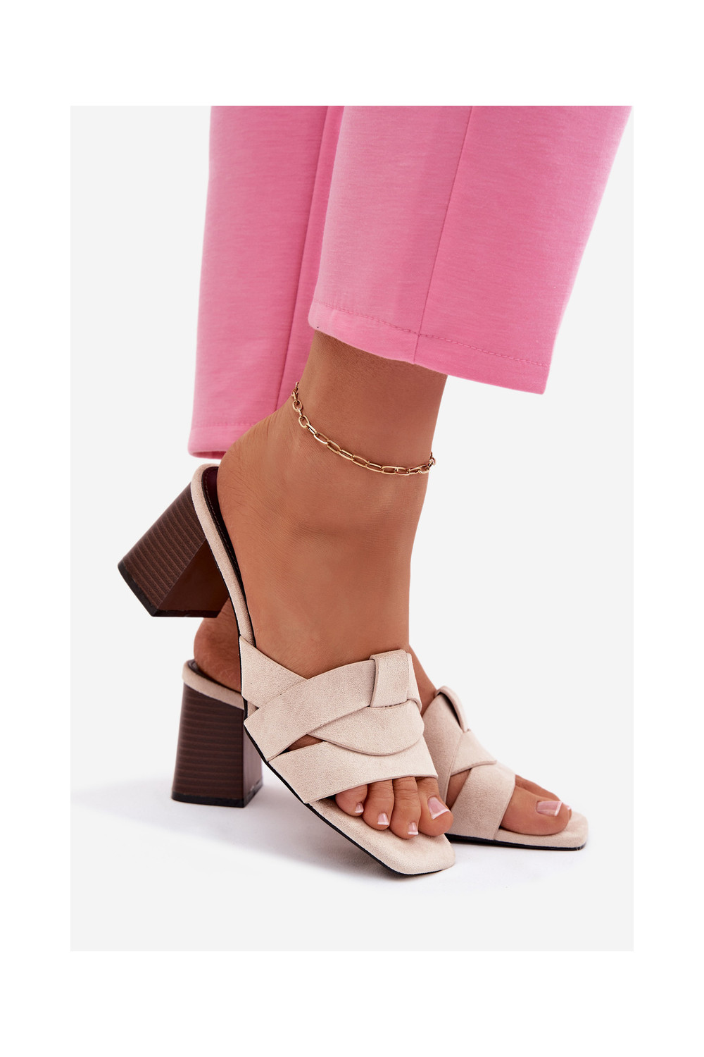 Dámské pantofle s podpatky s pruhy z eko semišeowe béžové Corivelle