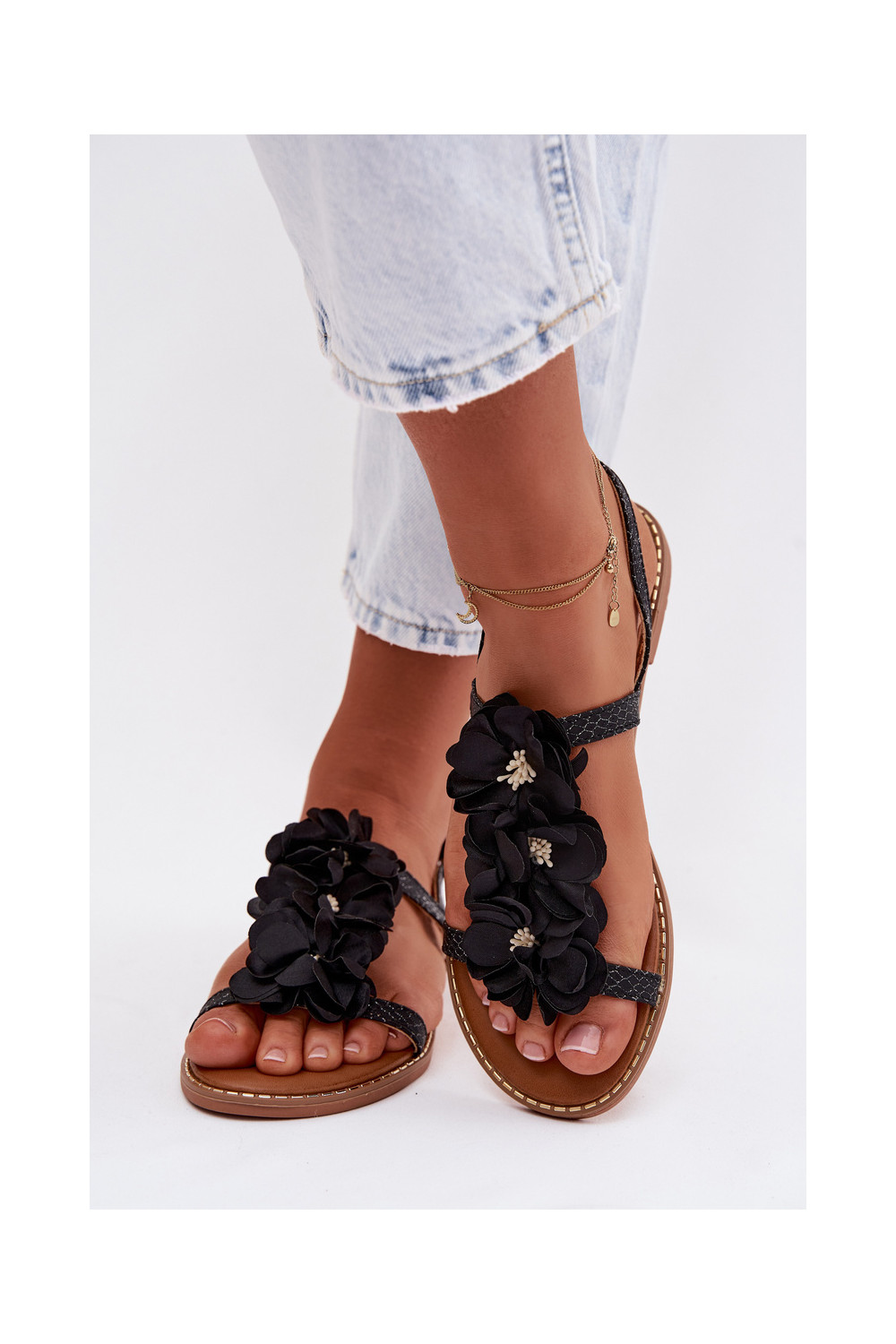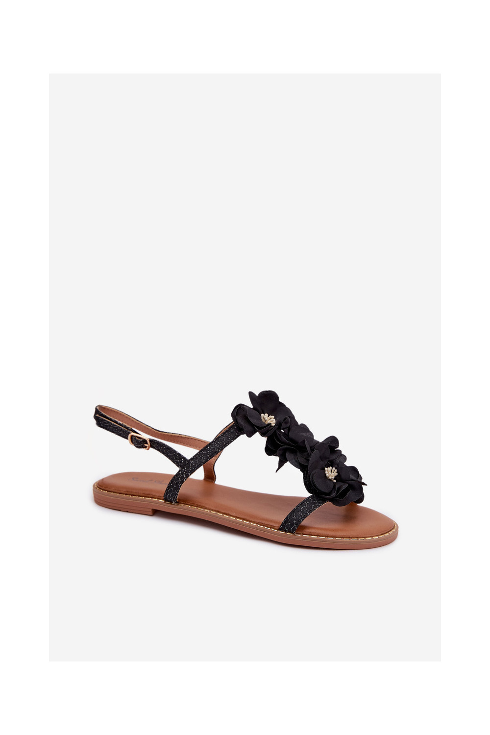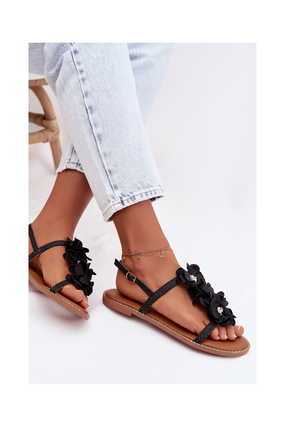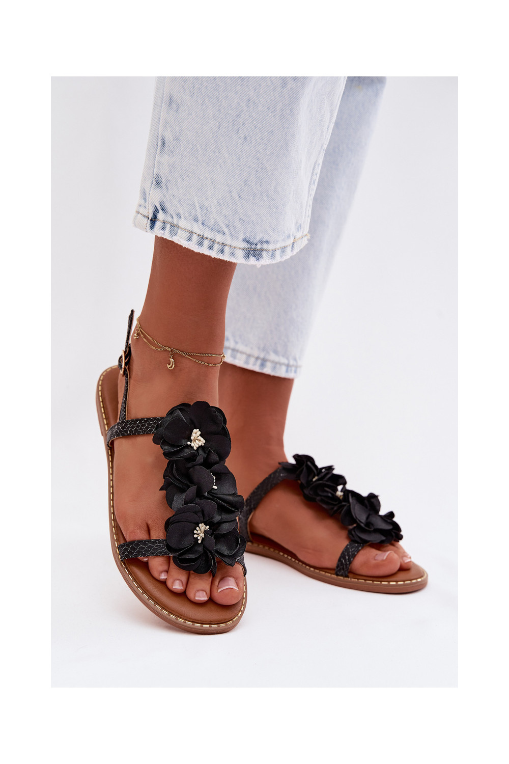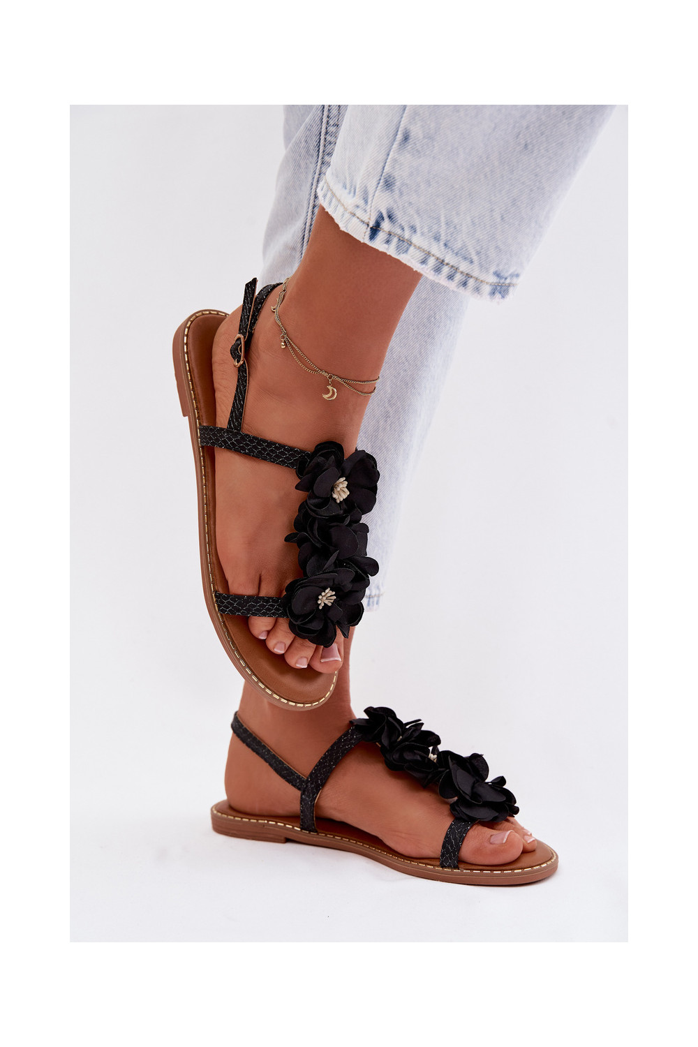 Ploché dámské sandály s květinovými motivykami Černé Noemia