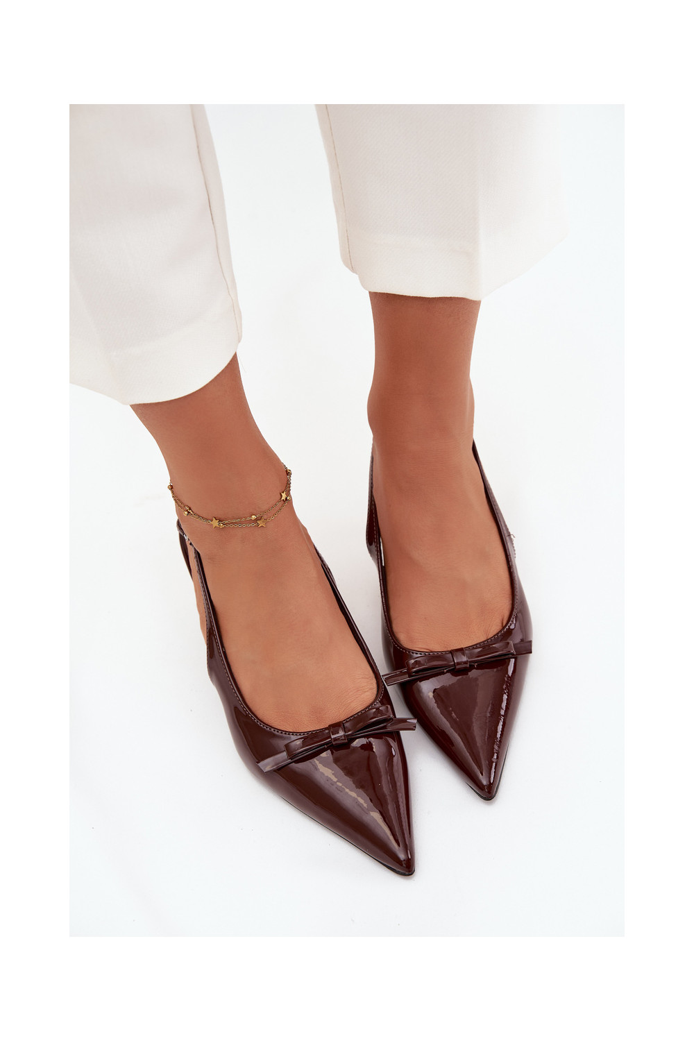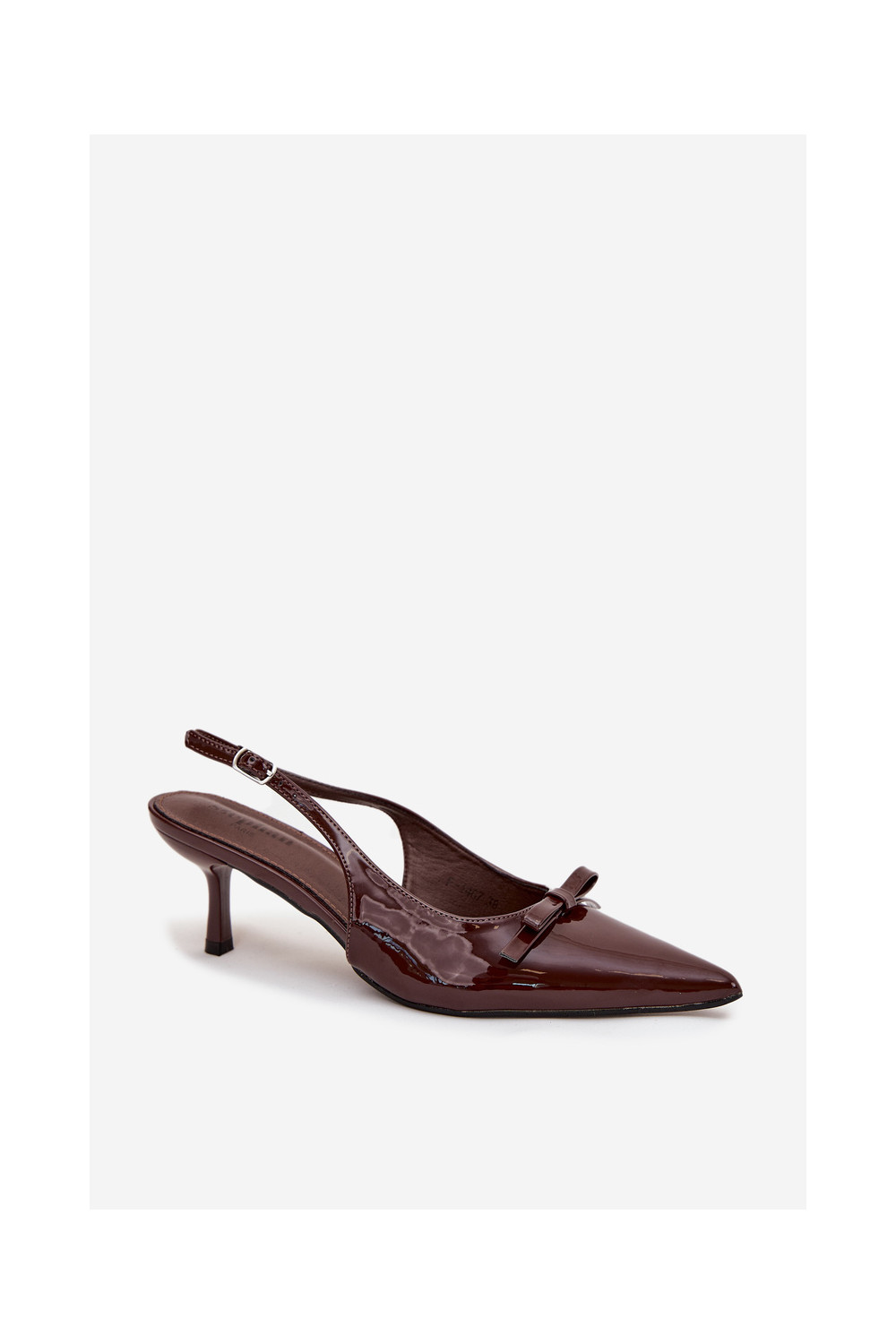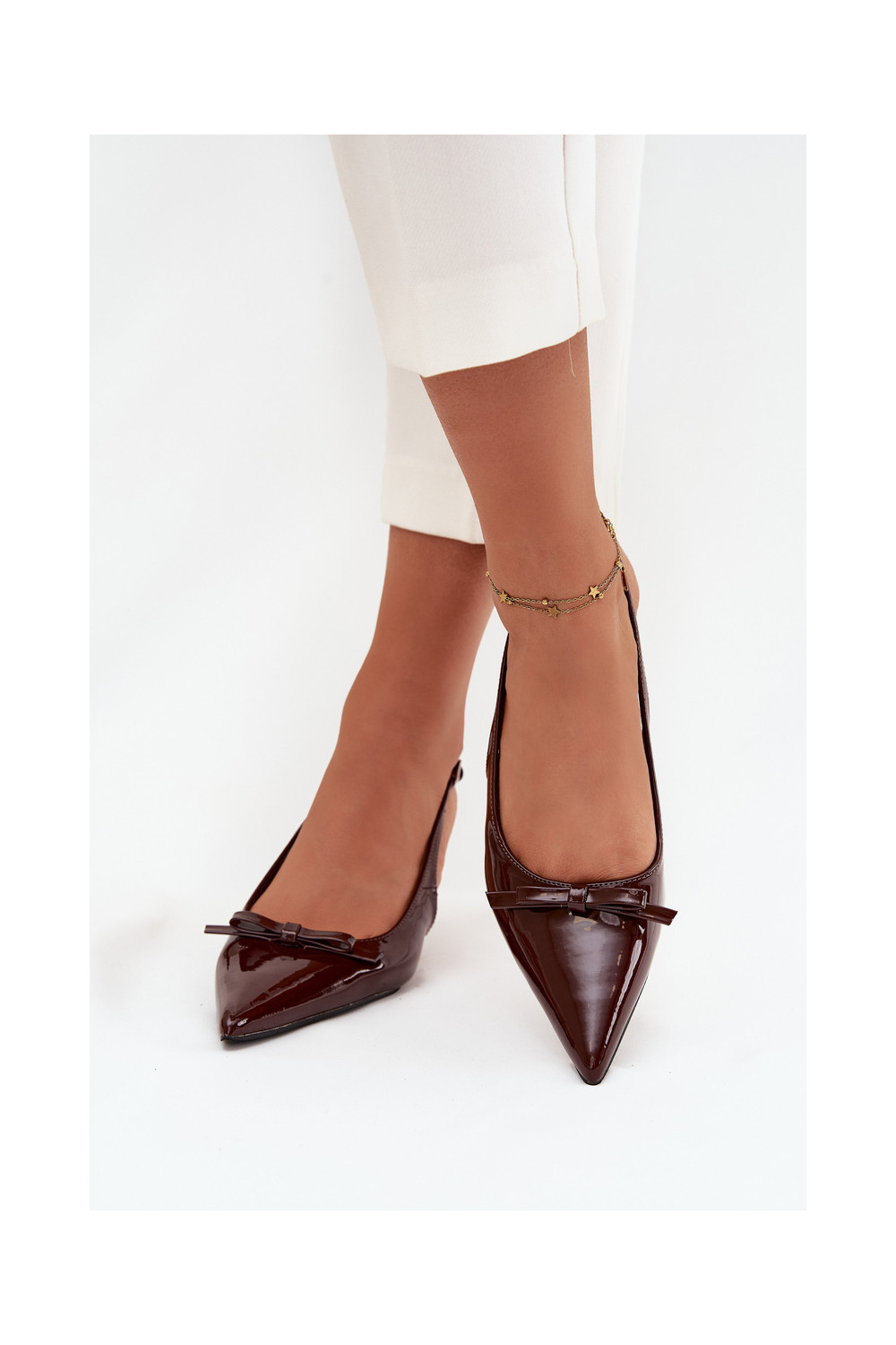 s efektem laku Obuv s tenkými podpatky se stuhami Czekoladowe Olvena