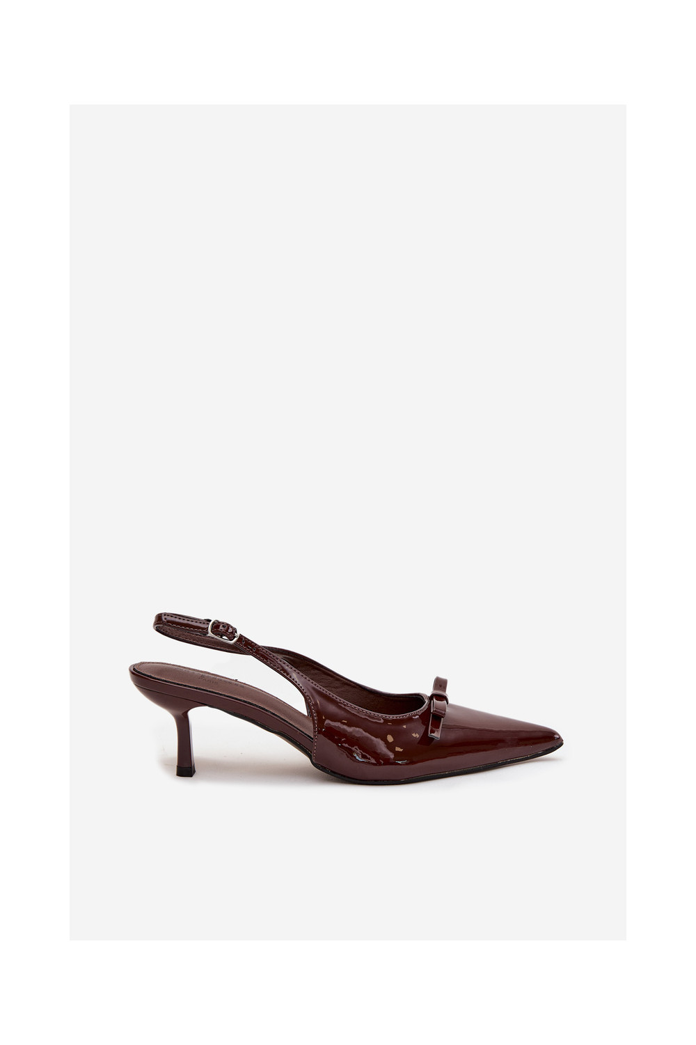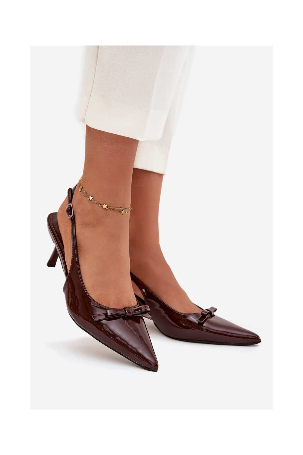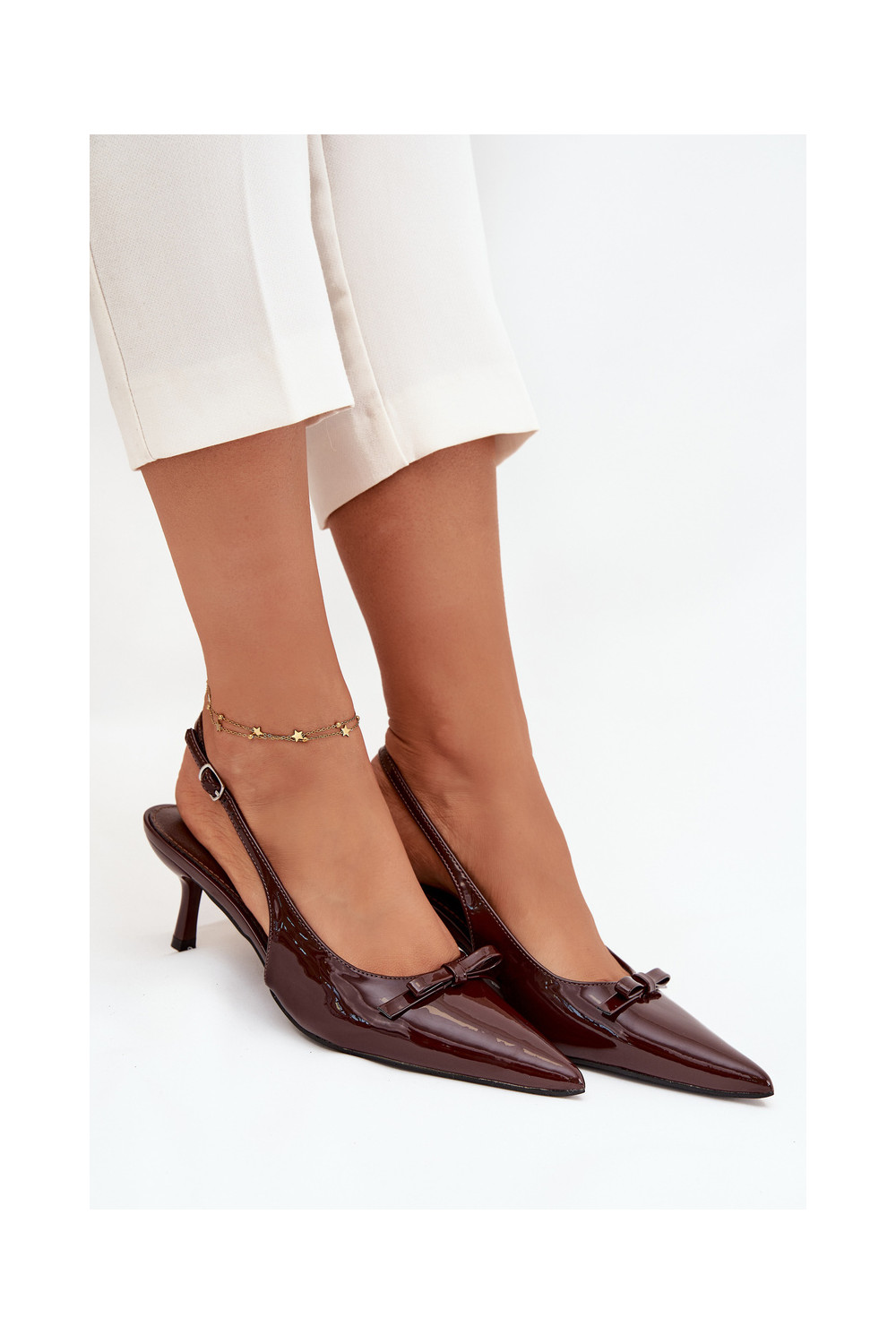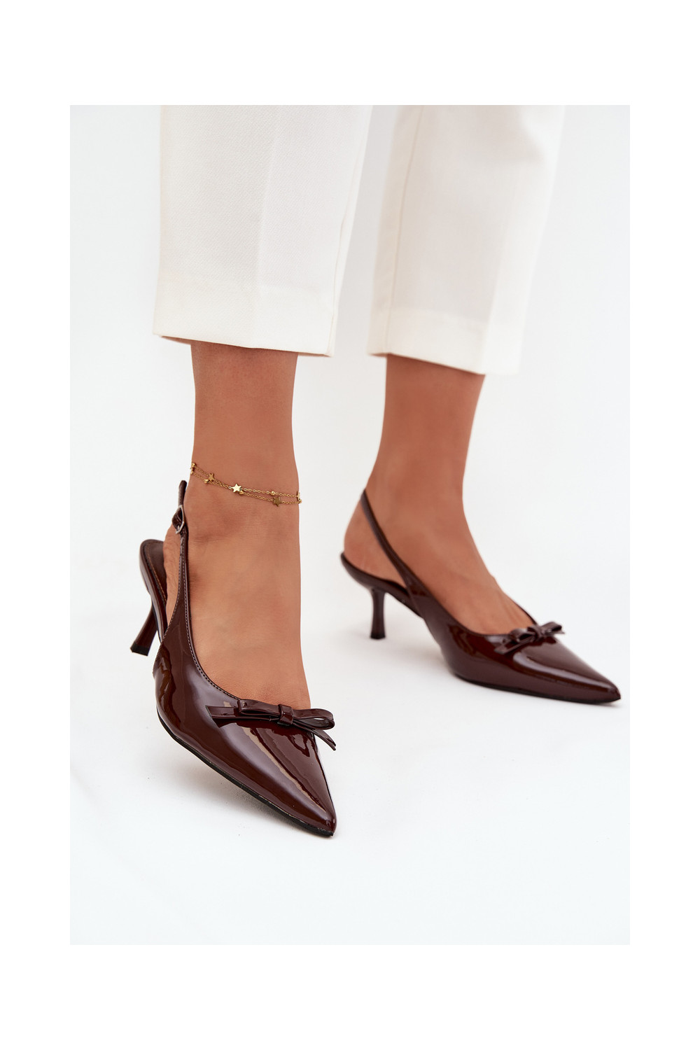 s efektem laku Obuv s tenkými podpatky se stuhami Czekoladowe Olvena