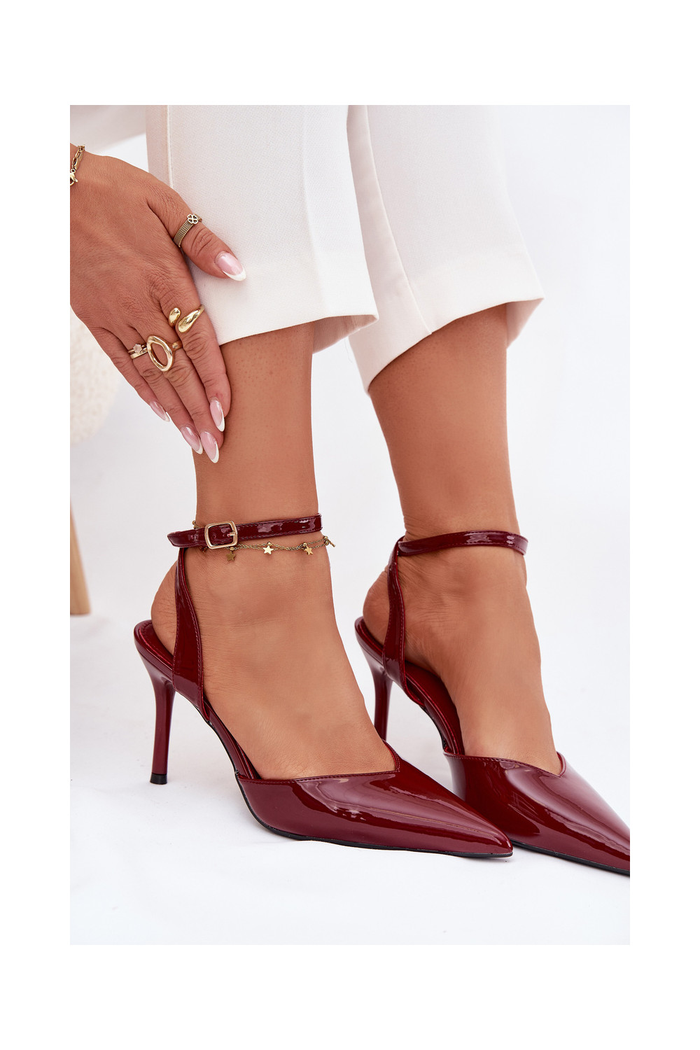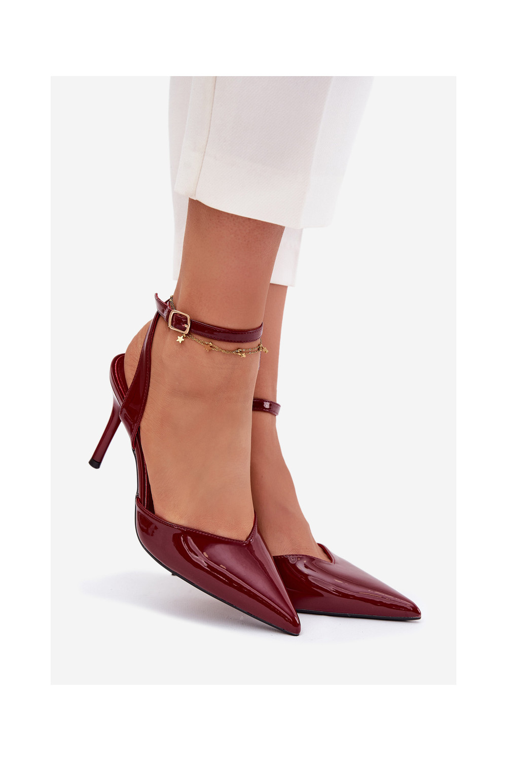 s efektem laku Boty na vysokém podpatku s otevřenou patou vínová Laretta