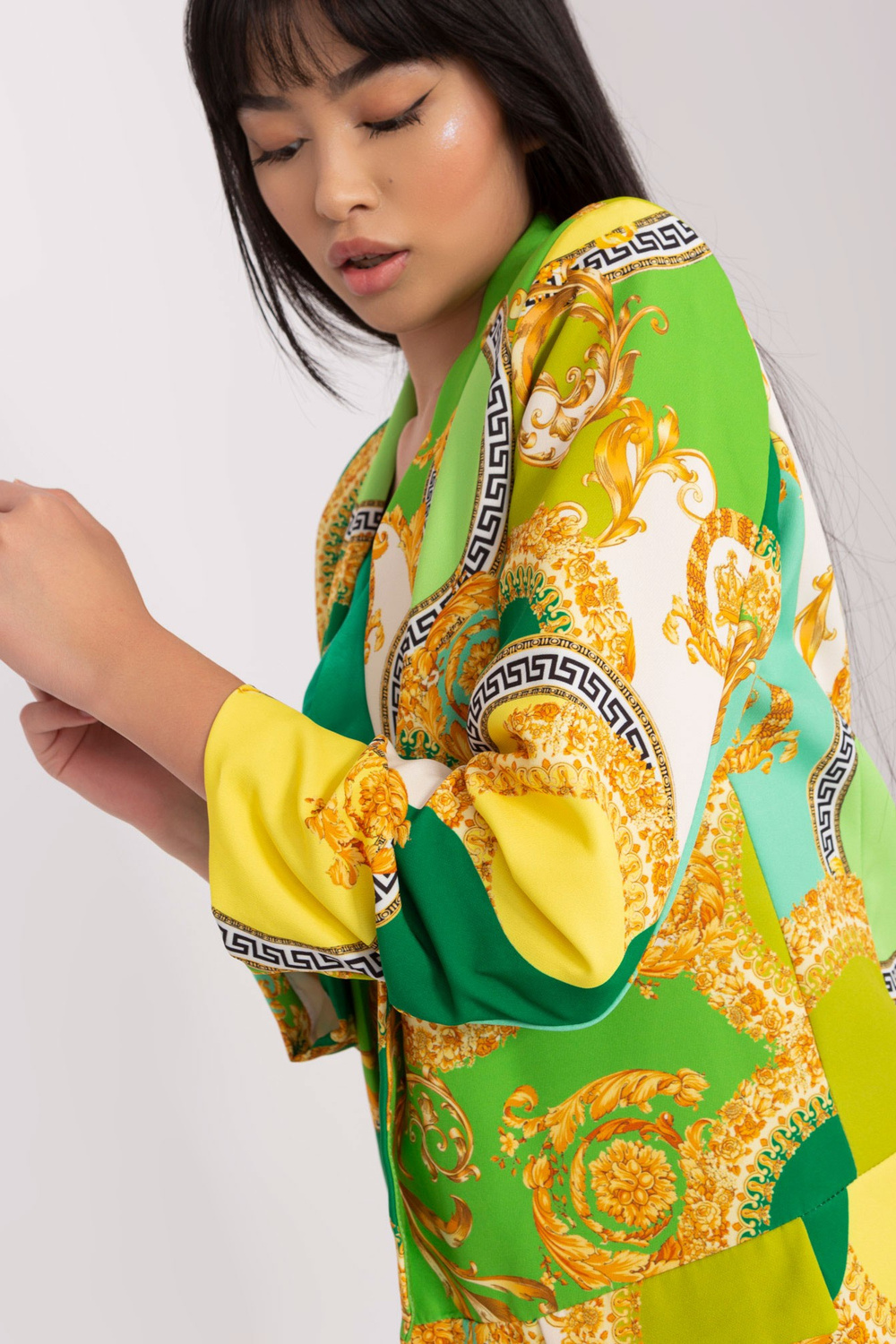 Modelka má na sobě velikost S. Rozměry modelky jsou: výška 167 cm, prsa 73 cm, pas 64 cm, boky 91 cm.