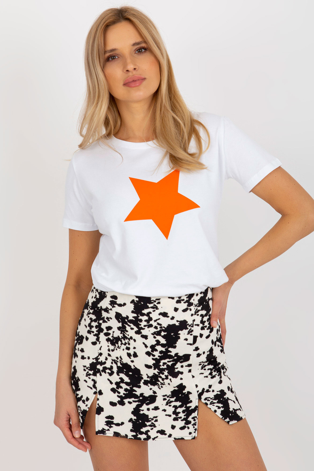 Bílé a oranžové bavlněné základní tričko s potiskem.
