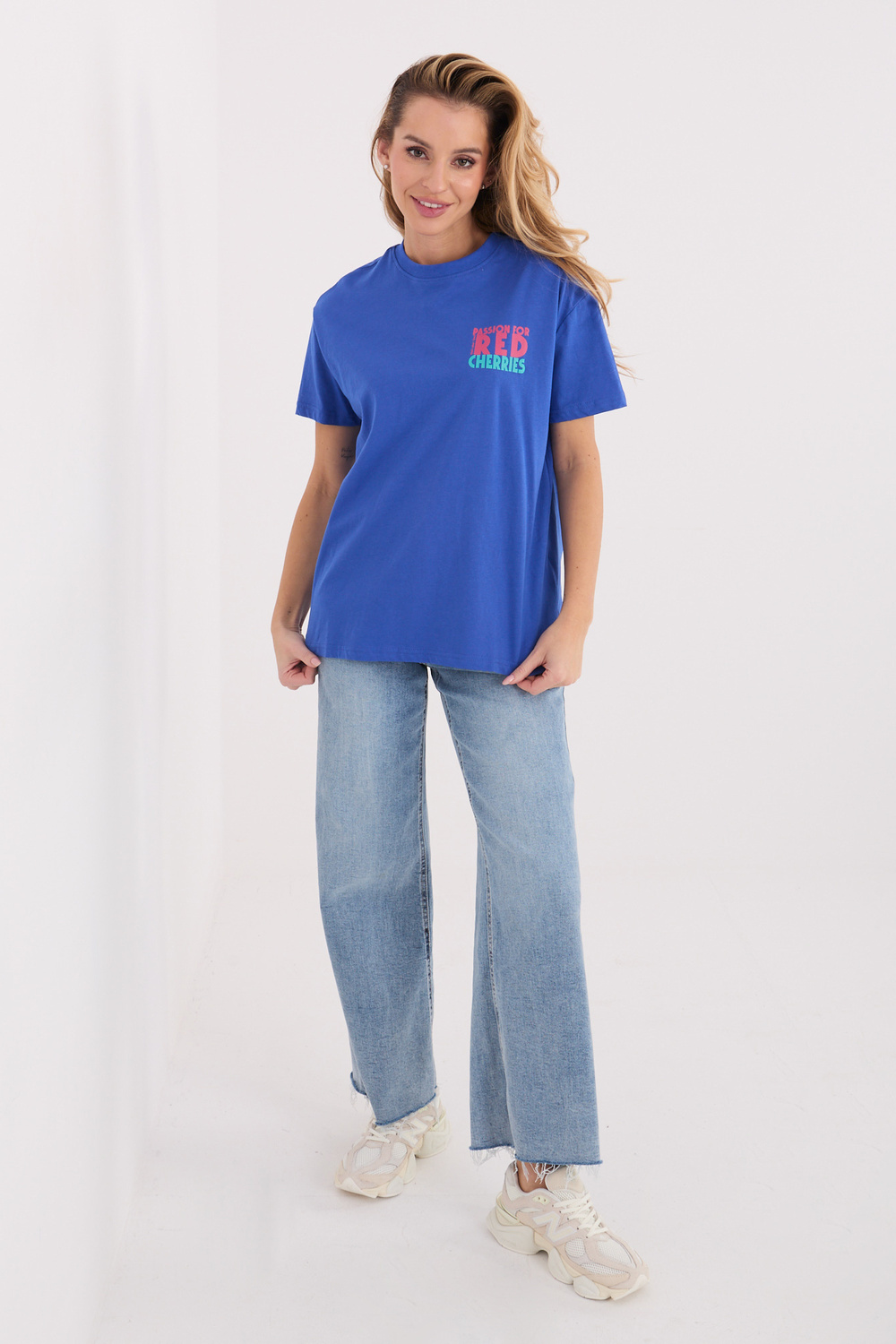 Rozměry trička velikosti S měřené vyžehlené: šířka pod pažemi – 53 cm, délka rukávu – 17 cm (od švu), šířka přes boky – 54 cm, celková délka – 67 cm.