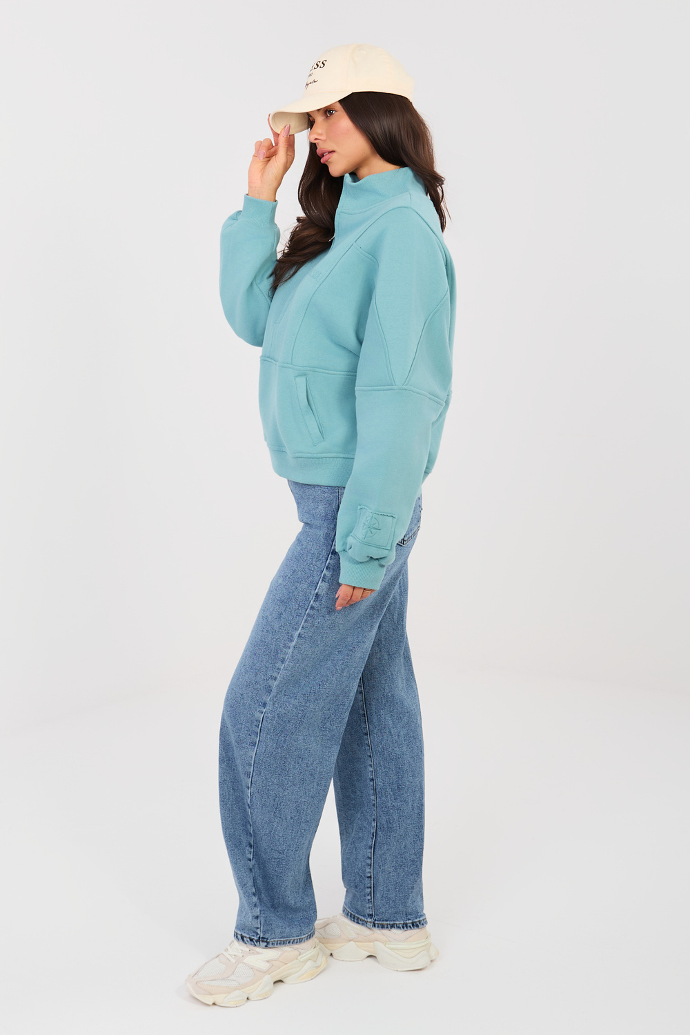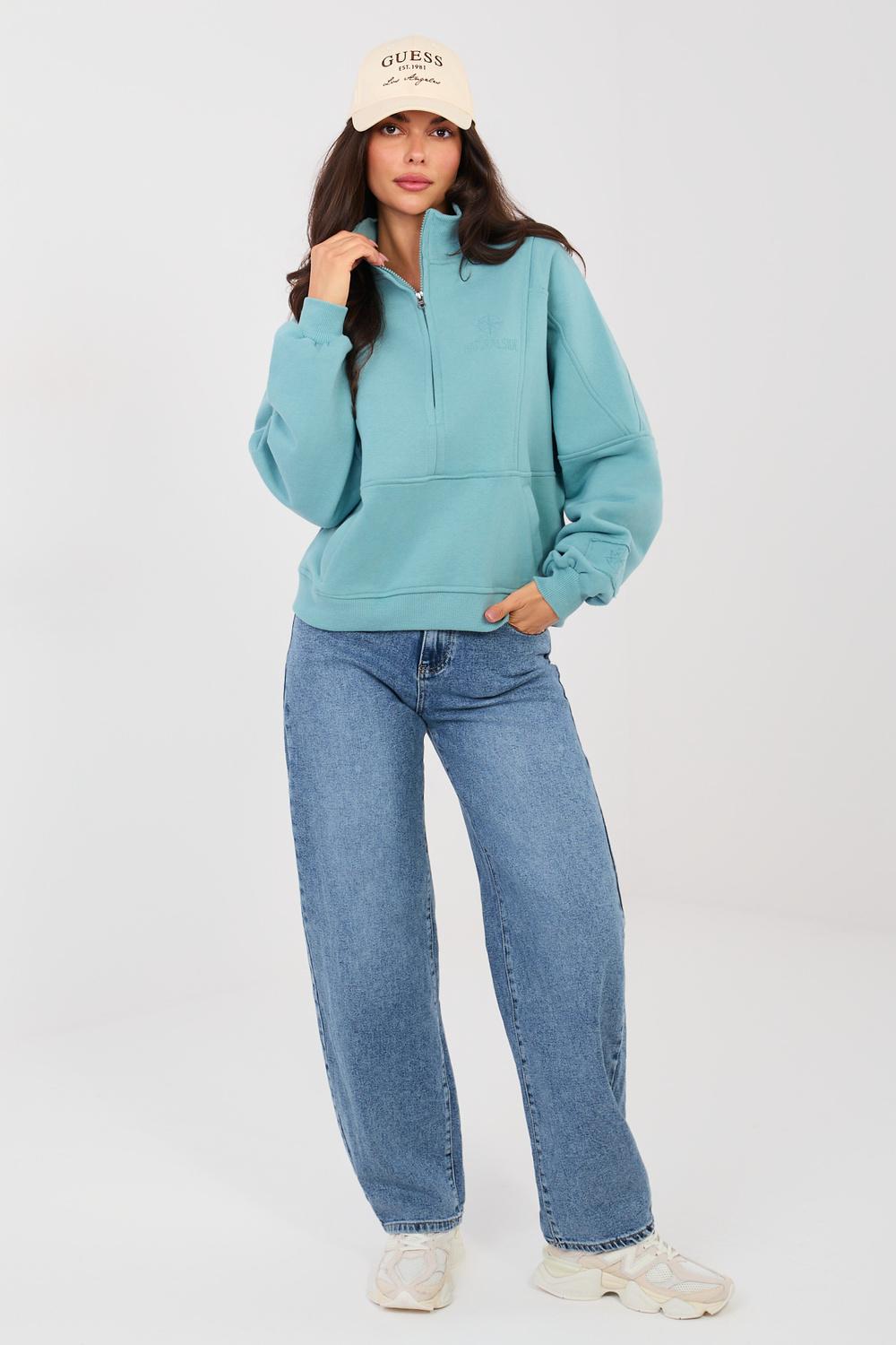 Modelka nosí velikost S. Rozměry modelky: výška 173 cm, hrudník 85 cm, pas 62 cm, boky 95 cm.