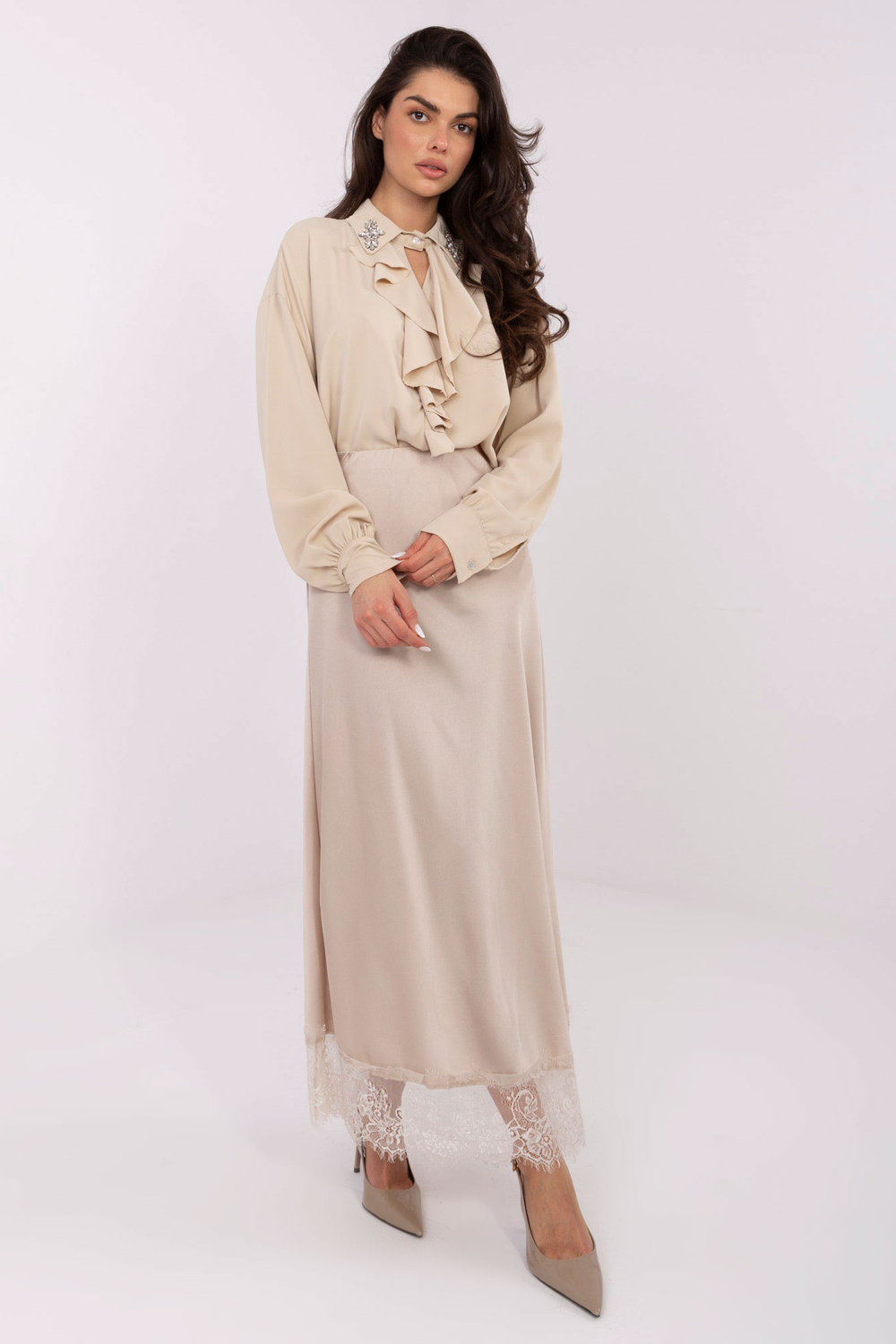 Rozměry halenky jedné velikosti naměřené na vyrovnaném kusu: šířka pod pažemi - 69 cm, celková délka - 68 cm (vpředu), celková délka - 78 cm (vzadu), šířka v bocích - 70 cm, délka rukávu - 57 cm.