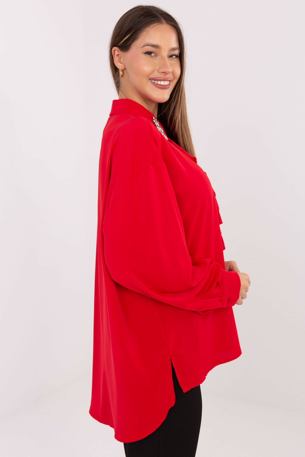 Rozměry halenky univerzální velikosti, změřené vleže: šířka pod pažemi - 69 cm, celková délka - 68 cm (vpředu), celková délka - 78 cm (vzadu), šířka přes boky - 70 cm, délka rukávu - 57 cm.