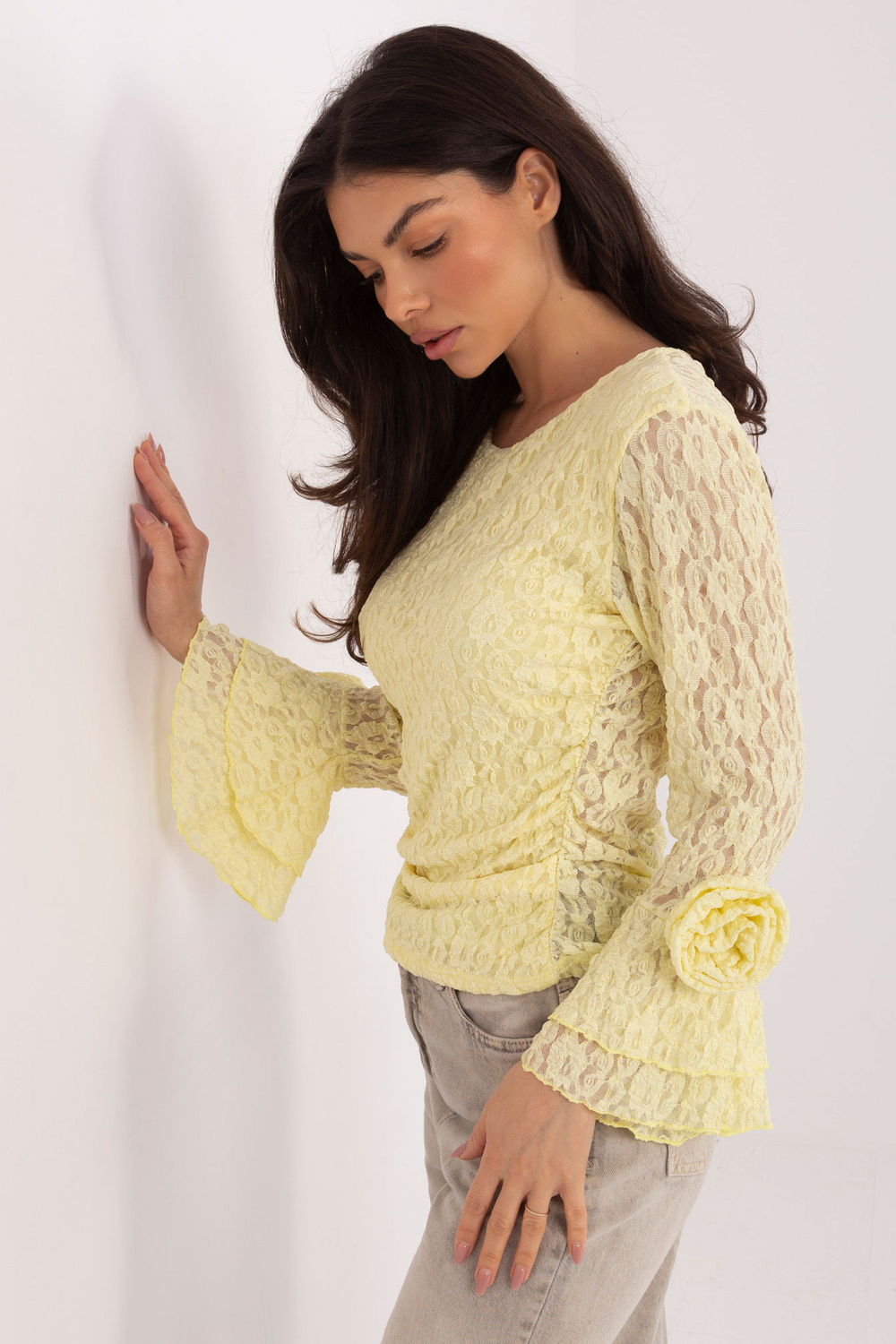 Rozměry halenky univerzální velikosti měřené vleže: šířka pod pažemi - 70 cm, celková délka - 66 cm, šířka boků - 48 cm, délka rukávu - 69 cm.