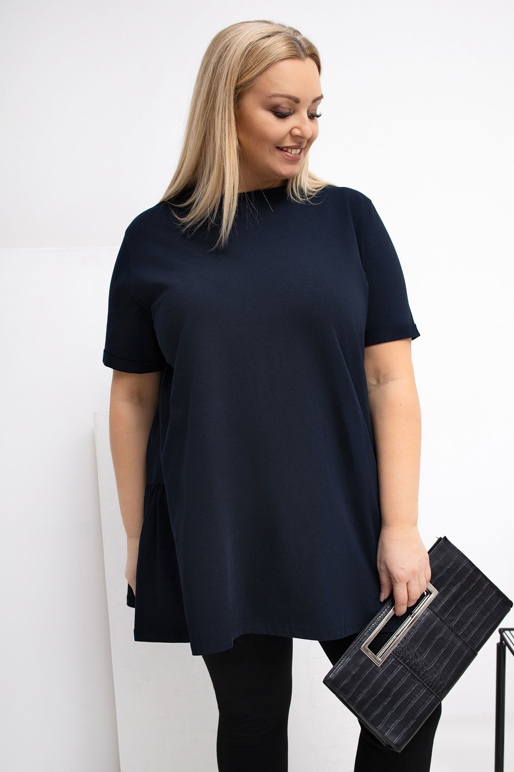 Rozměry halenky jedné velikosti měřené vyrovnané: šířka pod pažemi - 57 cm, šířka boků - 74 cm, délka rukávu - 24 cm (od švu), celková délka - 81 cm.