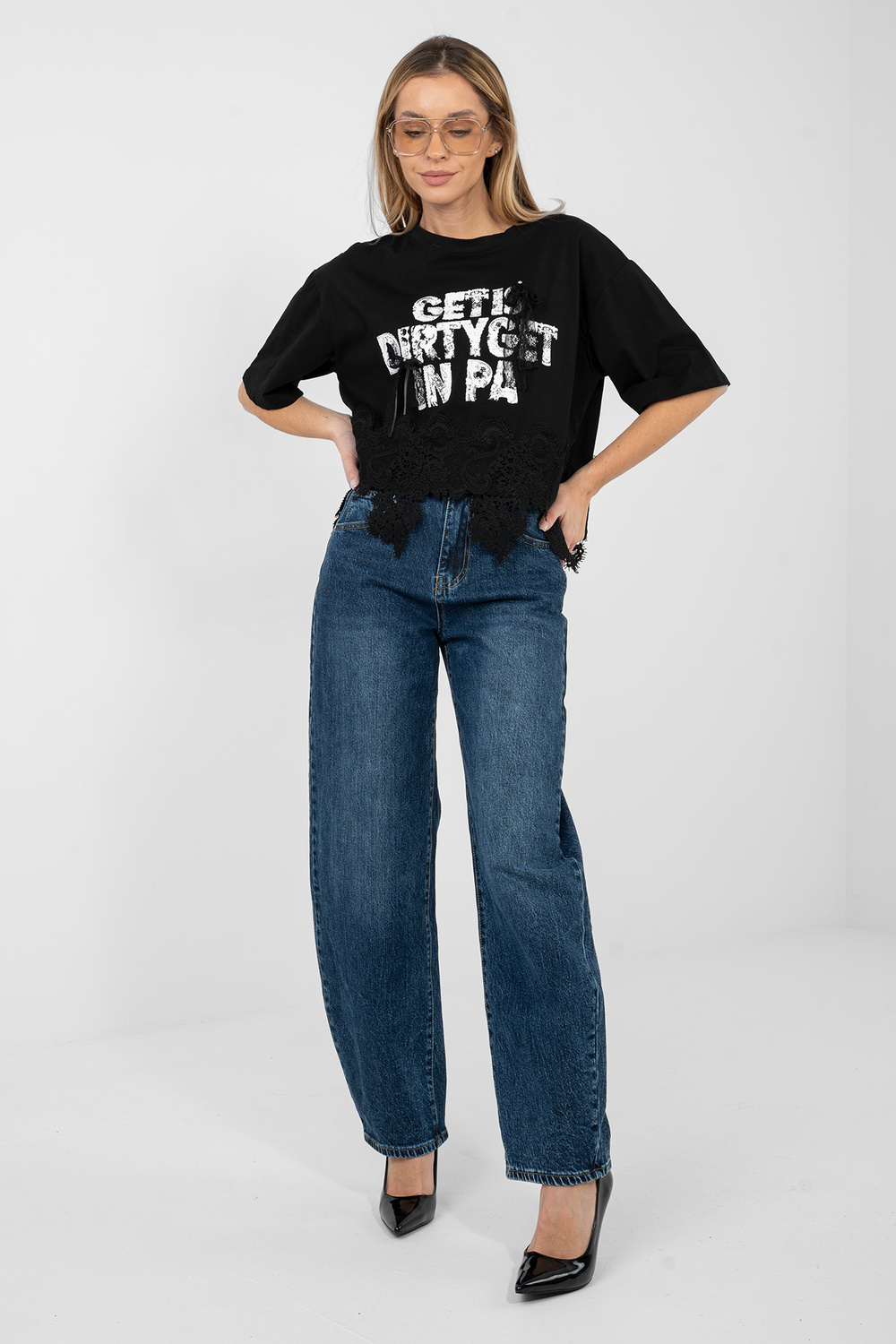 Modelka má na sobě oblečení univerzální velikosti. Rozměry modelky: výška 169 cm, hrudník 88 cm, pas 68 cm, boky 89 cm .