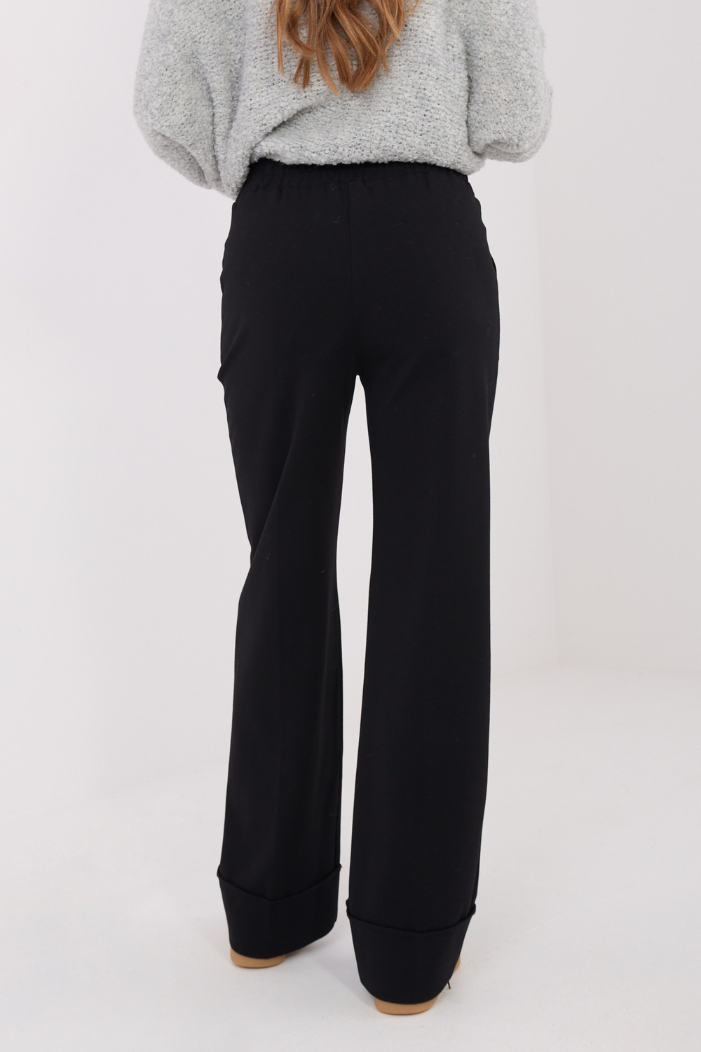 Rozměry kalhot ve velikosti S/M: šířka v pase - 34 cm (měřeno naplocho),  šířka v pase - 56 cm (natažené), šířka boků - 46 cm, výška pasu - 31 cm, celková délka - 107 cm.
