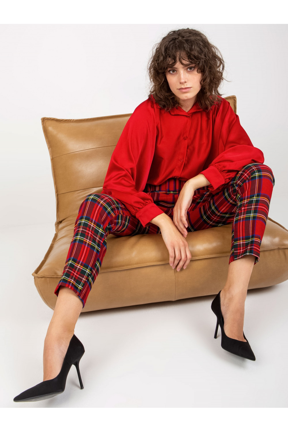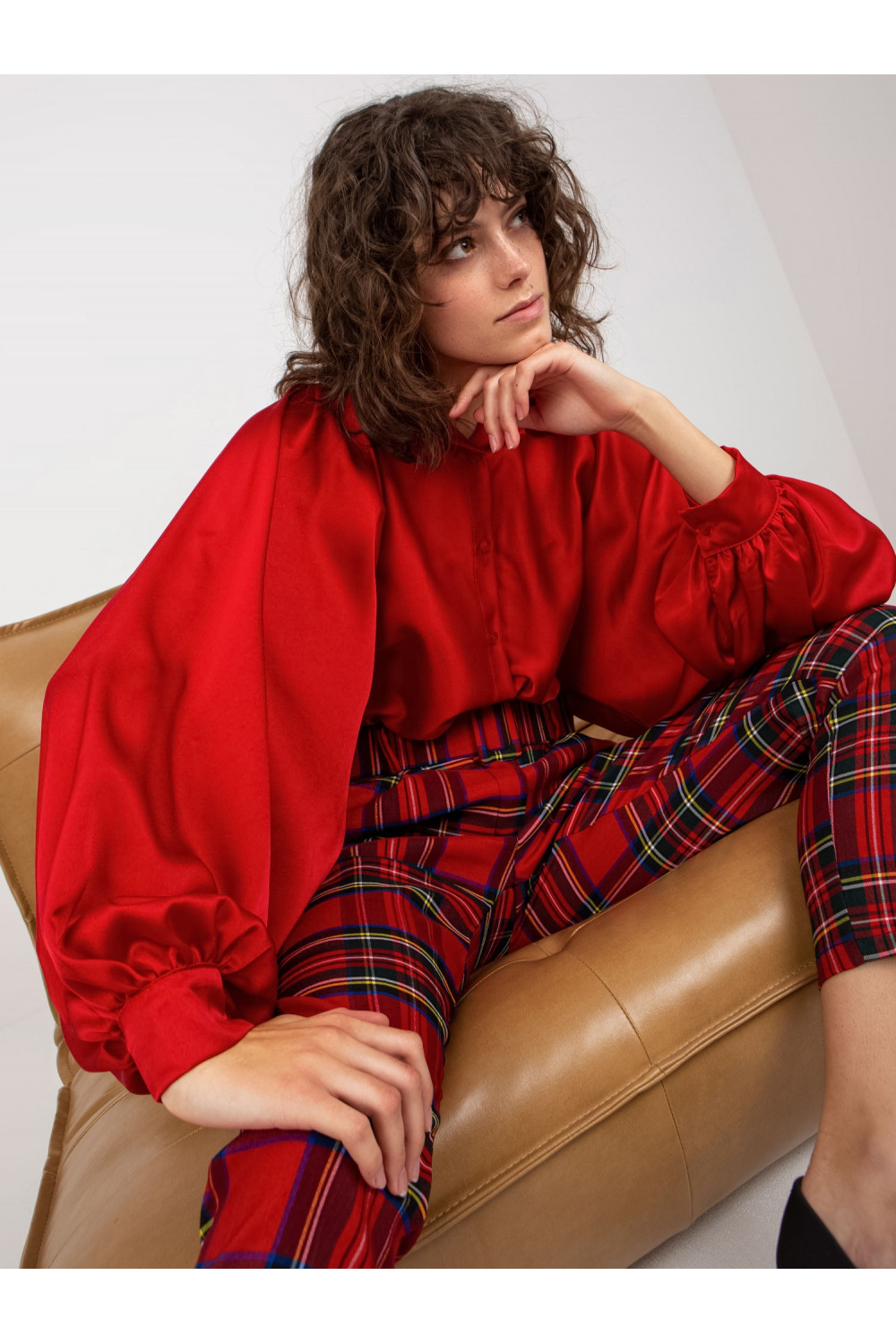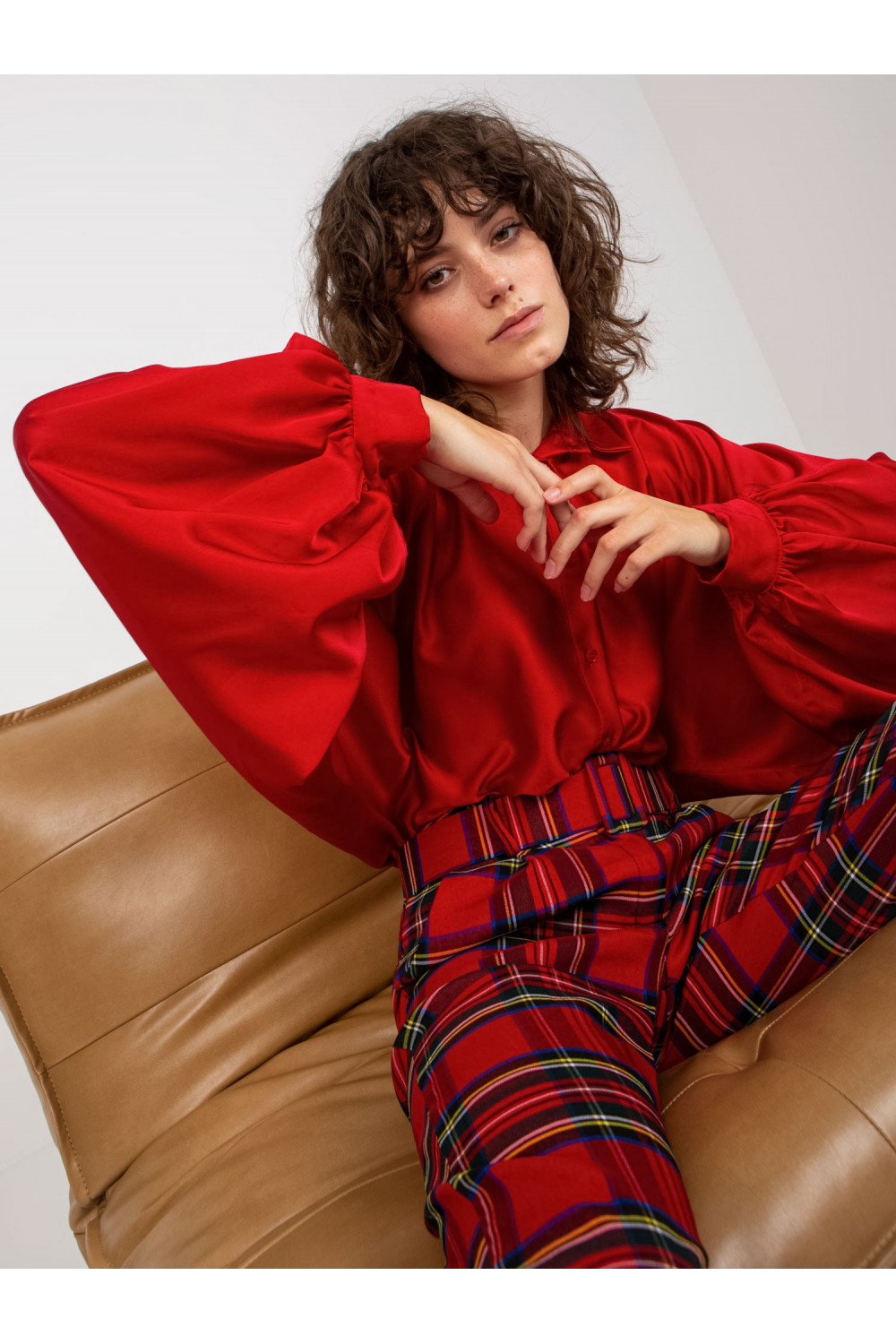 Tmavě červená imitace saténové košile s širokými rukávy Cristina.