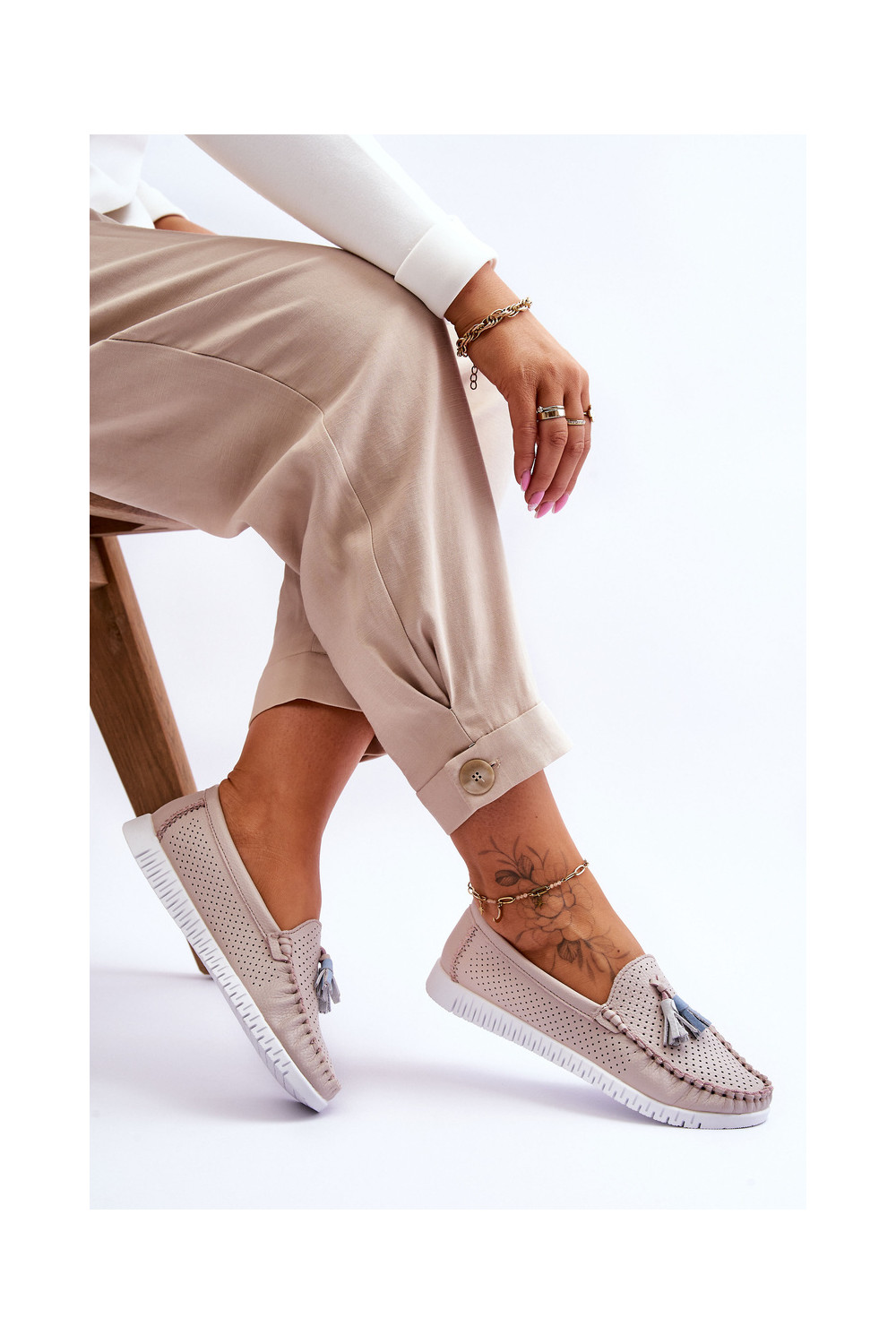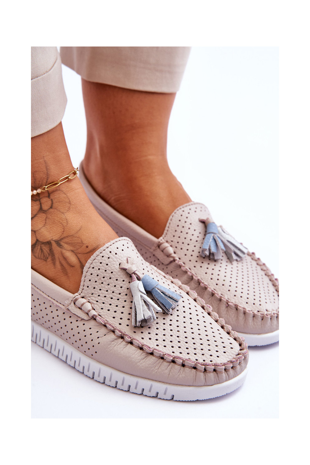 Klasické dámské mokasíny jsou vyrobeny z přírodní kůže. Na přední straně jsou ozdobné střapce. Mokasíny byly postaveny na platformě s gumovou protiskluzovou podrážkou. Měkká stélka z přírodní kůže je částečně perforovaná. Skvělý model pro mnoho jaro-letních stylizací! Při výběru velikosti se prosím řiďte tabulkou velikostí.