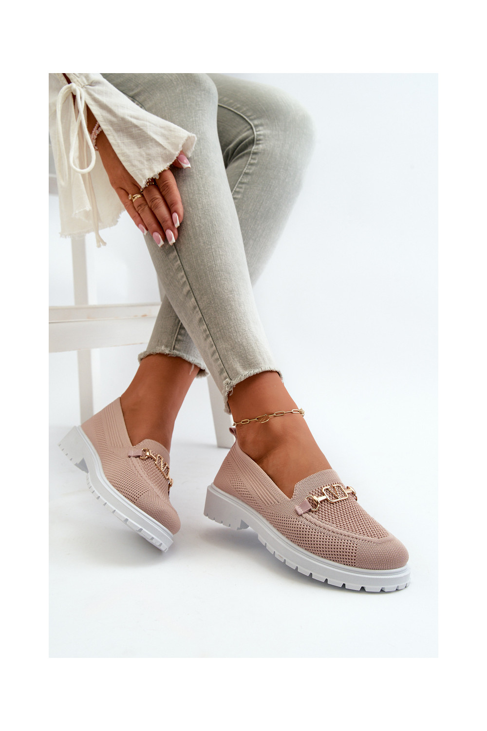 Dámské mokasíny vyrobené z prodyšné látky. Umístěné na plochém podpatku, což zajišťuje pohodlí při nošení po celý den. Zaoblené špičky dodávají klasický vzhled. Ozdobené zlatým detail. Měkká stélka z pěny, navíc potažená materiálem, zaručuje pohodlí. Při výběru velikosti se řiďte tabulkou velikostí.