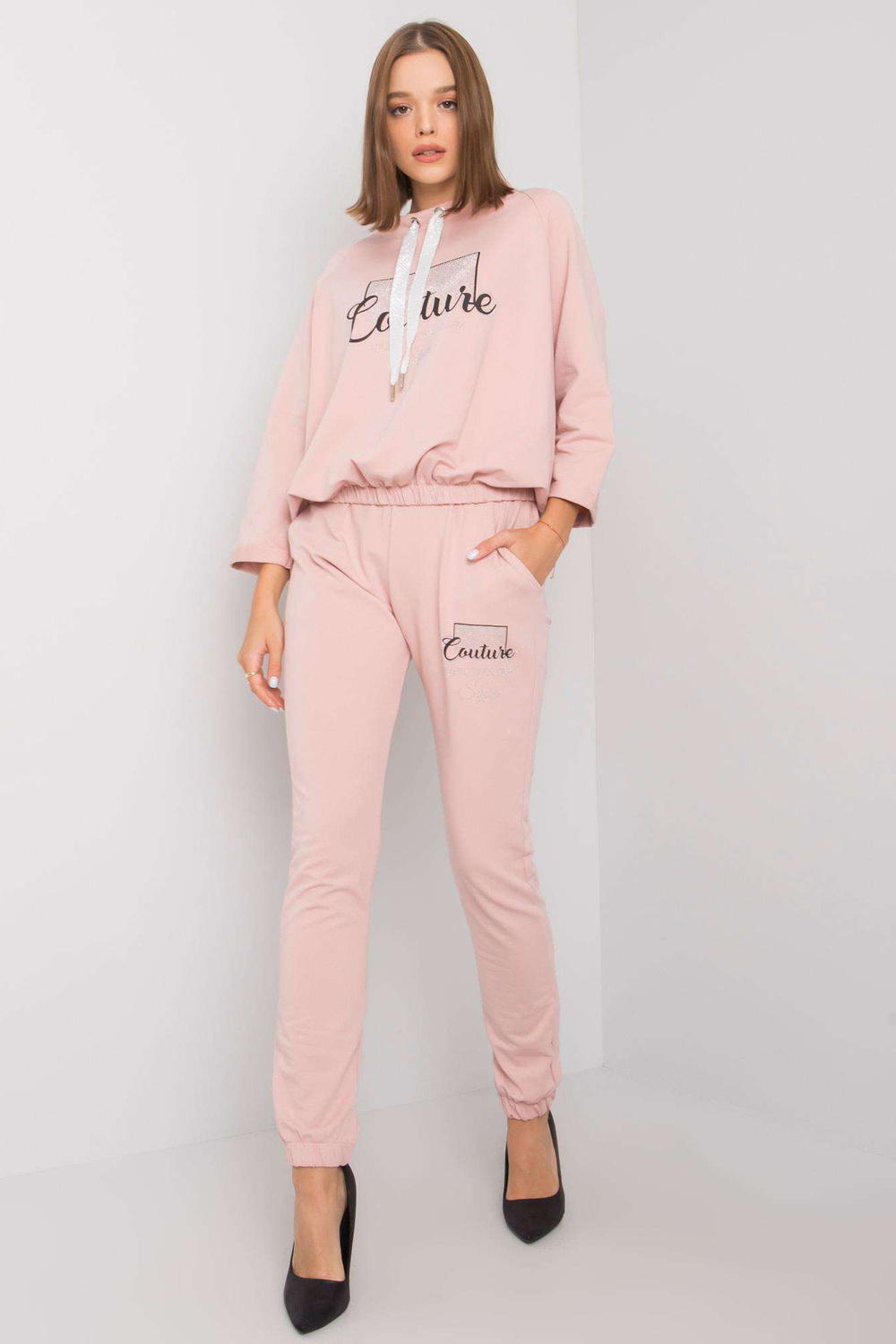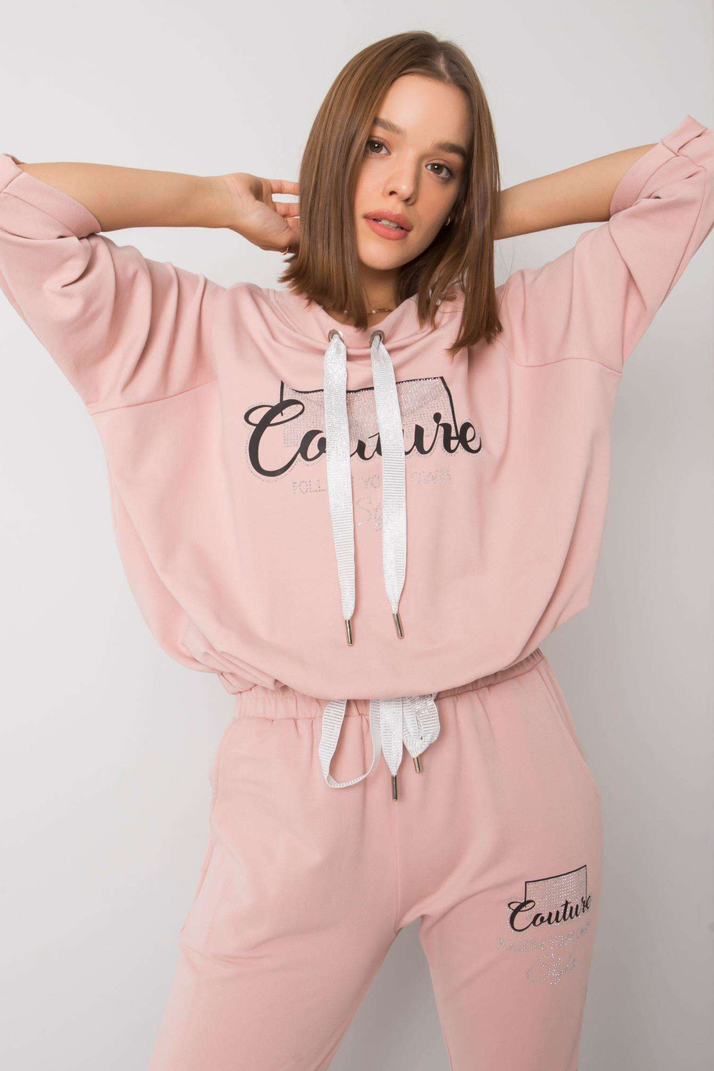 Rozměry kompletu ve velikosti S/M měřeny naplocho: šířka v podpaží - 62 cm, délka mikiny - 55 cm, délka rukávu - 44 cm, šířka pasu - 39 cm, délka nohavice - 98 cm