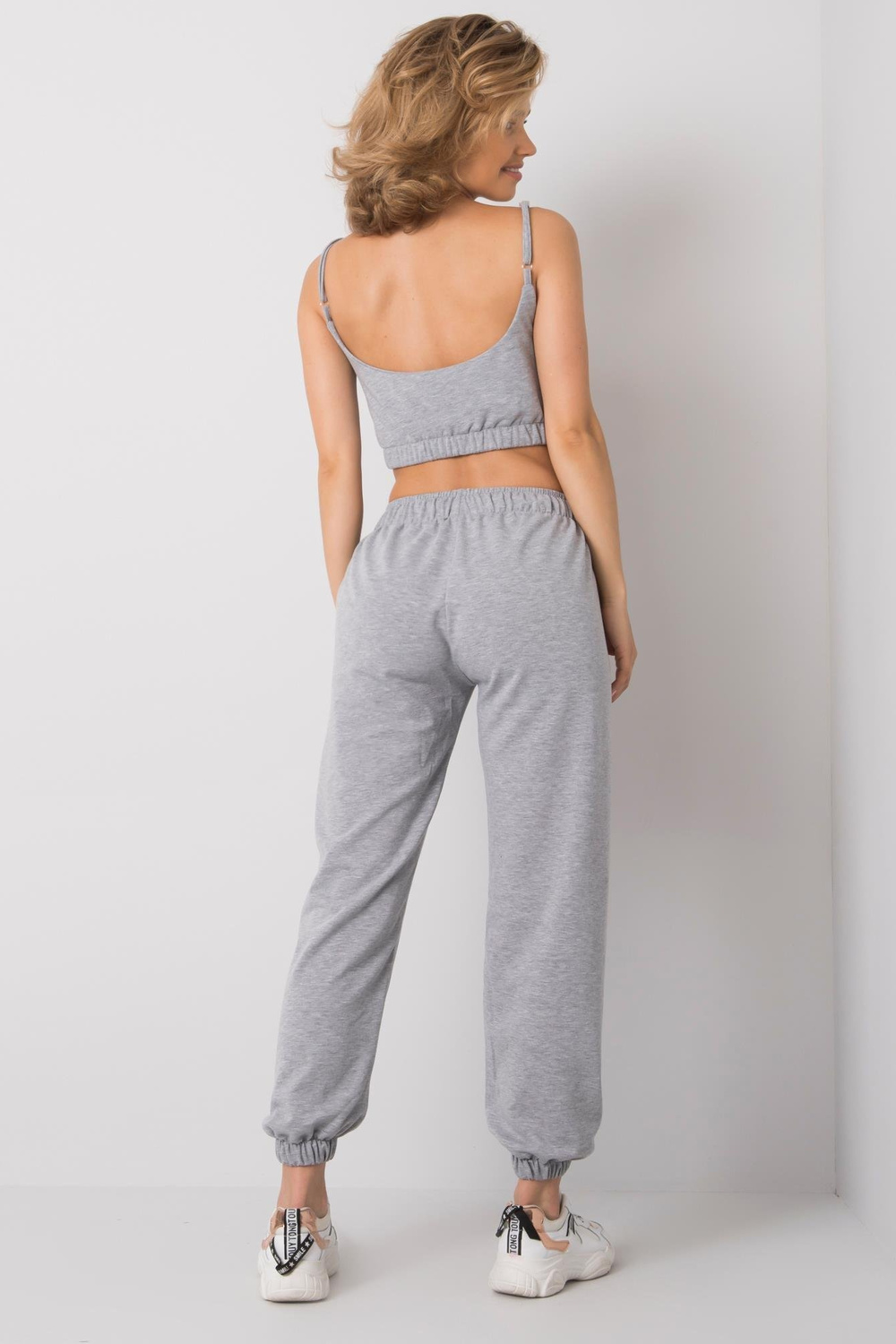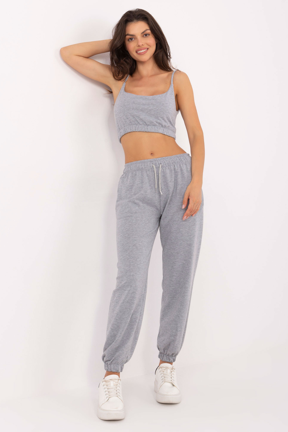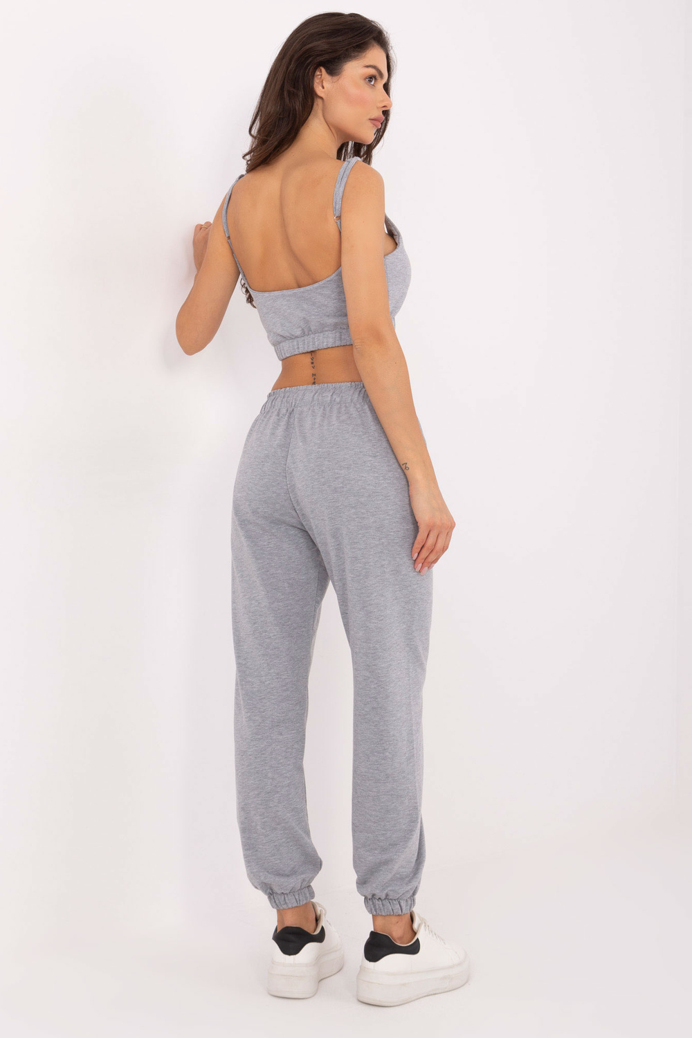 Šedá dvoudílná sada Mado. doplňky: nastavitelná ramínka sada obsahuje: kalhoty, svrchní materiálsložení: 72% bavlna, 22% polyester, 6% elastan způsob praní: praní v pračce na 30°C Modelka má na sobě velikost S. Rozměry modelky: výška 170 cm, prsa 89