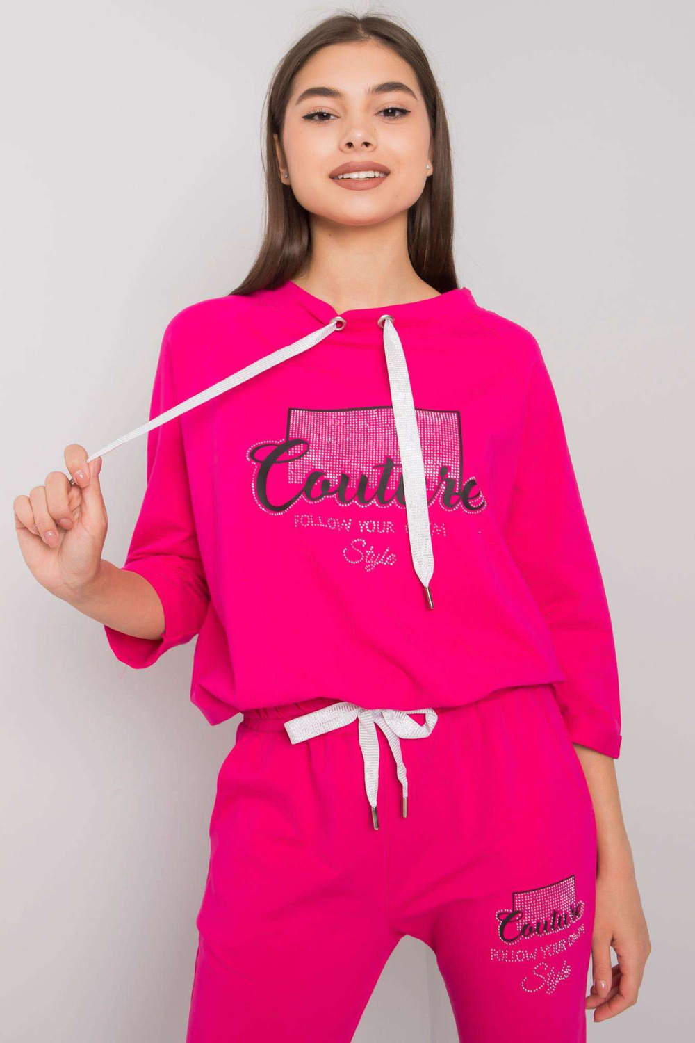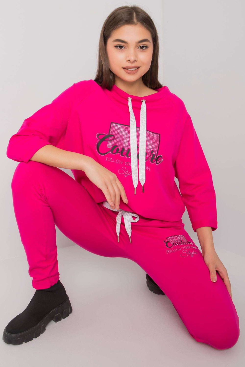 Rozměry kompletu ve velikosti S/M měřeny naplocho: šířka v podpaží - 62 cm, délka mikiny - 55 cm, délka rukávu - 44 cm, šířka pasu - 39 cm, délka nohavice - 98 cm