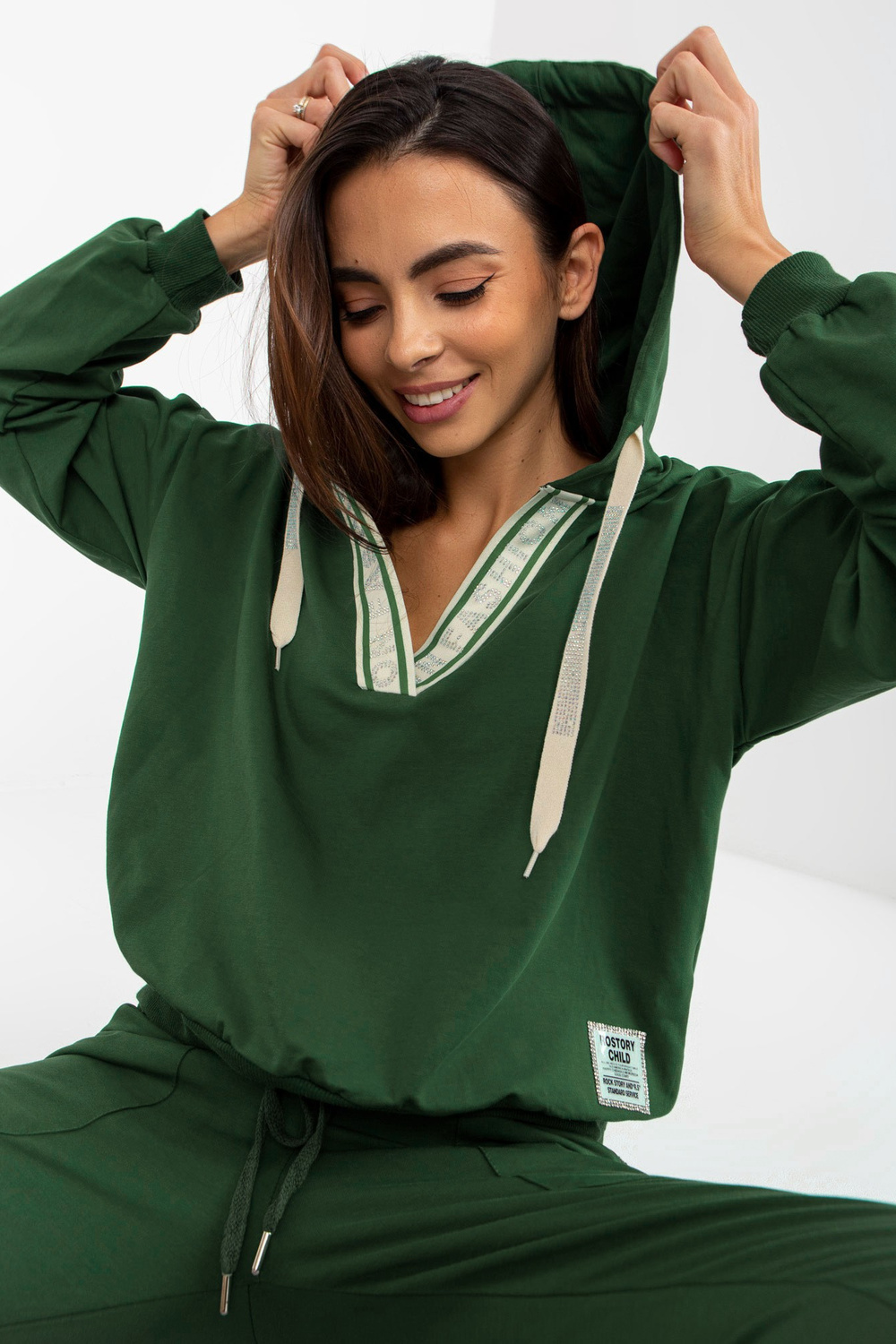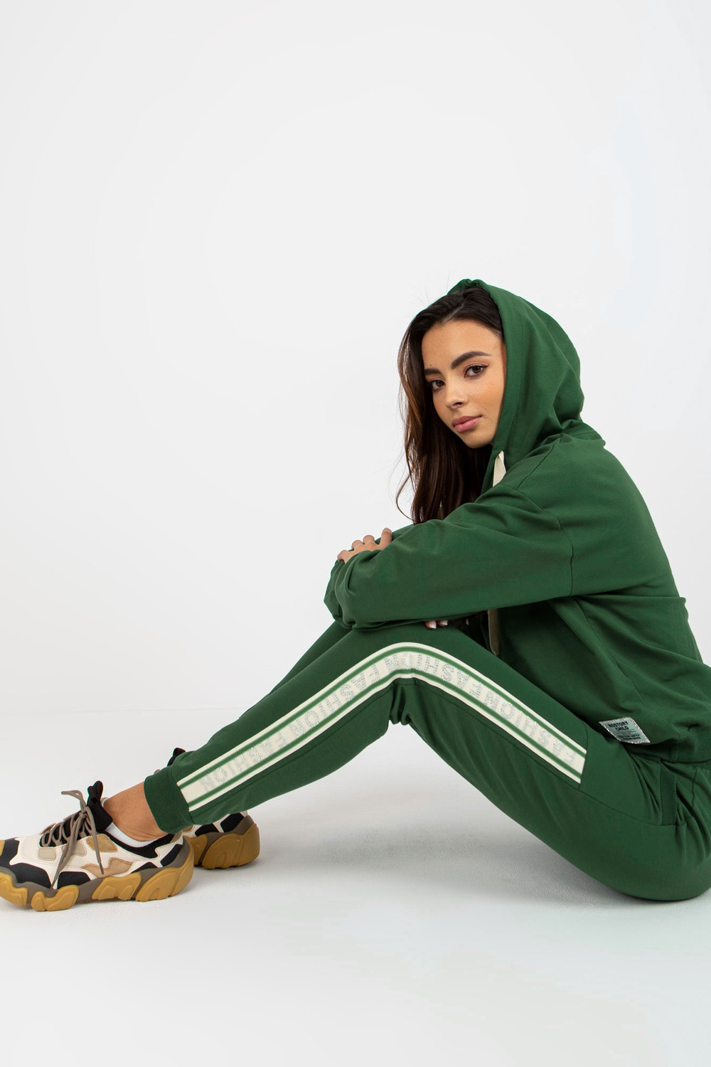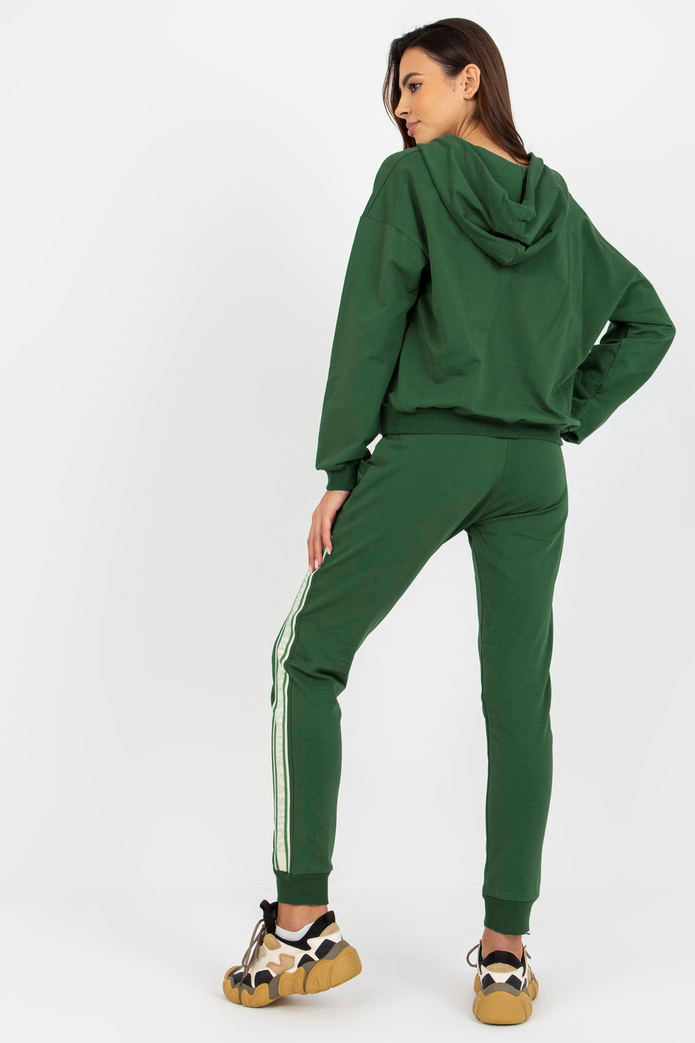 Dunkelgrünes Baumwoll-Lässiges Set s aplikací. Kód produktu: RV-KMPL-8297.52P dominanty Vzor: glatt Styl: lässig Anlass: lässig, für einen Spaziergang, zur Arbeit, in der Stadt Model Größe S/M, Modellmaße: Höhe 175 cm, H61 cm, Büste