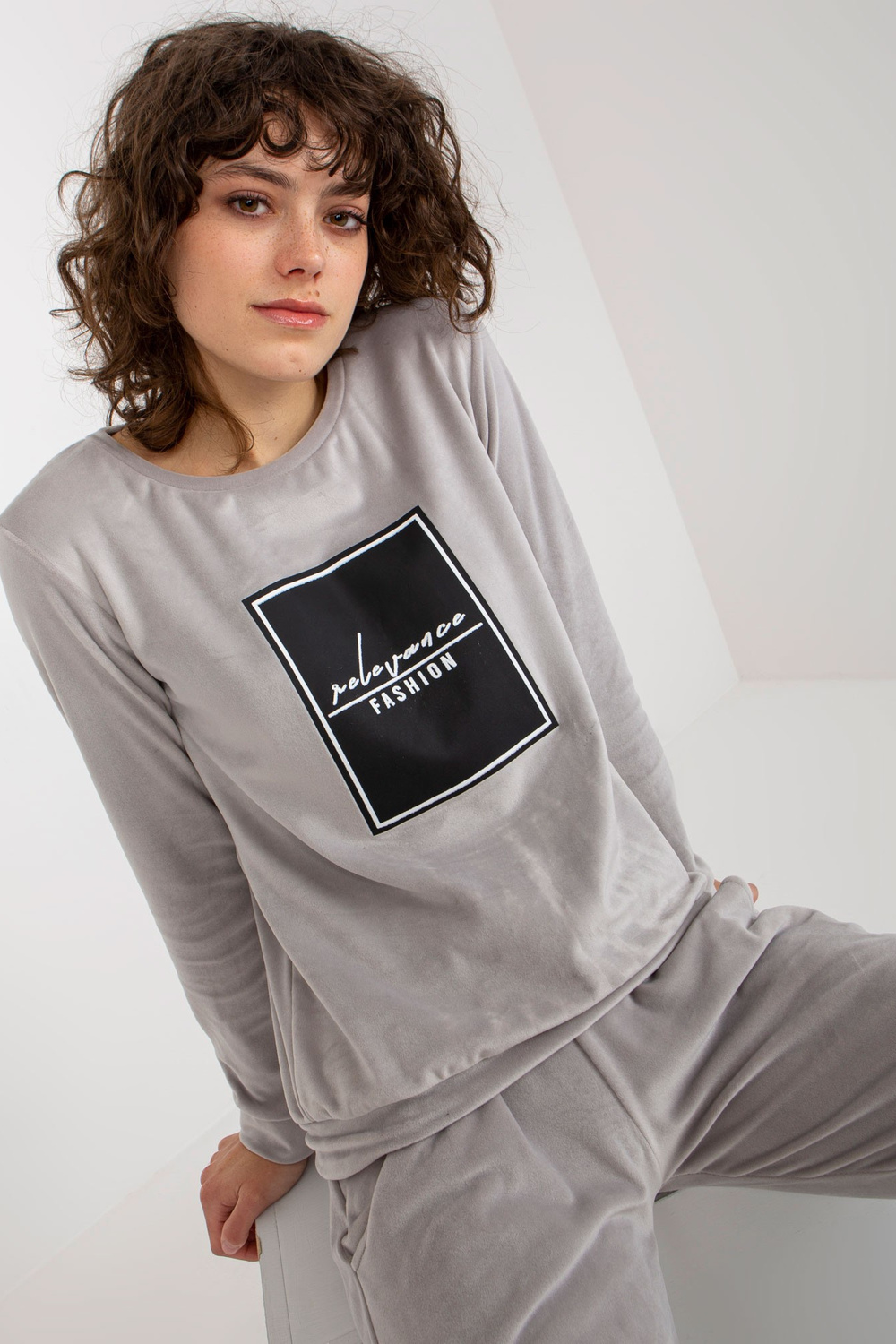 Světle šedý dámský velurový set s kulatým výstřihem.