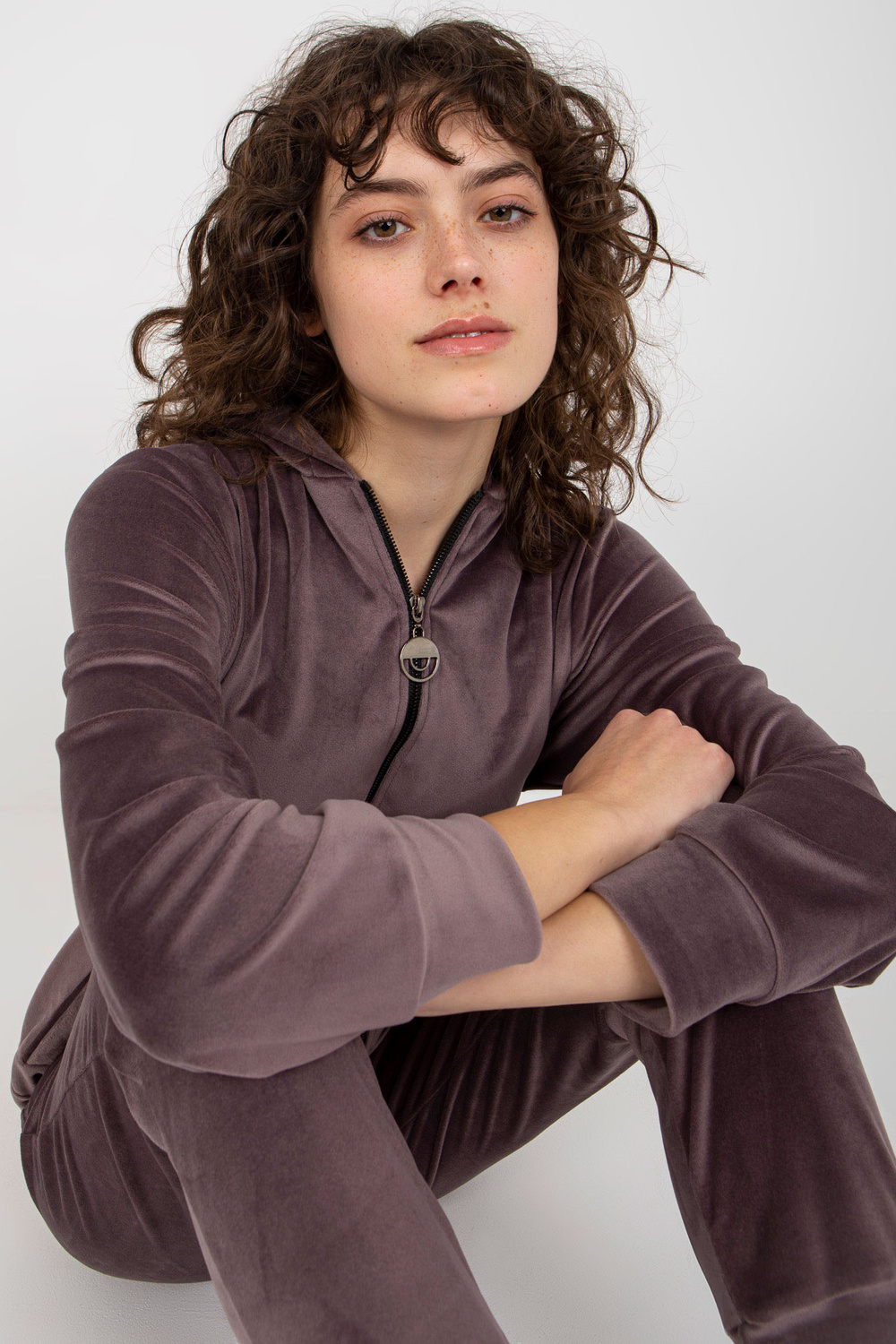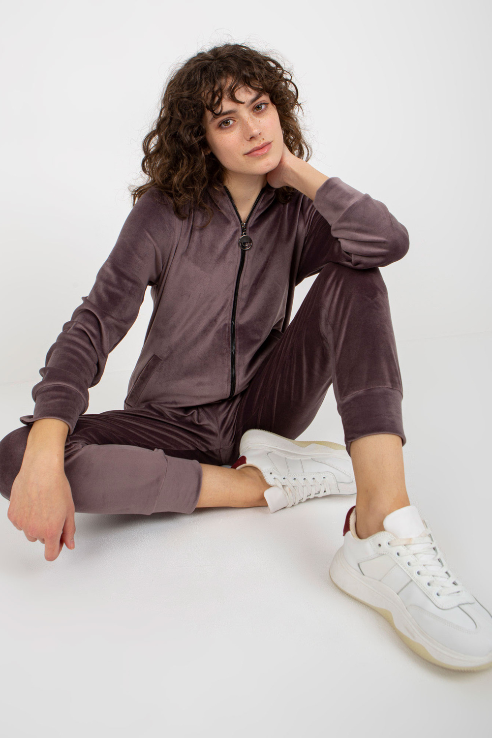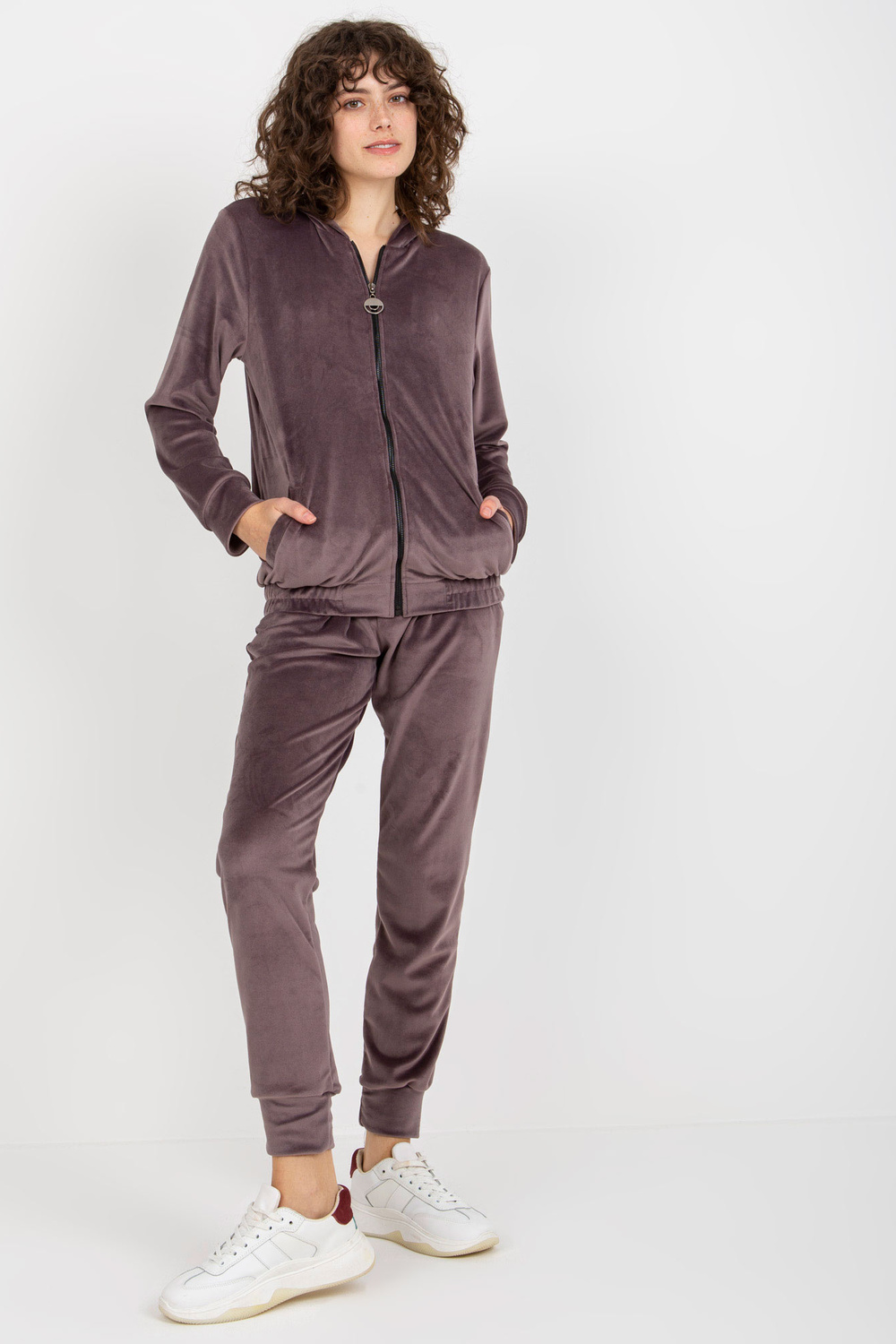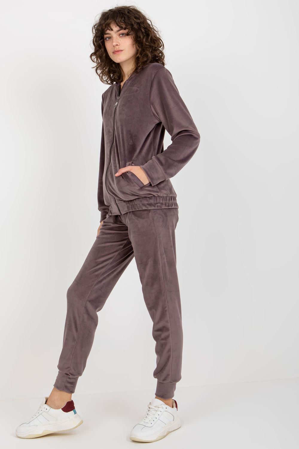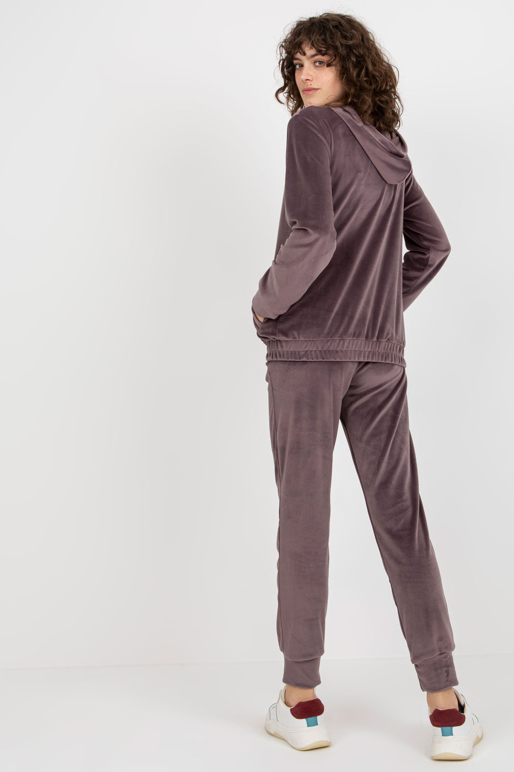 Fialový dvoudílný velurový set s kalhotami.