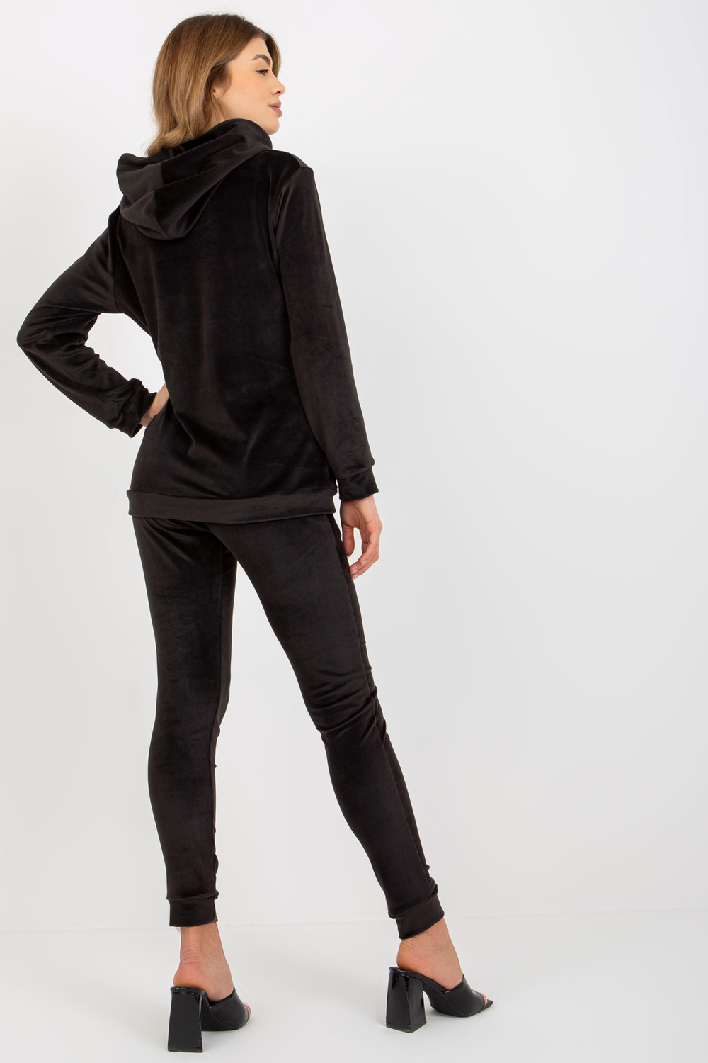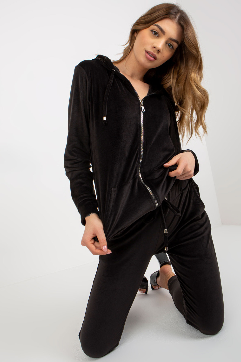 Černý dámský velurový set s mikinou a kalhotami.