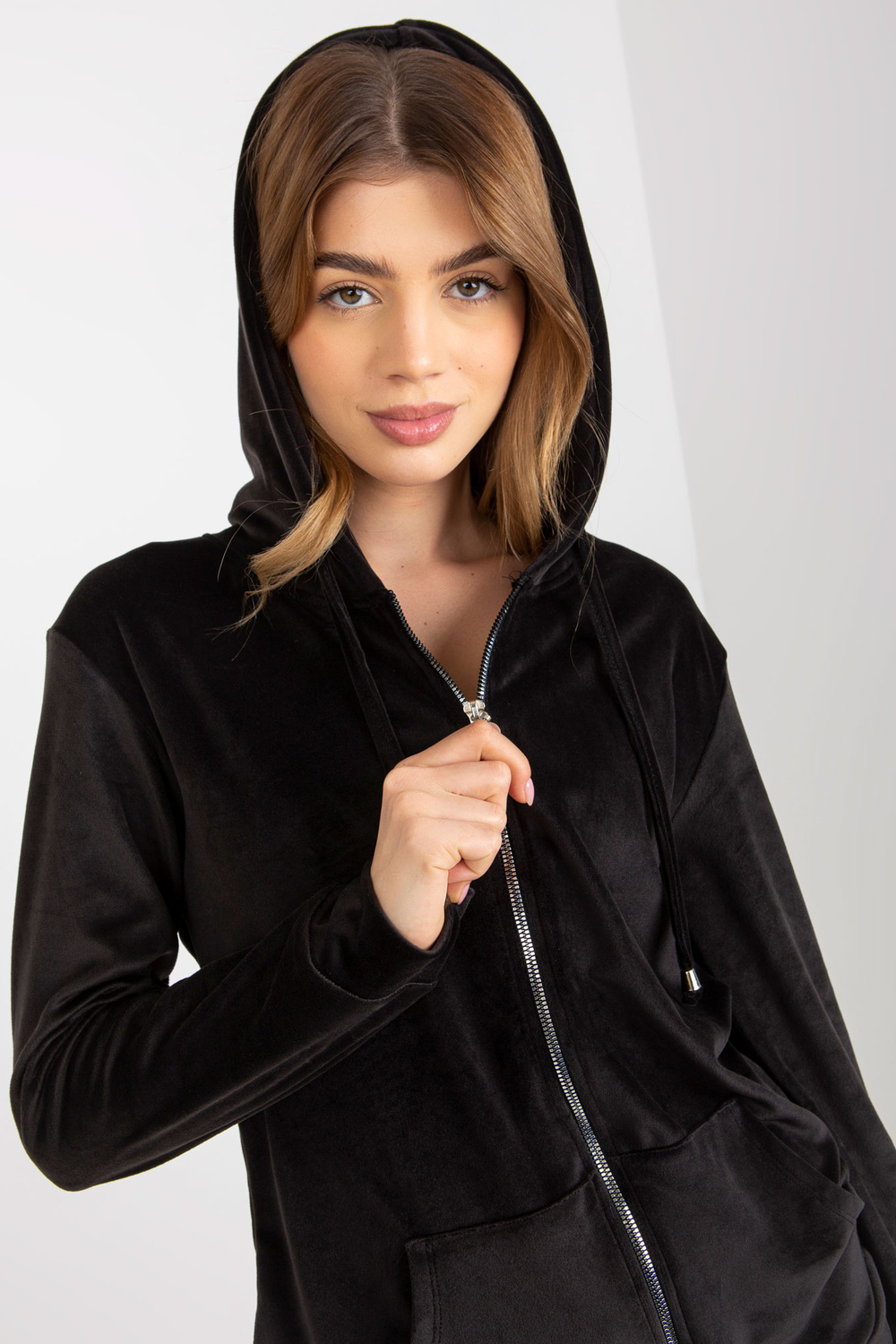 Černý dámský velurový set s mikinou a kalhotami. Kód produktu: RV-KMPL-6087-2.31X dominantní vzor: hladký Styl: ležérní příležitost: ležérní, do města, na procházku Modelka má na sobě velikost S/M. Rozměry modelu: výška 173 cm, prsa 78 cm, pas