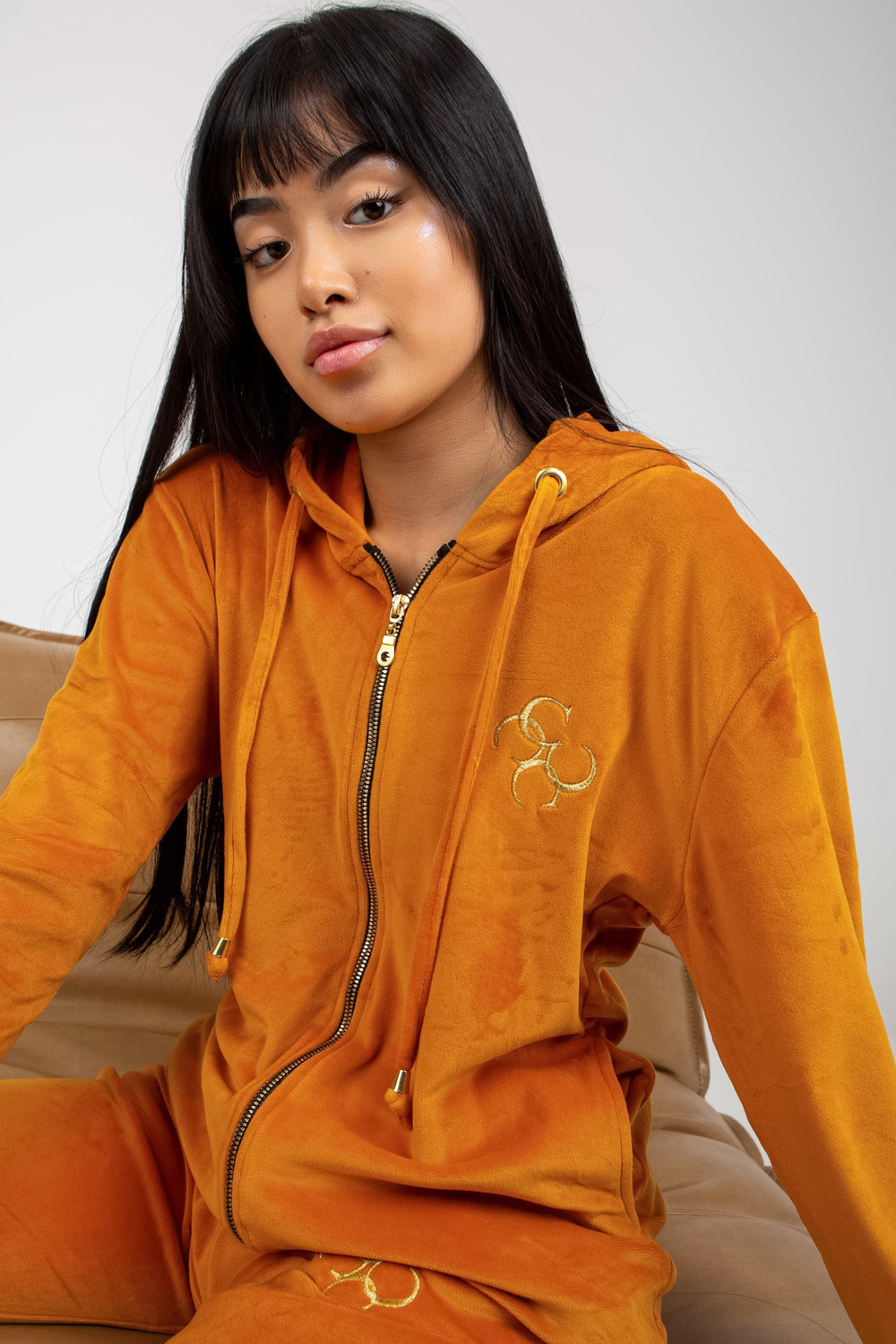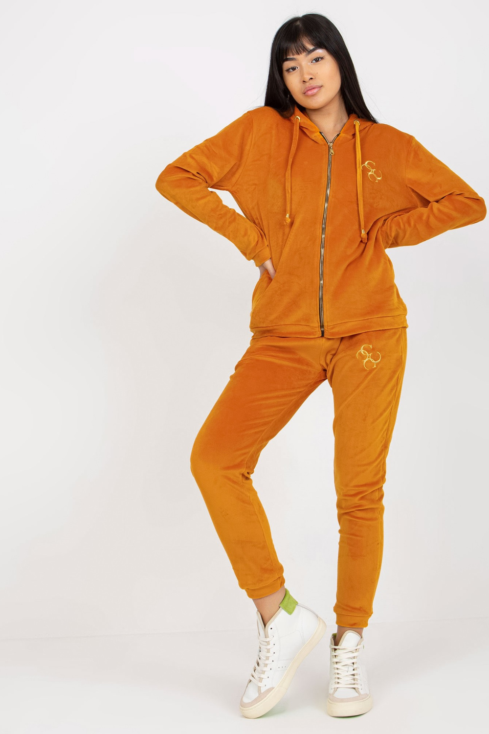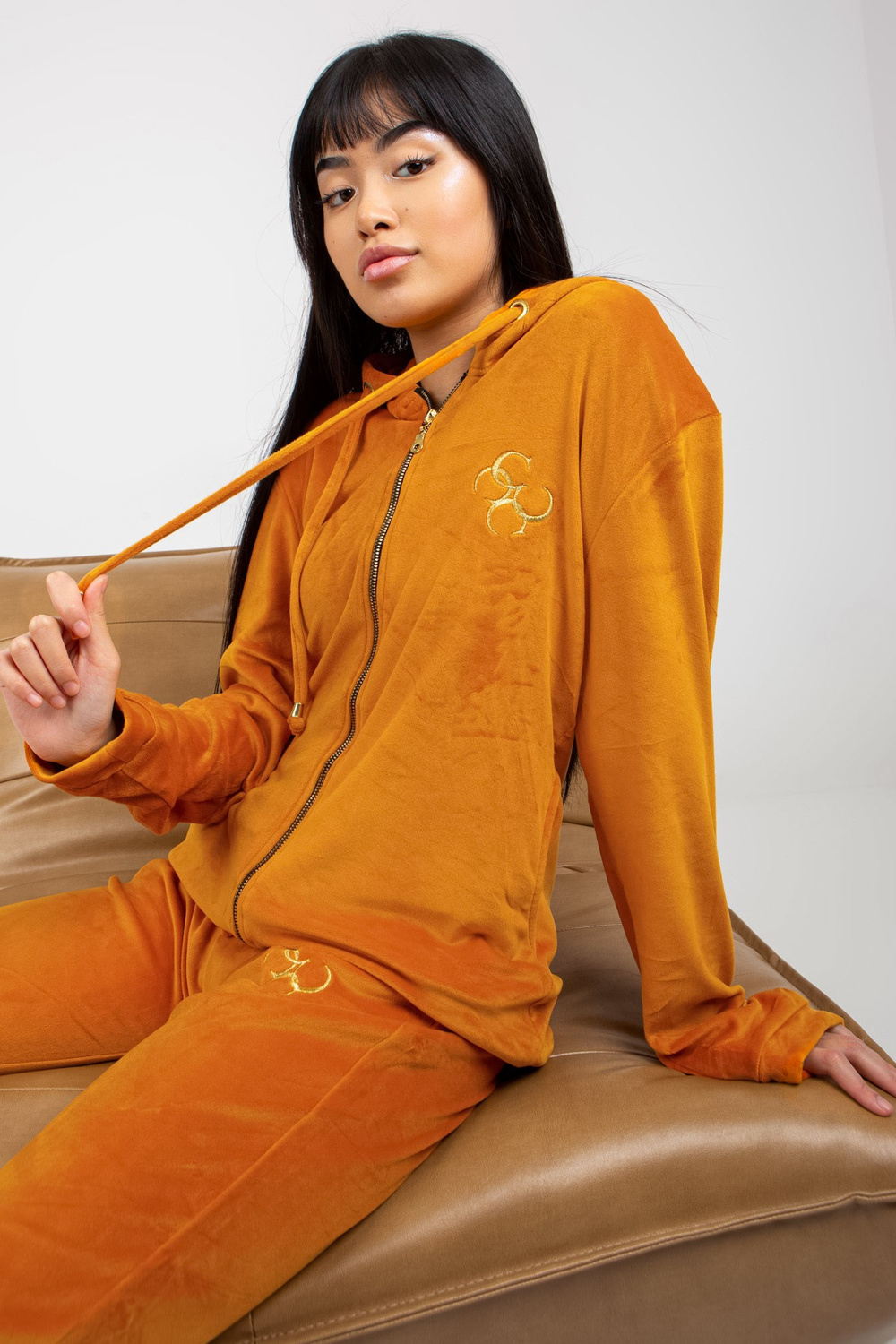 Dámský velurový set tmavě žluté barvy s pruhy Melody. Kód produktu: RV-KMPL-6084.92P dominantní vzor: hladký Styl: ležérní příležitost: ležérní, na procházku, do města Modelka má na sobě velikost S/M. Rozměry modelu: výška 167 cm, prsa 73 cm, pas 64 c