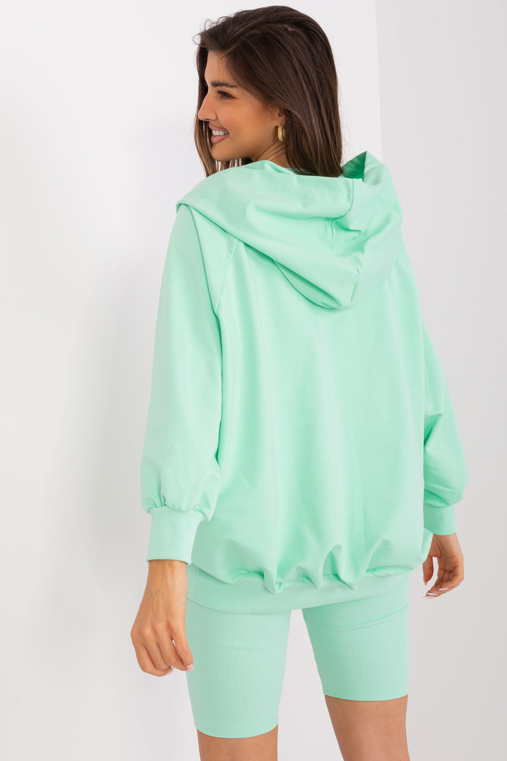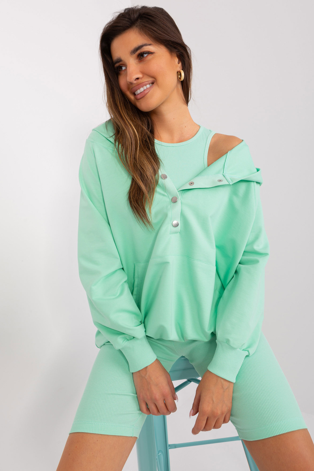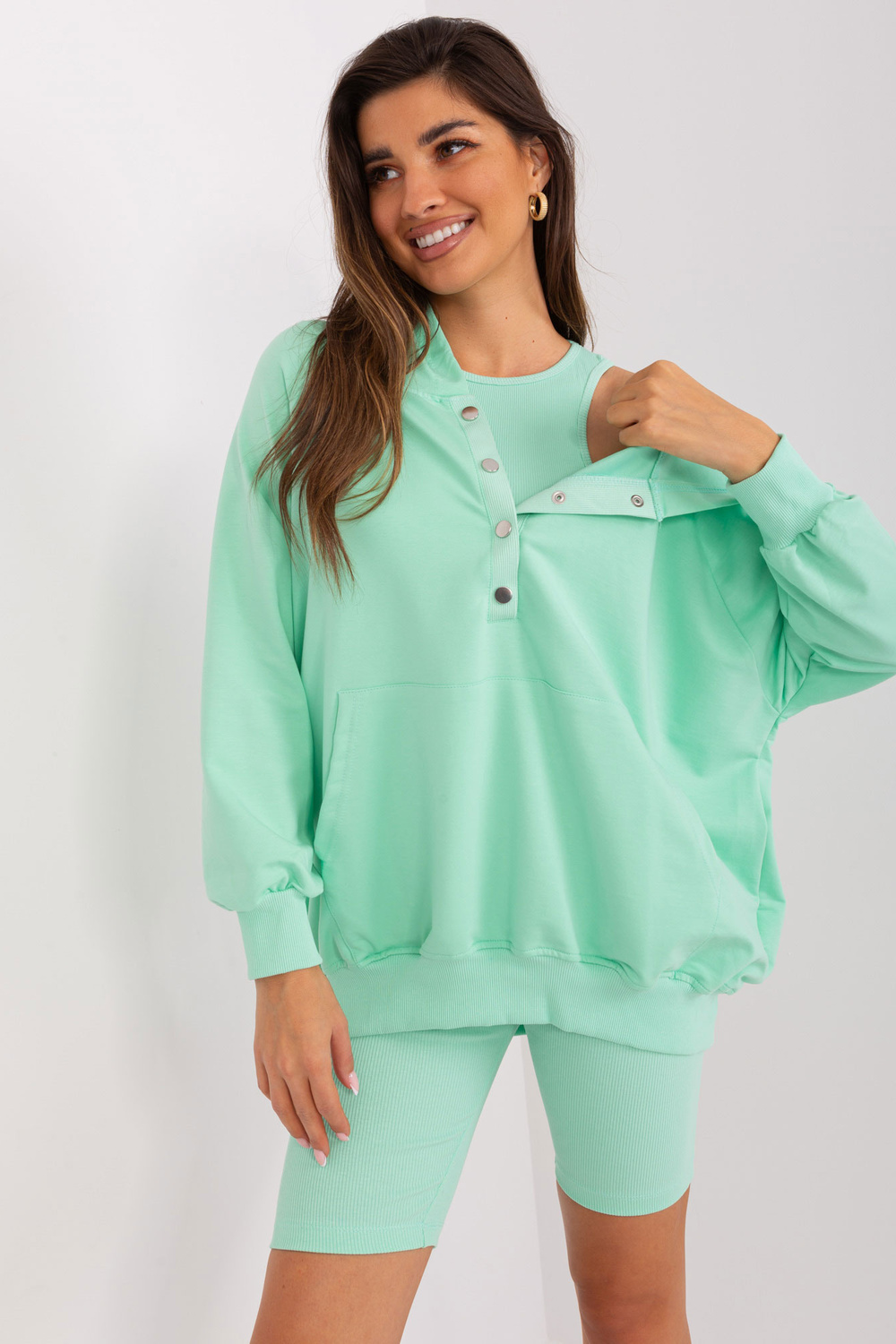 Rozměry kompletu ve velikosti one size, měřeno naplocho: šířka mikiny pod paže - 65 cm, délka rukávu - 59 cm, délka mikiny - 63 cm, šířka podpaží - 29 cm, délka topu - 42 cm, šířka pasu - 29 cm, délka motorkáře - 47 cm.