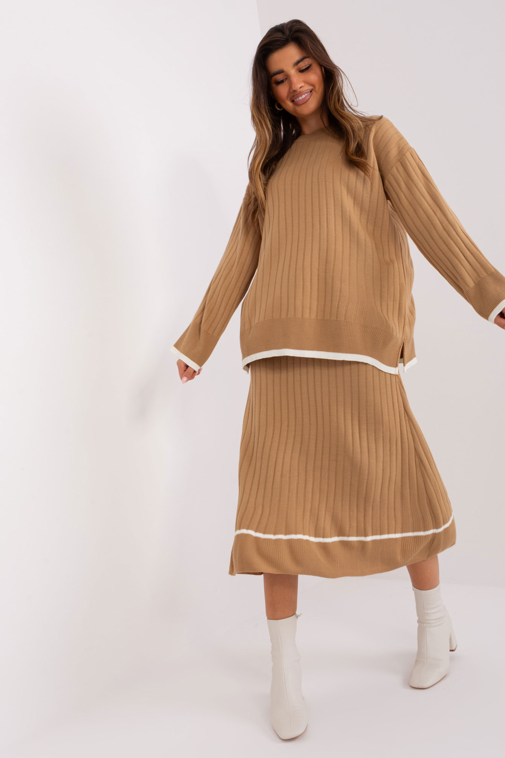 Rozměry kompletu ve velikosti one size, měřeno naplocho: šířka pod pažemi - 56 cm, délka rukávu - 58 cm, délka svetru - 66 cm, šířka pasu - 30 cm, délka sukně - 82 cm.