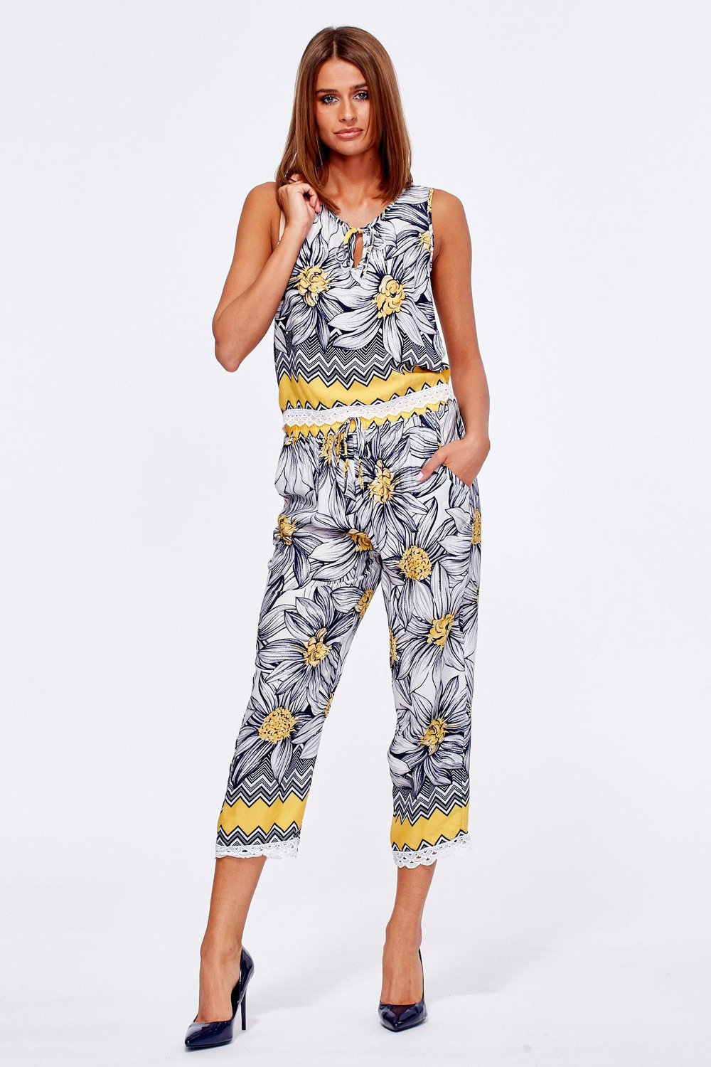 Sada s barevnými vzory, tmavě modrý a žlutý top a kalhoty .