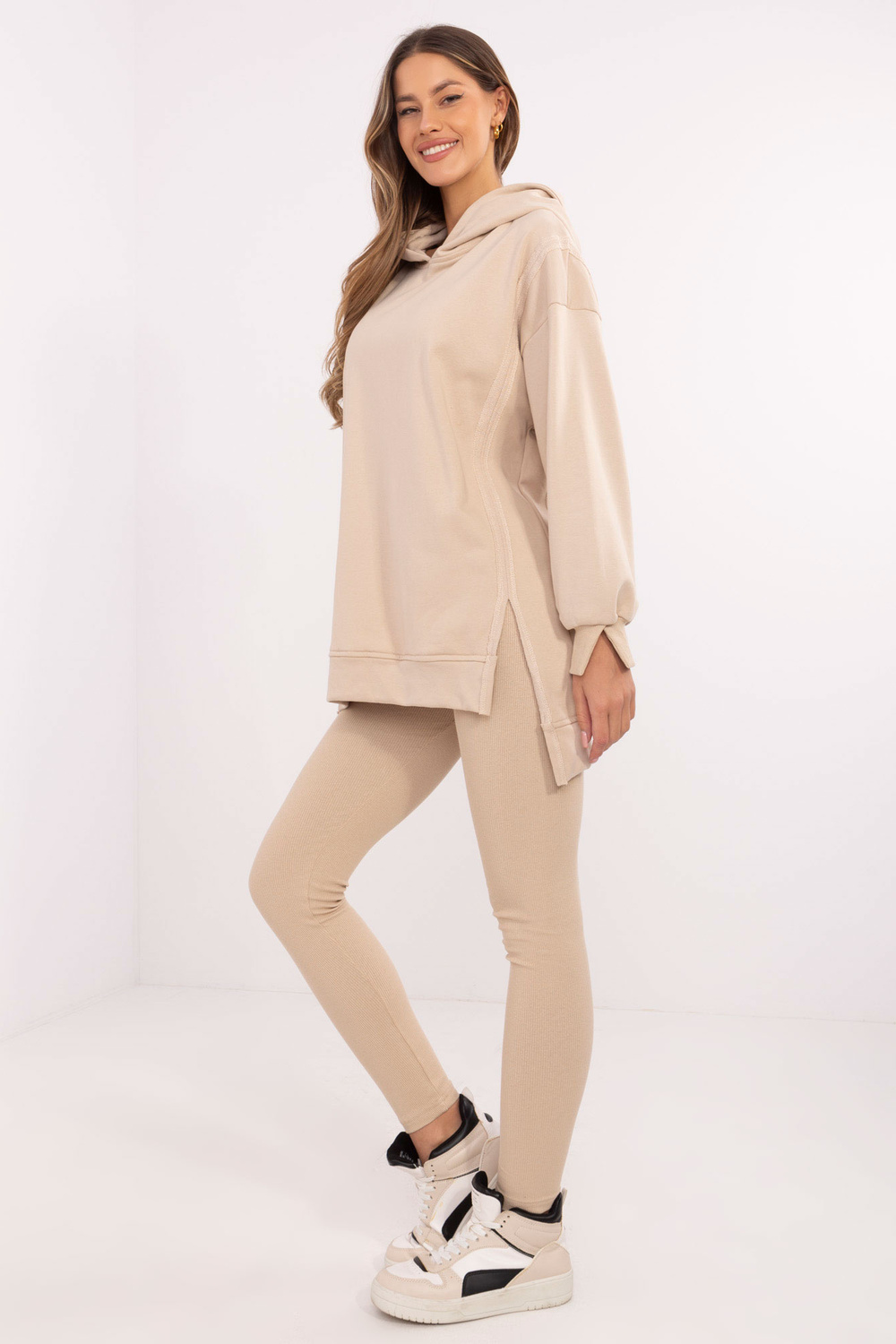 složení materiálu mikiny: 70 % bavlna, 30 % polyester; materiálové složení legín: 90% bavlna, 10% elastan