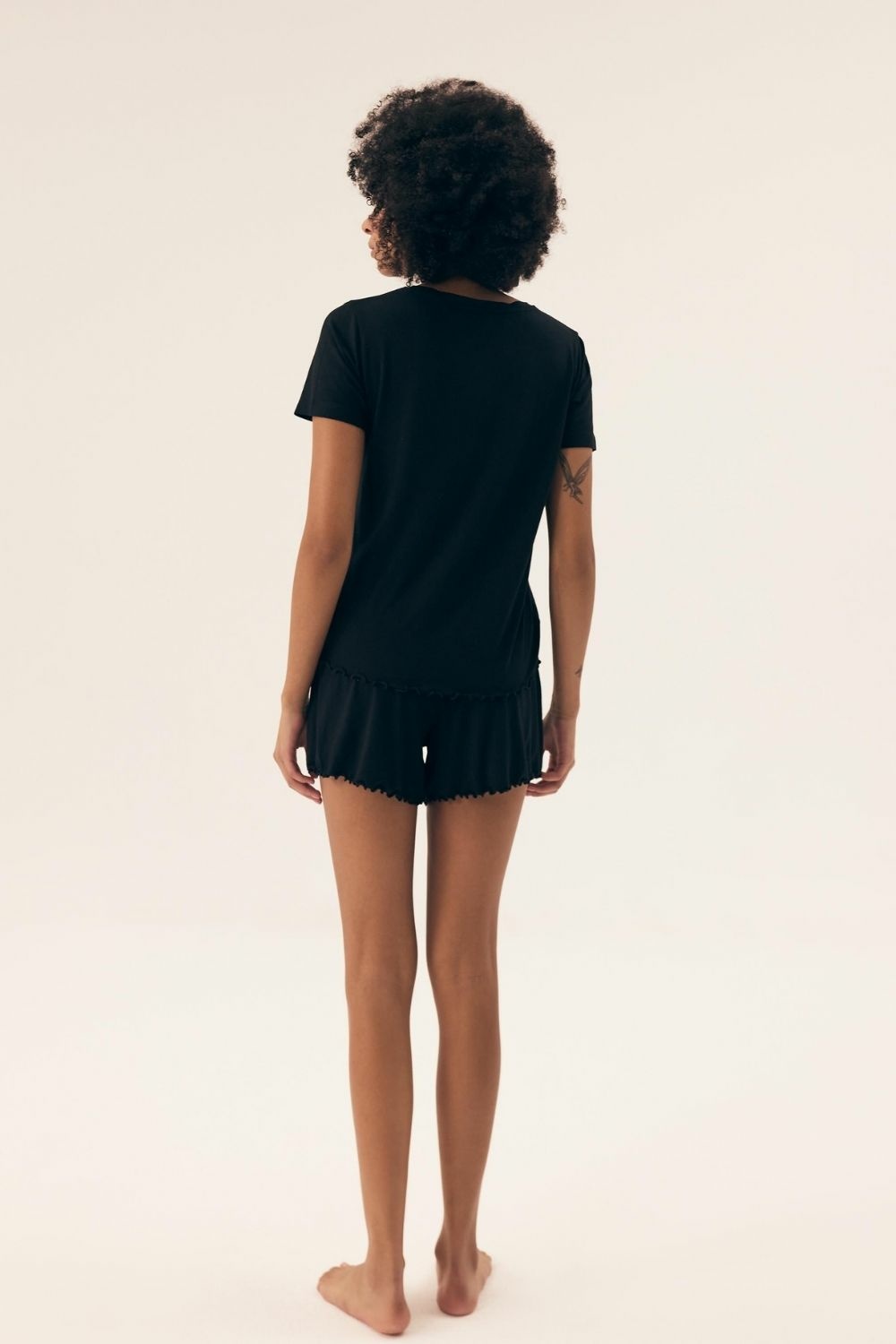 Stylish women's pajamas, made of delicate Viskóza, providing comfortable sleep throughout the night. The short-sleeved top with a V-neckline, decorated with subtle lace at the bottom, perfectly complements the shorts, which have a wide elastic waistband for even greater comfort. The smooth Materiál: makes the pajamas pleasant to the touch, perfect for warm nights. The product is packed in a practical plastic bag, also excellent for a gift.