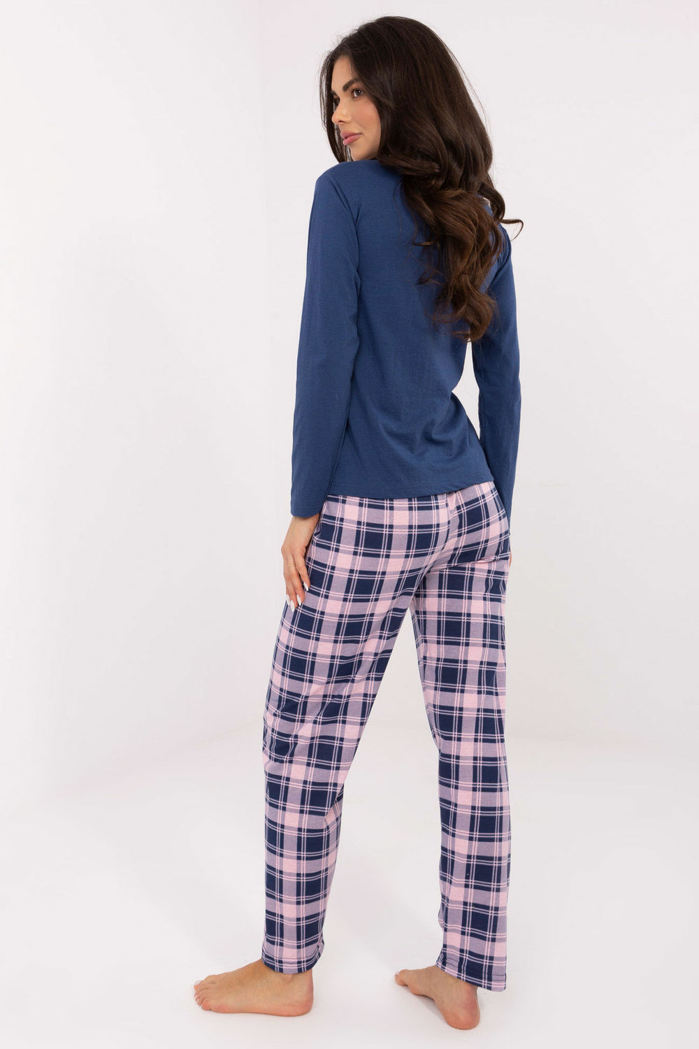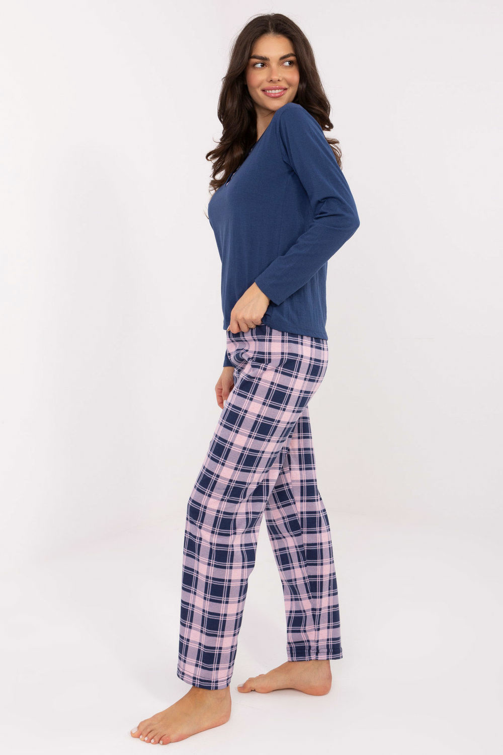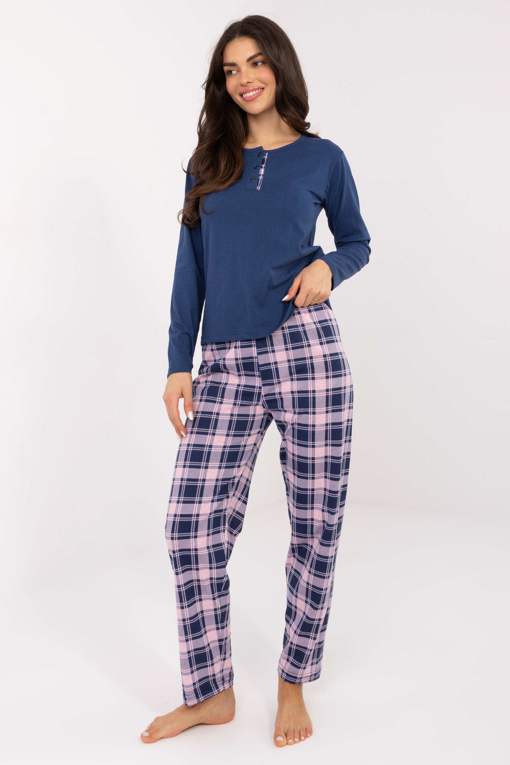 Women's pajamas are a comfortable, two-piece set consisting of a halenka and pants. The halenka has a round neckline, long sleeves, and three buttons on the front, which add a subtle, decorative accent. The pants with long, straight legs stand out with a dominant check pattern, giving the whole a classic and elegant character. The loose fit provides full freedom of movement and comfort during sleep and relaxation at home. It is an ideal proposition for women who appreciate comfort, functional cut, and stylish, timeless design.