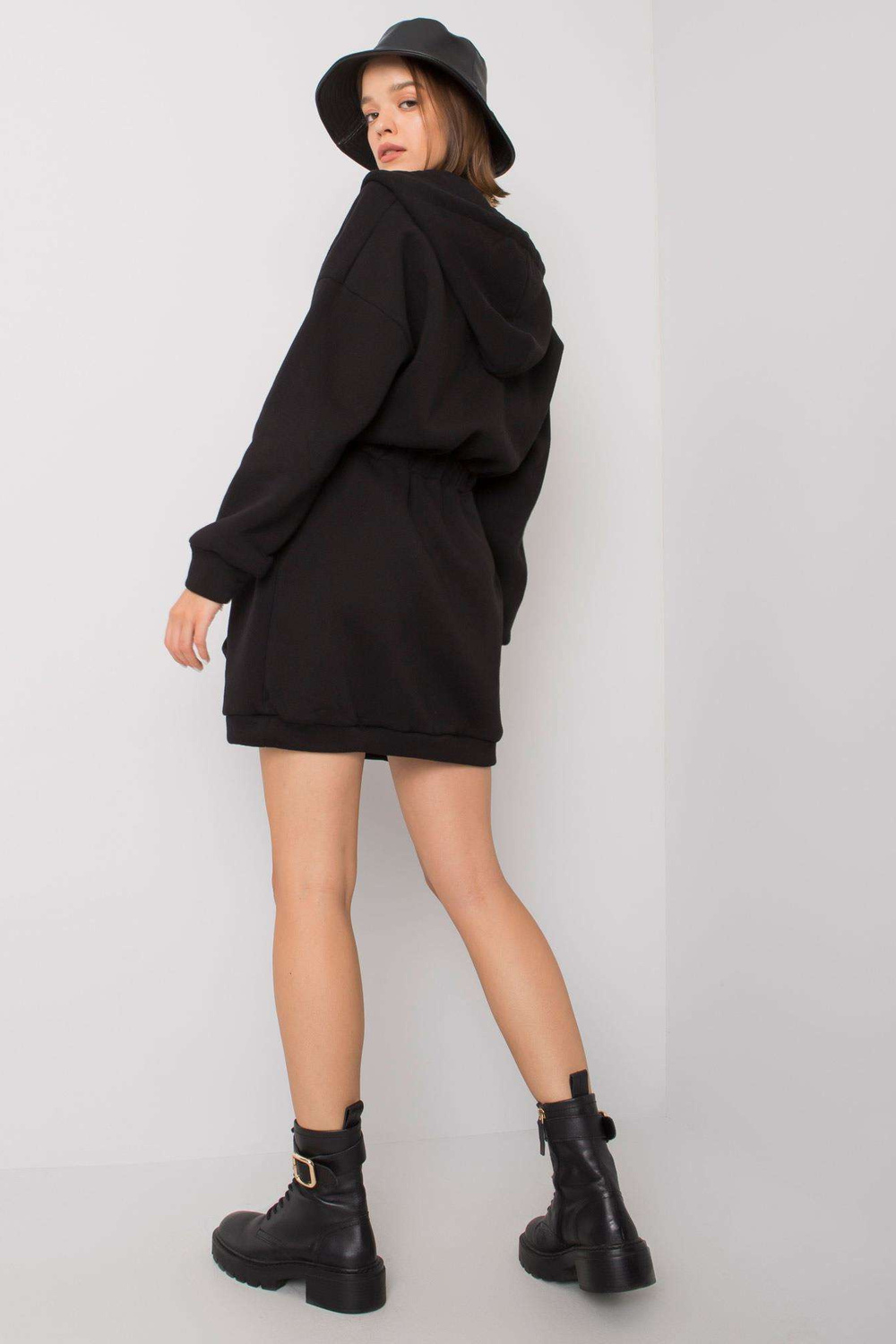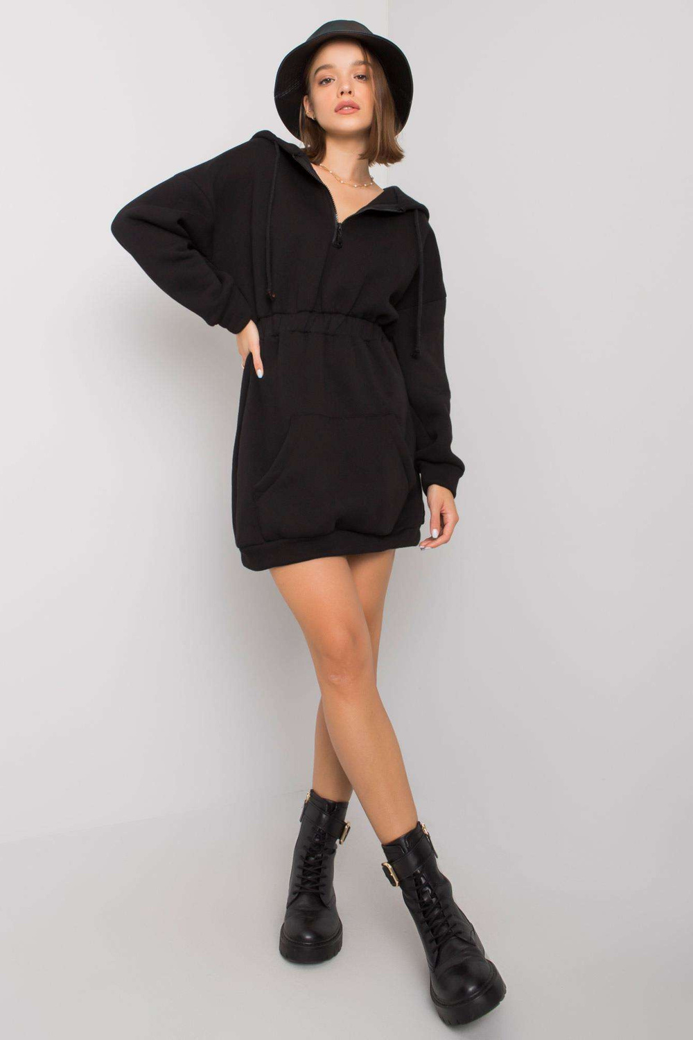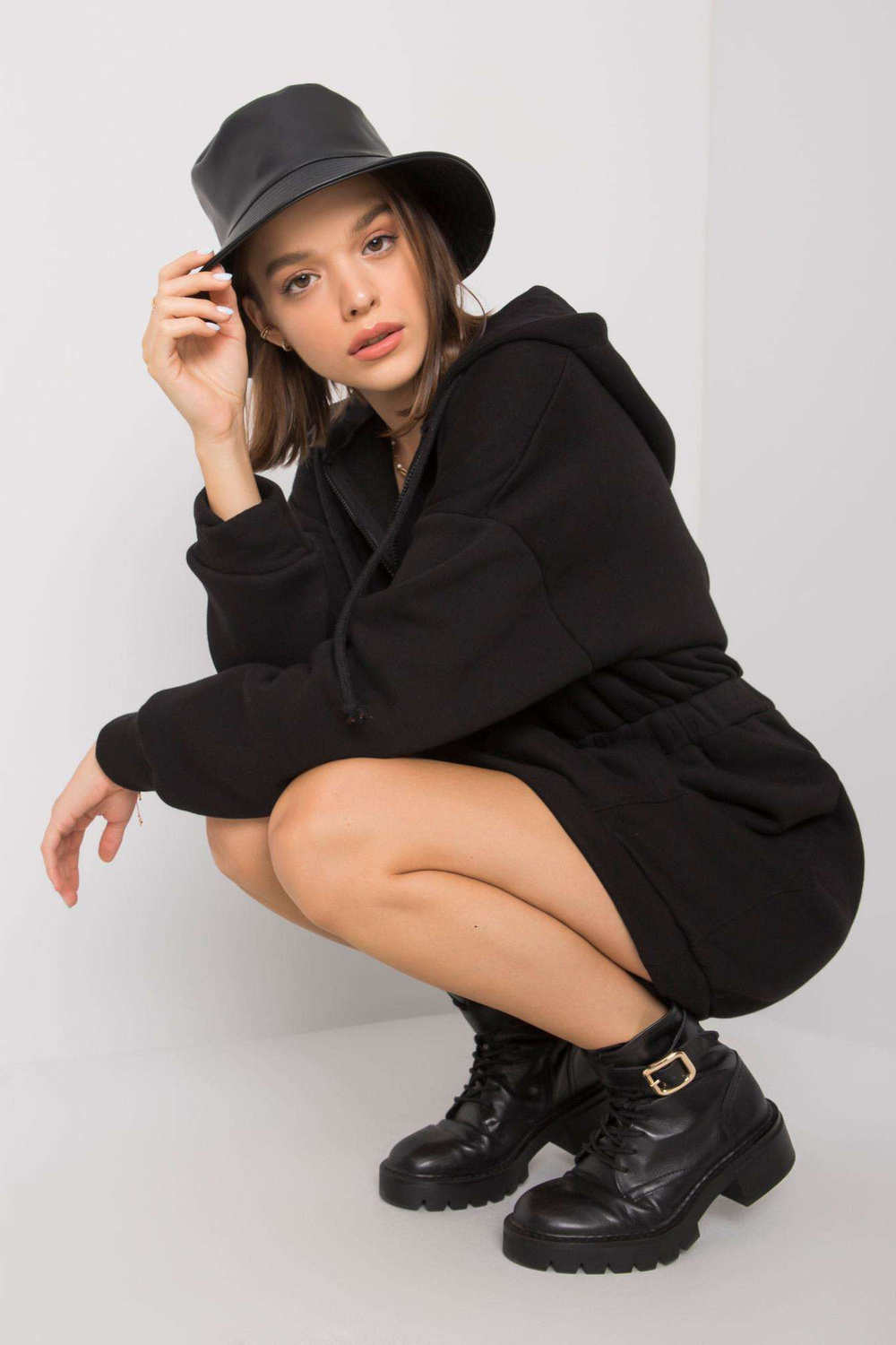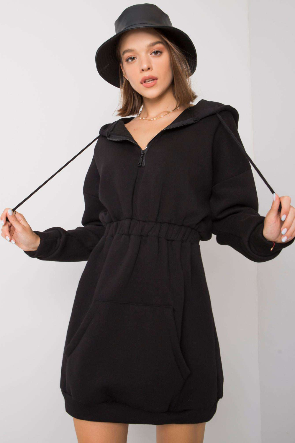 Černé mikinové šaty s kapucí Skyla. Složení materiálu: bavlna způsob praní: praní v pračce na 30°C Modelka má na sobě velikost S/M. Rozměry modelu: výška 169 cm, prsa 90 cm, pas 60 cm, boky 84 cm. Rozměry šatů ve velikosti S/M měřené naplocho: