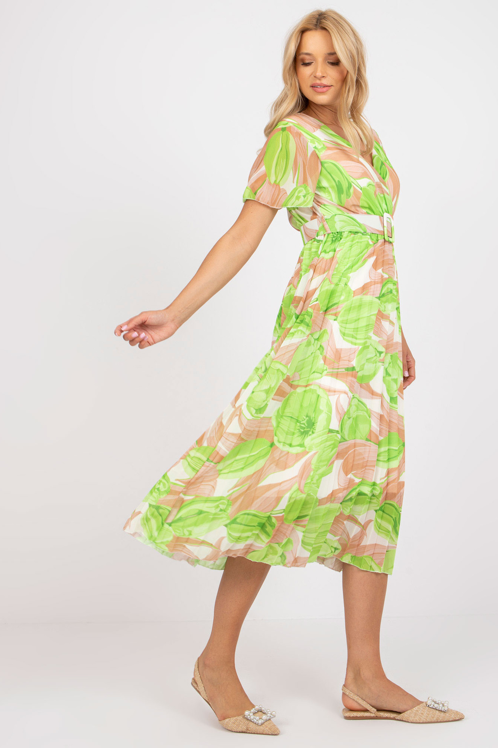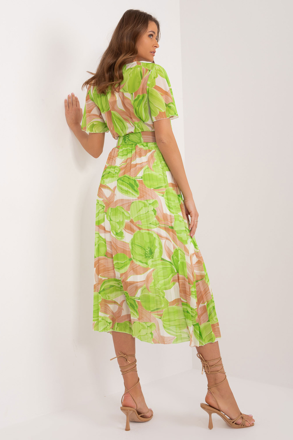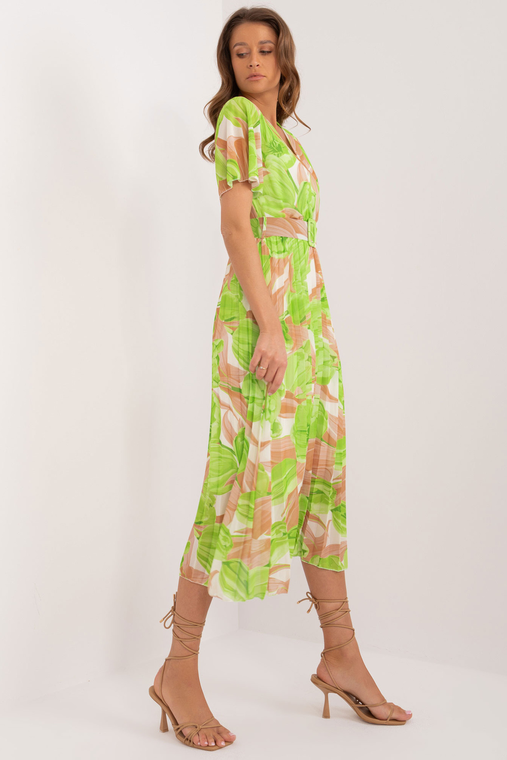 Béžové a zelené midi šaty jedné velikosti s řasením.