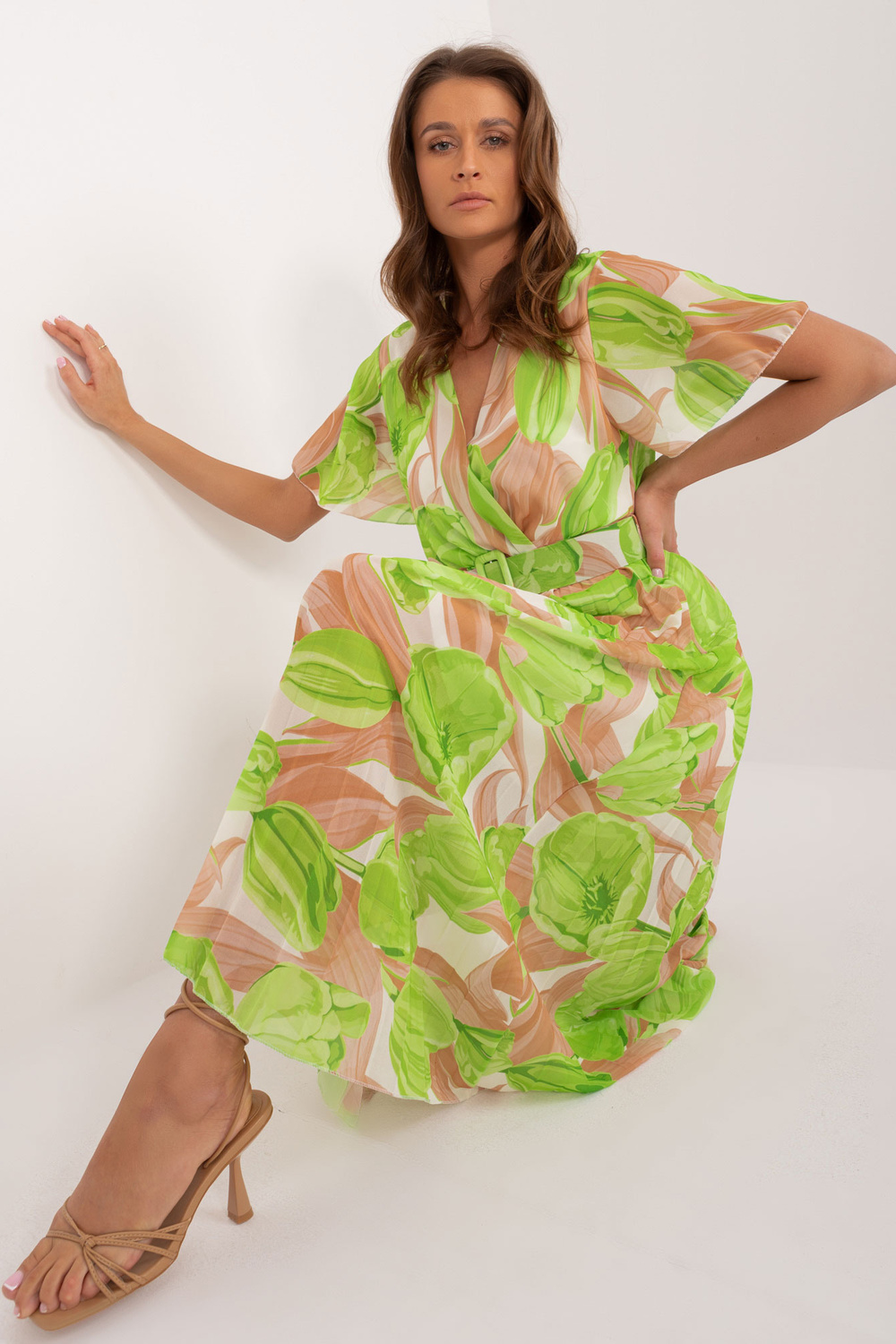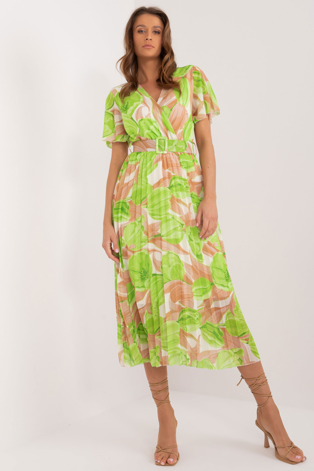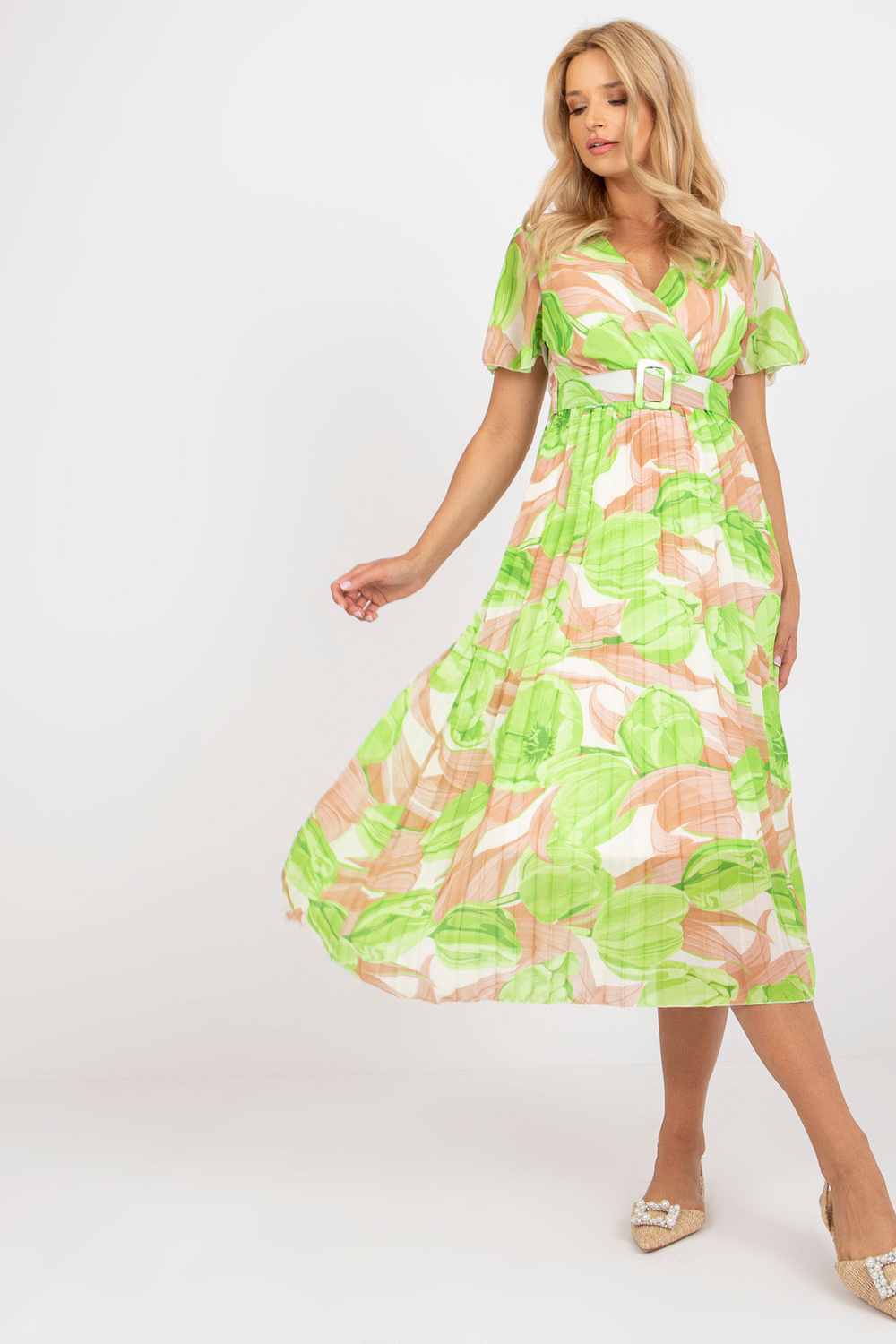 Béžové a zelené midi šaty jedné velikosti s řasením.