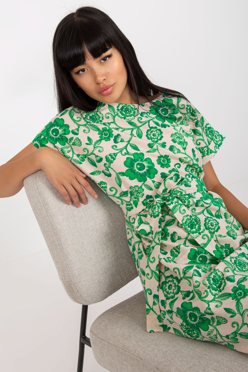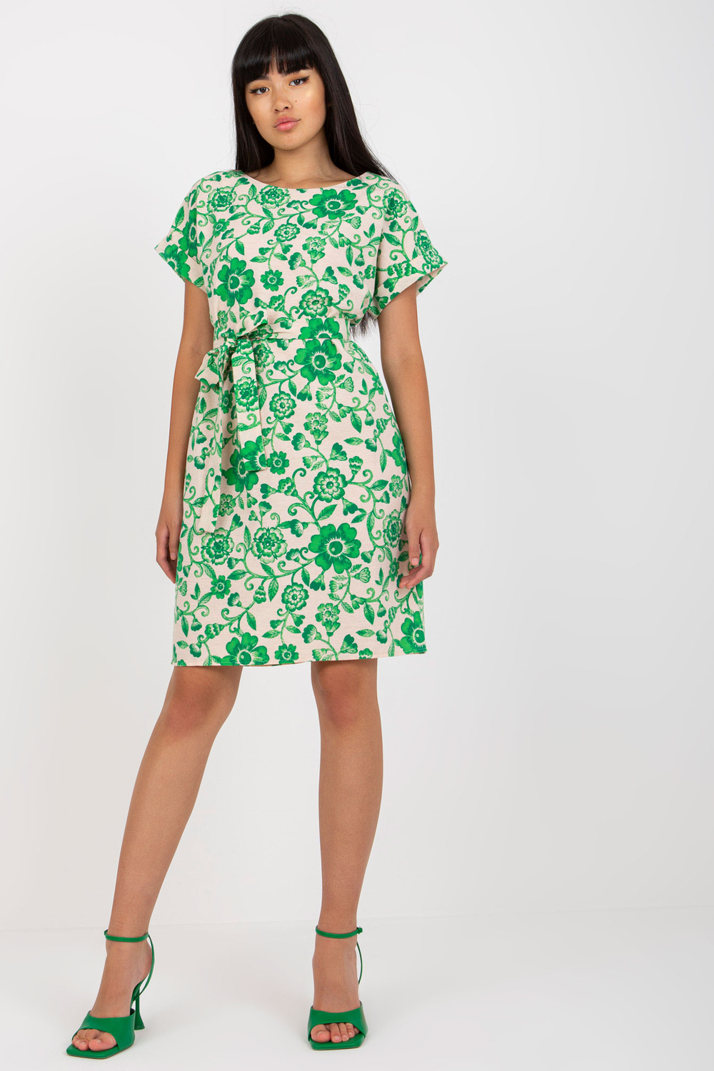 Béžové a zelené plátěné šaty s květinami ke kolenům.