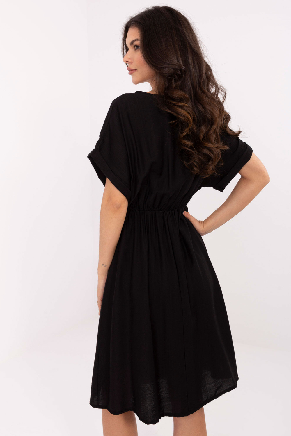 Míry šatů v jedné velikosti: šířka v podpaží - 52 cm, šířka pasu - 33 cm (ploché), šířka pasu - 59 cm (po natažení), délka rukávu - 27 cm, šířka boků - 63 cm, celková délka - 106 cm.