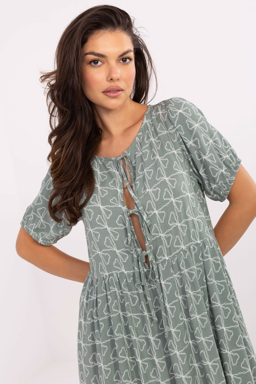 Modelka nosí velikost S. Rozměry modelky: výška 173 cm, prsa 89 cm, pas 65 cm, boky 91 cm.