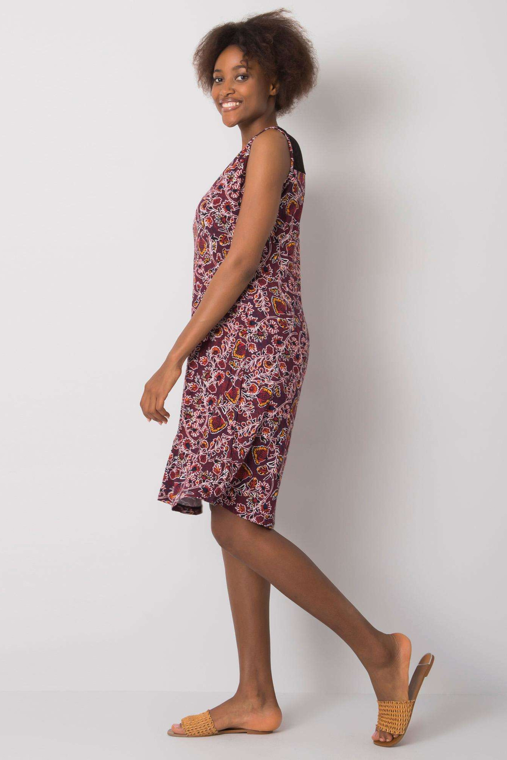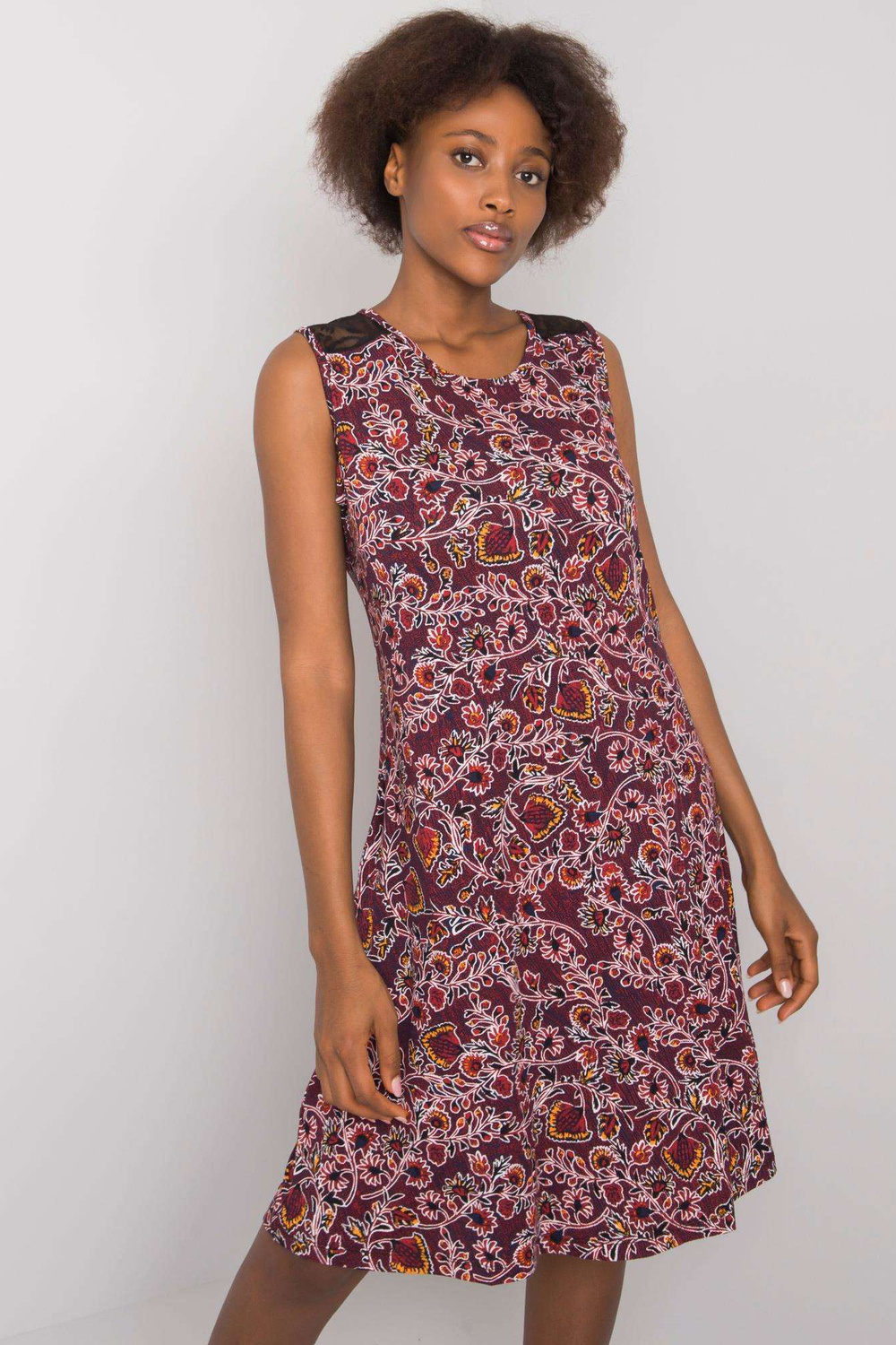 Burgundské vzorované dámské šaty.