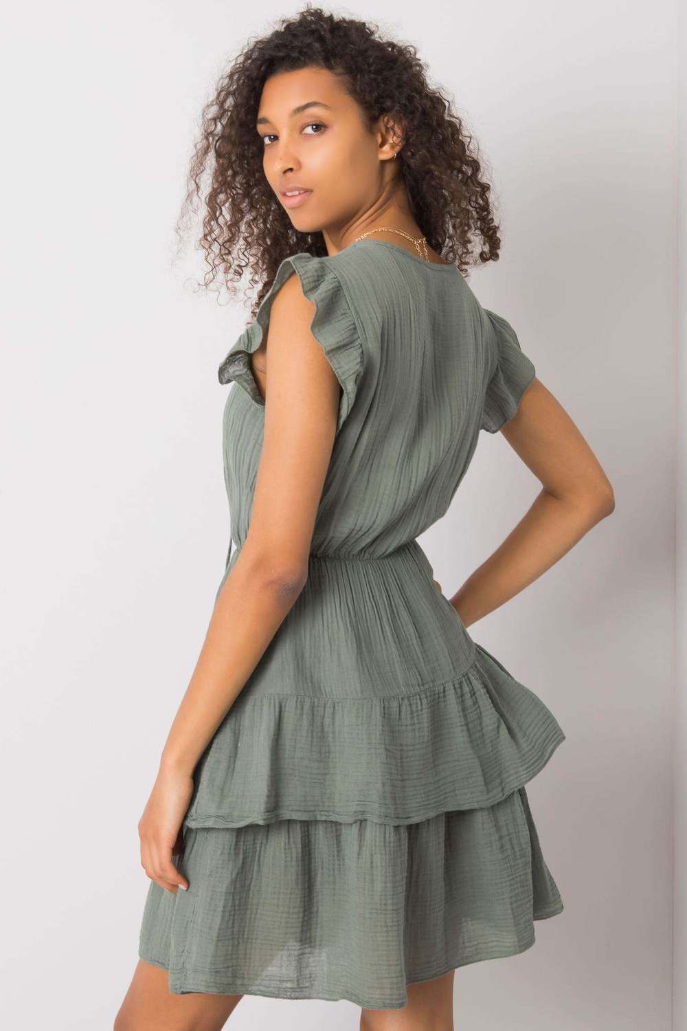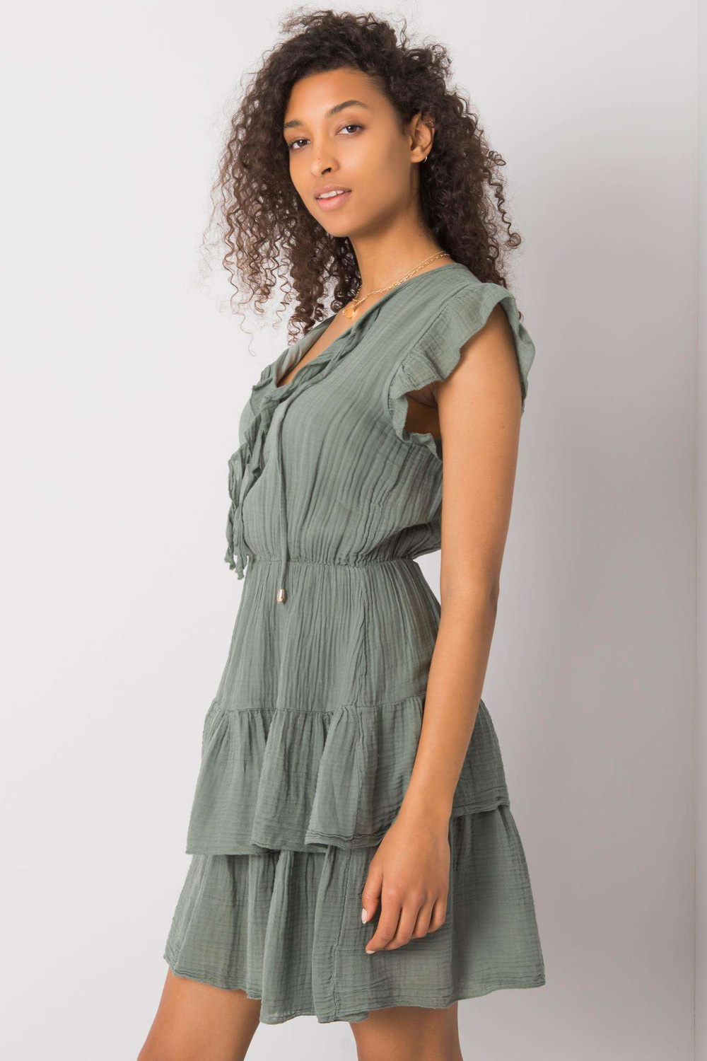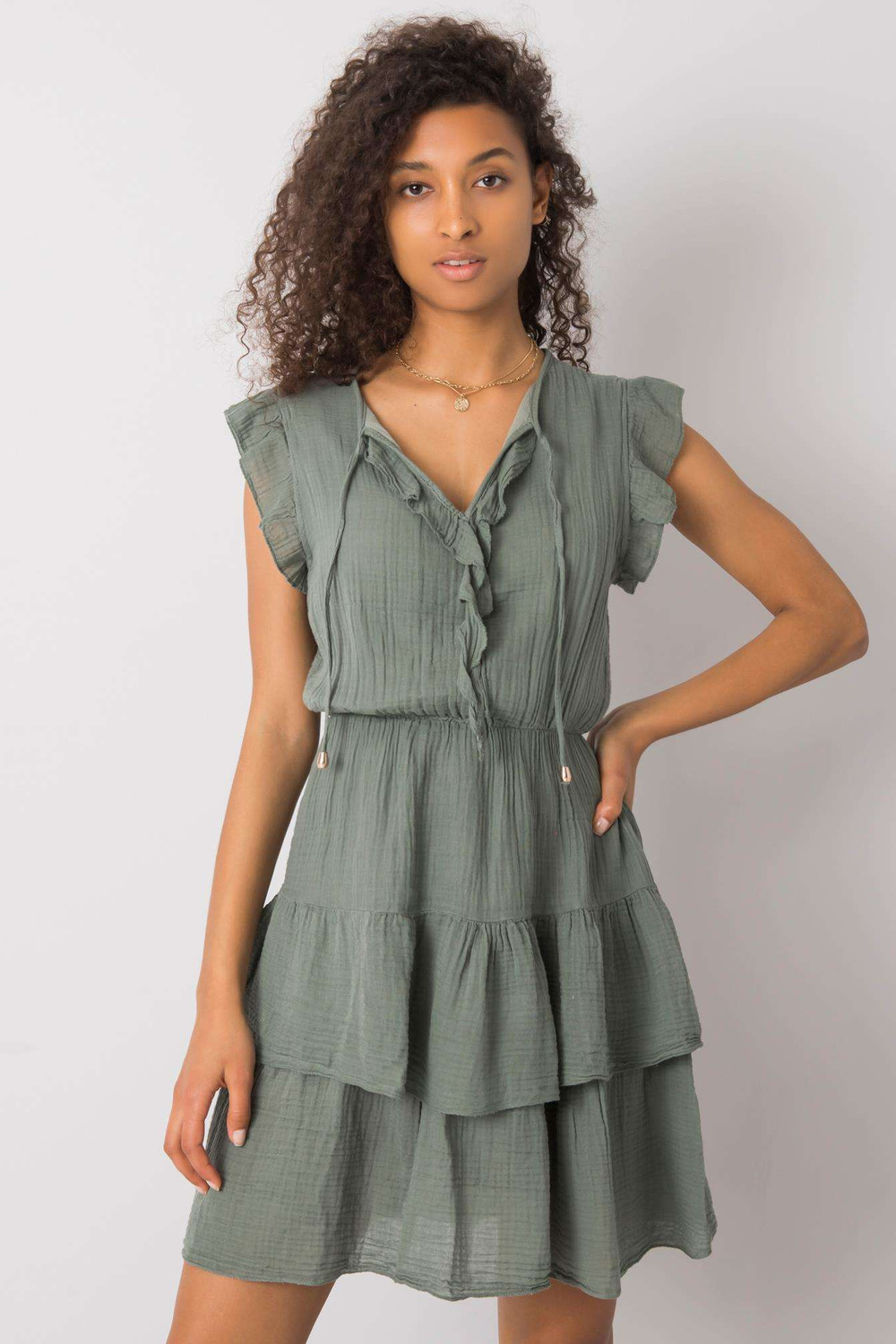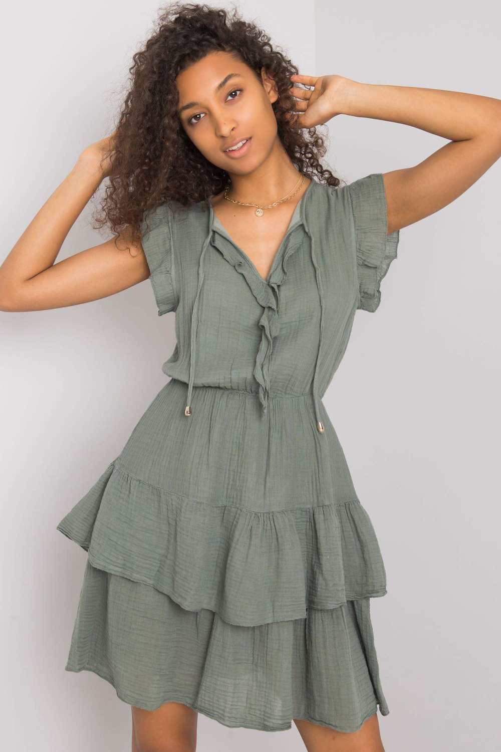 OCH BELLA lehké šaty v barvě khaki s řasením.
