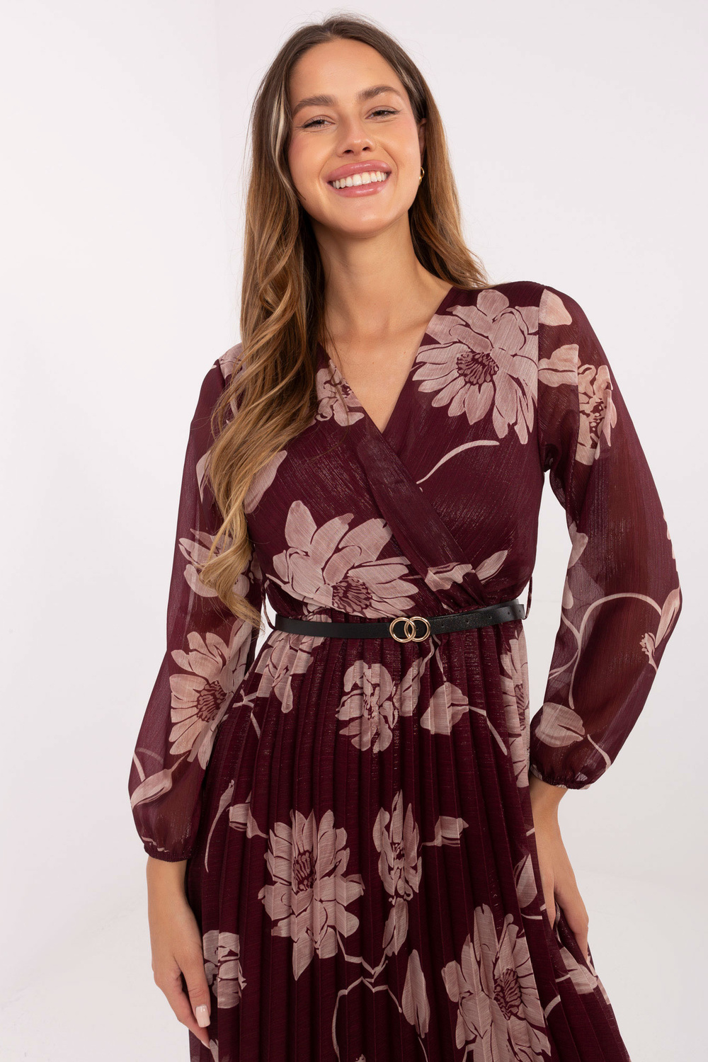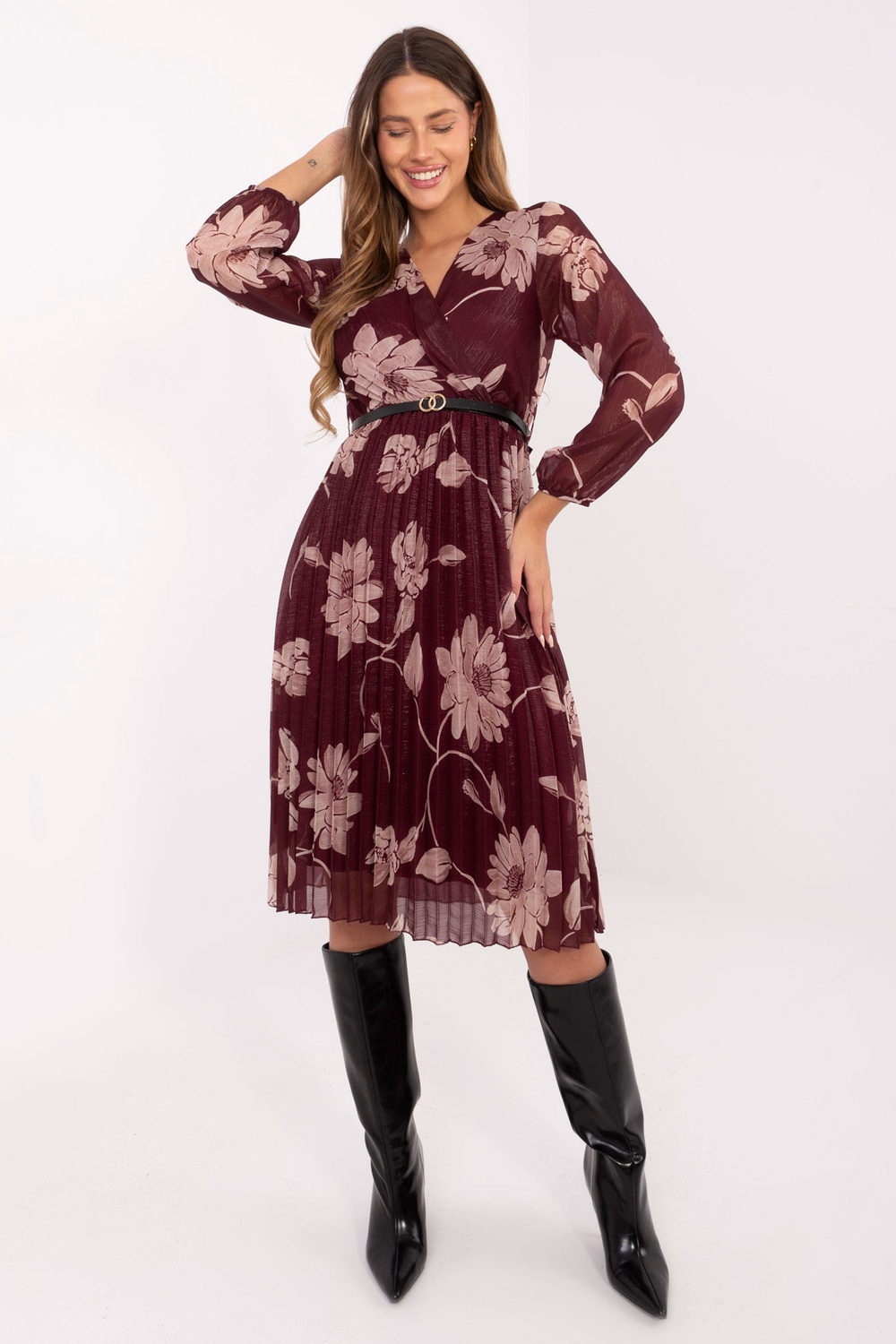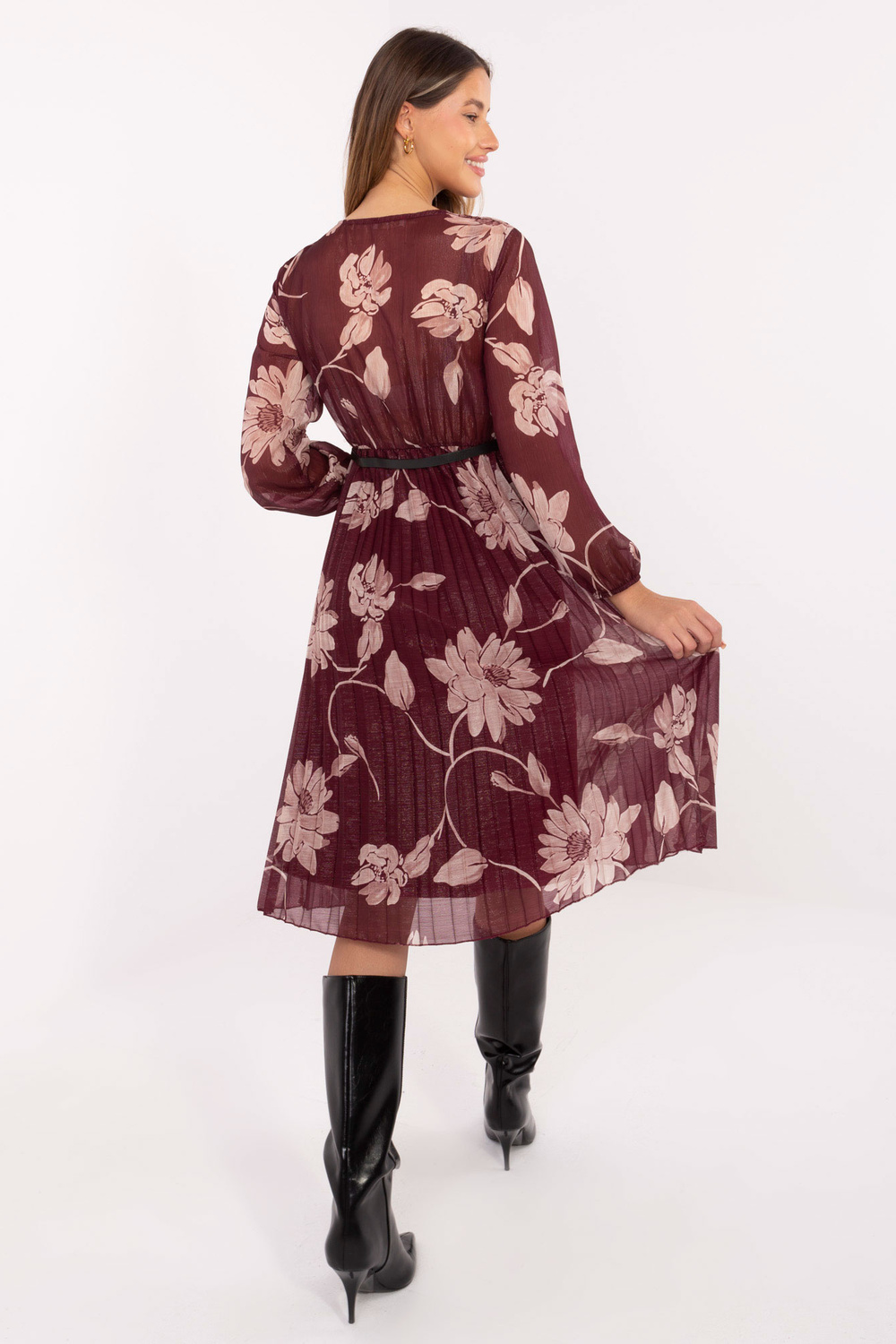 Model nosí oděv jedné velikosti. Rozměry modelky: výška 176 cm, obvod hrudníku 90 cm, pas 62 cm, boky 94 cm.