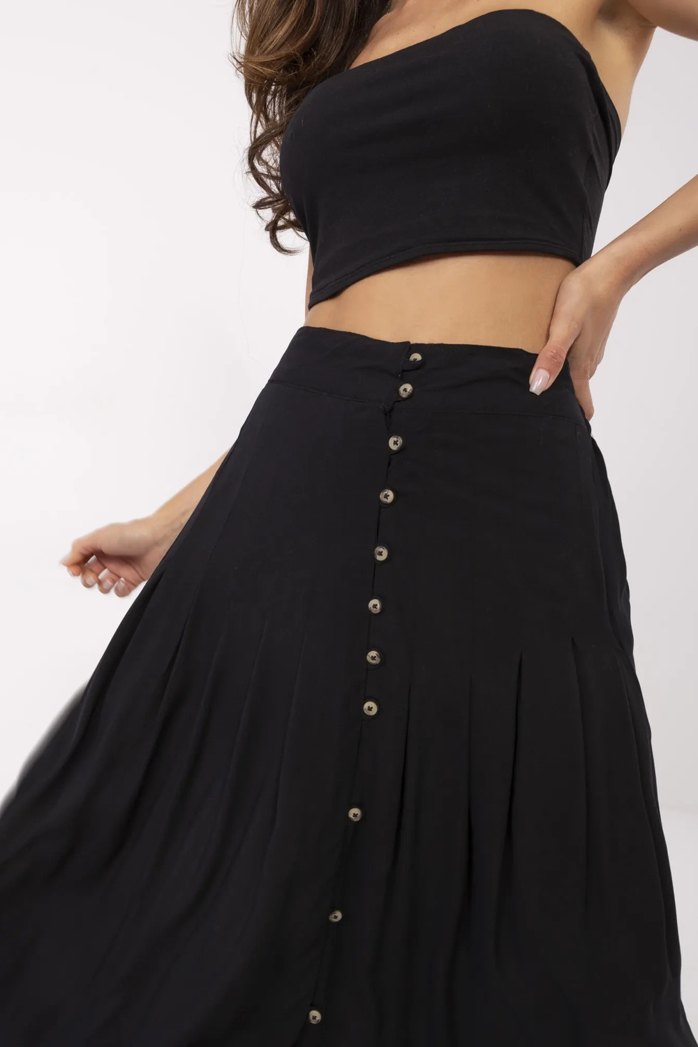 Míry sukně ve velikosti S měřeno v ploché poloze: šířka pasu - 35 cm (v ploché poloze), šířka pasu - 39 cm (po natažení), šířka boků - 66 cm, celková délka - 87 cm.