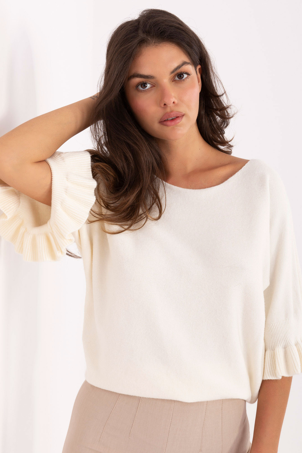 Rozměry svetru v univerzální velikosti, měřeno na plocho: šířka pod paží - 58 cm, délka rukávu - 44 cm, celková délka - 63 cm, šířka v oblasti boků - 43 cm.