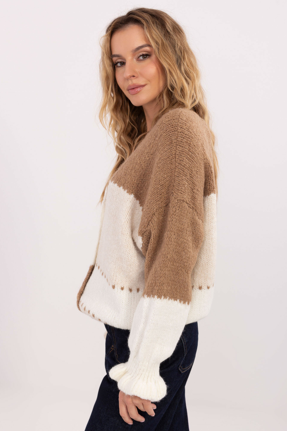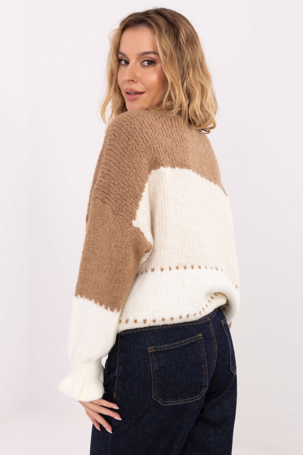 Rozměry svetru v jedné velikosti měřené natažené: šířka podpaží - 67 cm, délka rukávu - 42 cm (od švu), šířka přes boky - 55 cm, šířka v pase - 39 cm, celková délka - 64 cm.