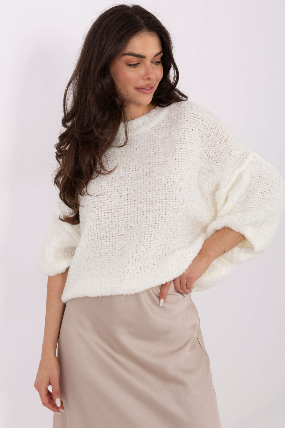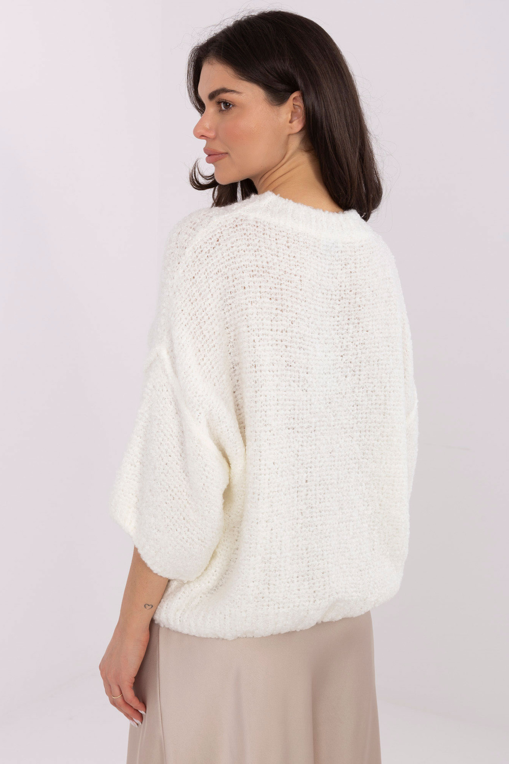 Rozměry svetru ve velikosti one size, měřeno vleže: šířka pod pažemi – 62 cm, délka rukávu – 24 cm (od švu), šířka v bocích – 54 cm, celková délka – 55 cm.