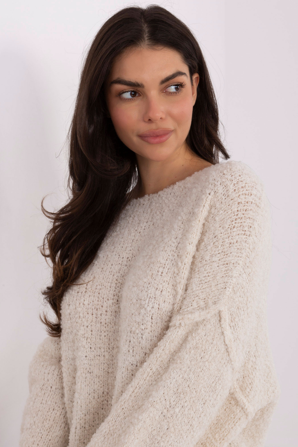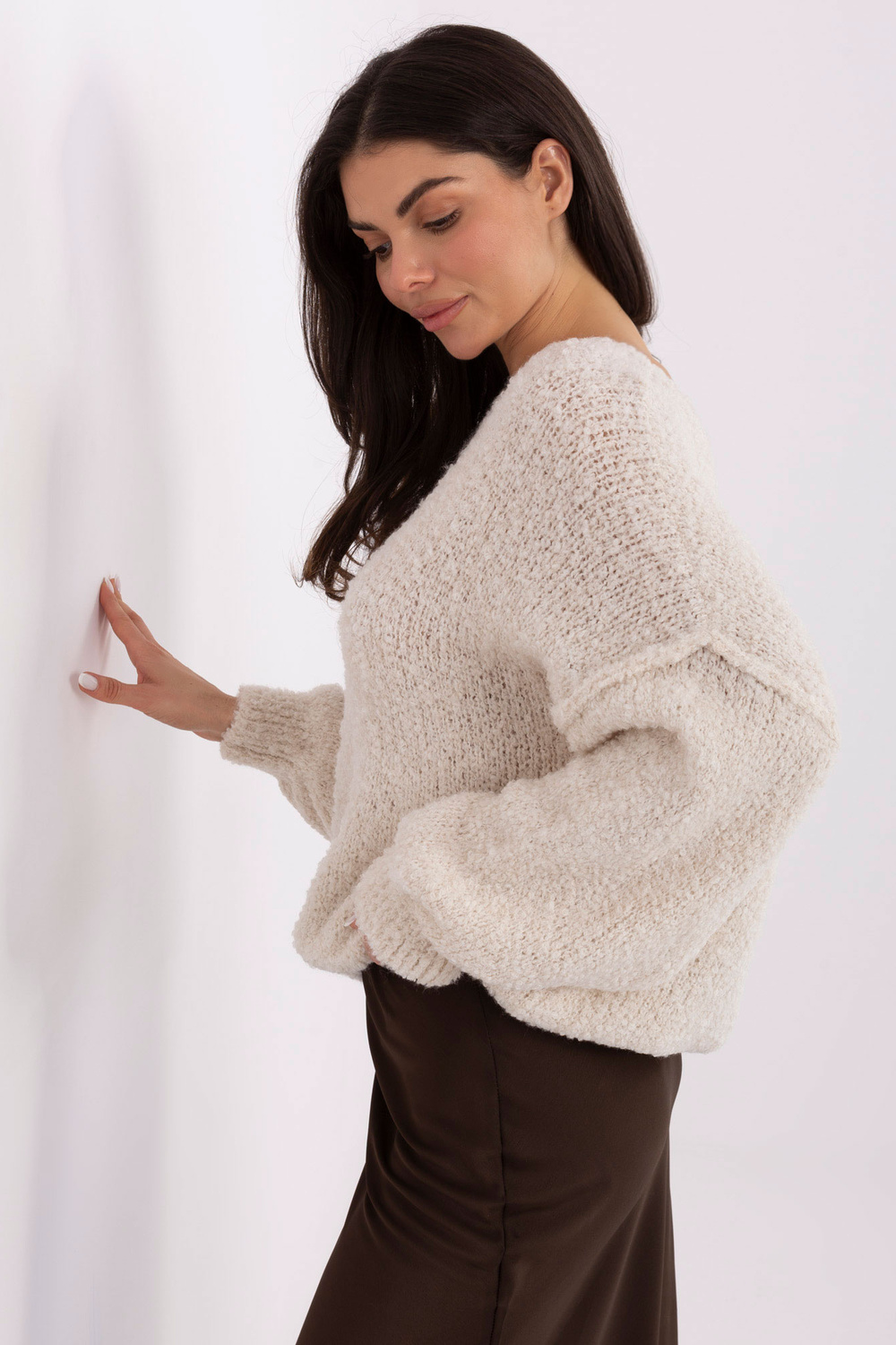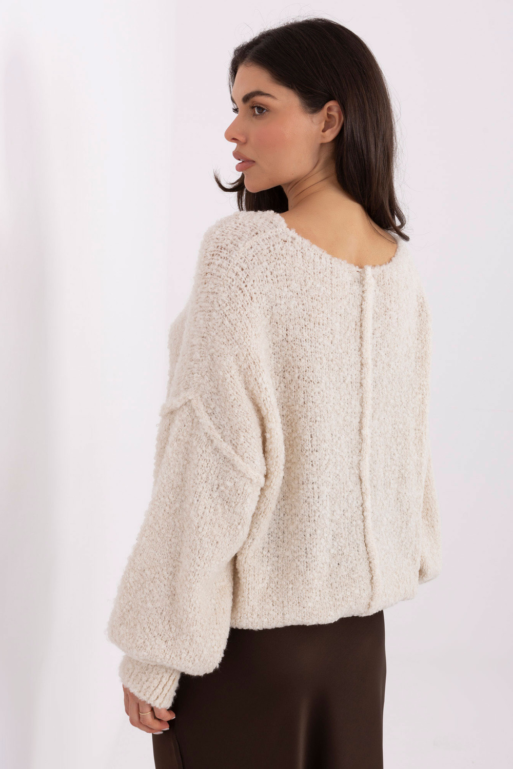 Rozměry svetru ve velikosti one size, měřeno na rovno: šířka pod pažemi – 73 cm, celková délka – 61 cm, délka rukávu – 46 cm (od švu), šířka přes boky – 58 cm.