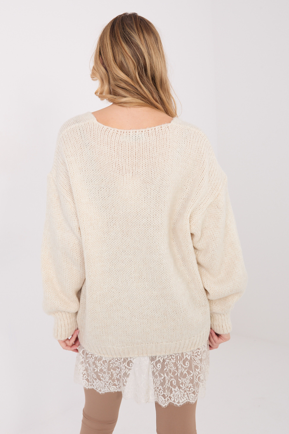 Rozměry svetr jedné velikosti: šířka pod pažemi – 61 cm, celková délka – 81 cm, délka rukávu – 54 cm (od švu), šířka přes boky – 53 cm.